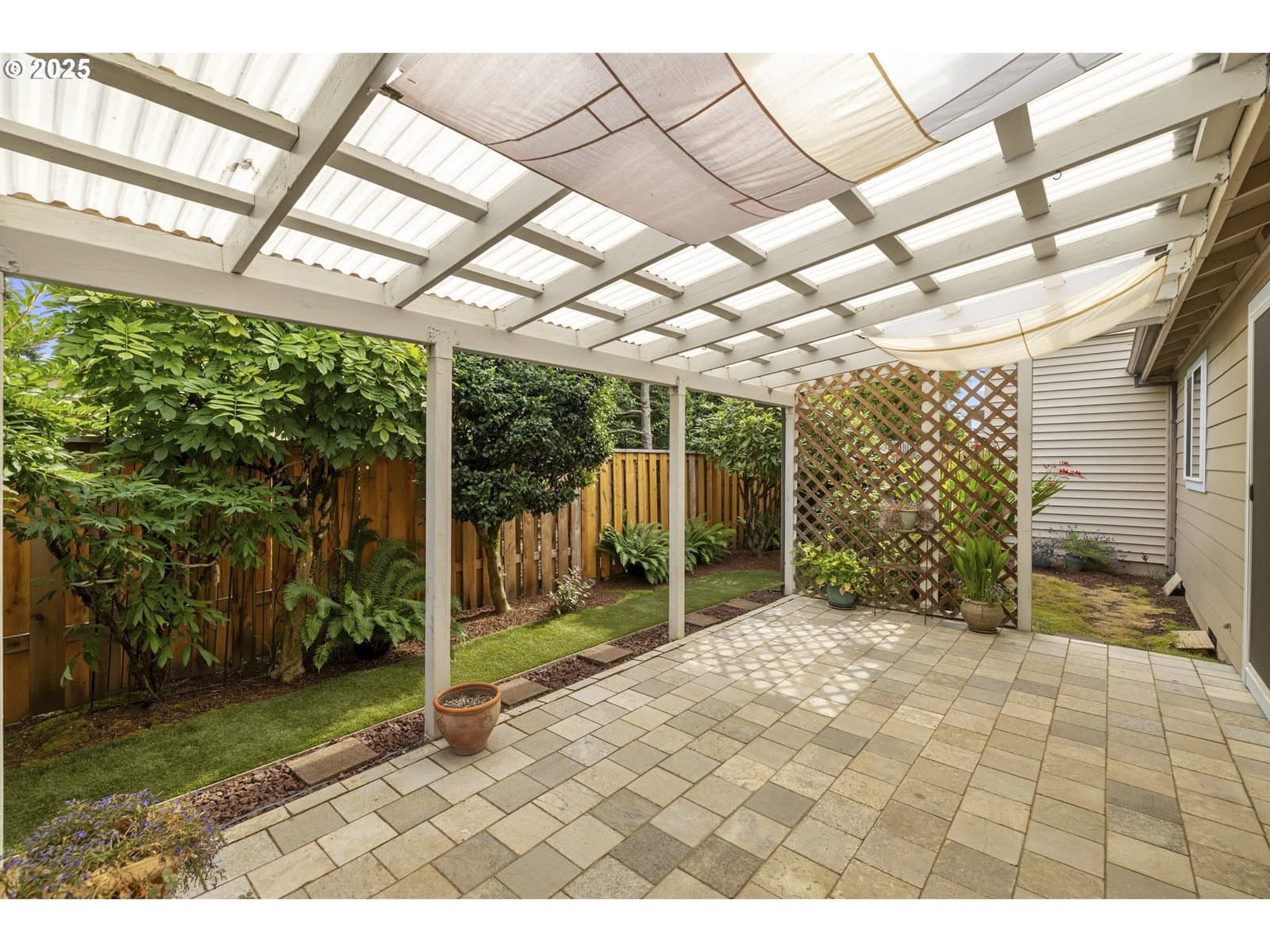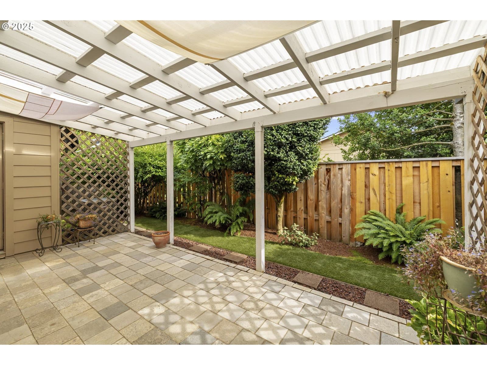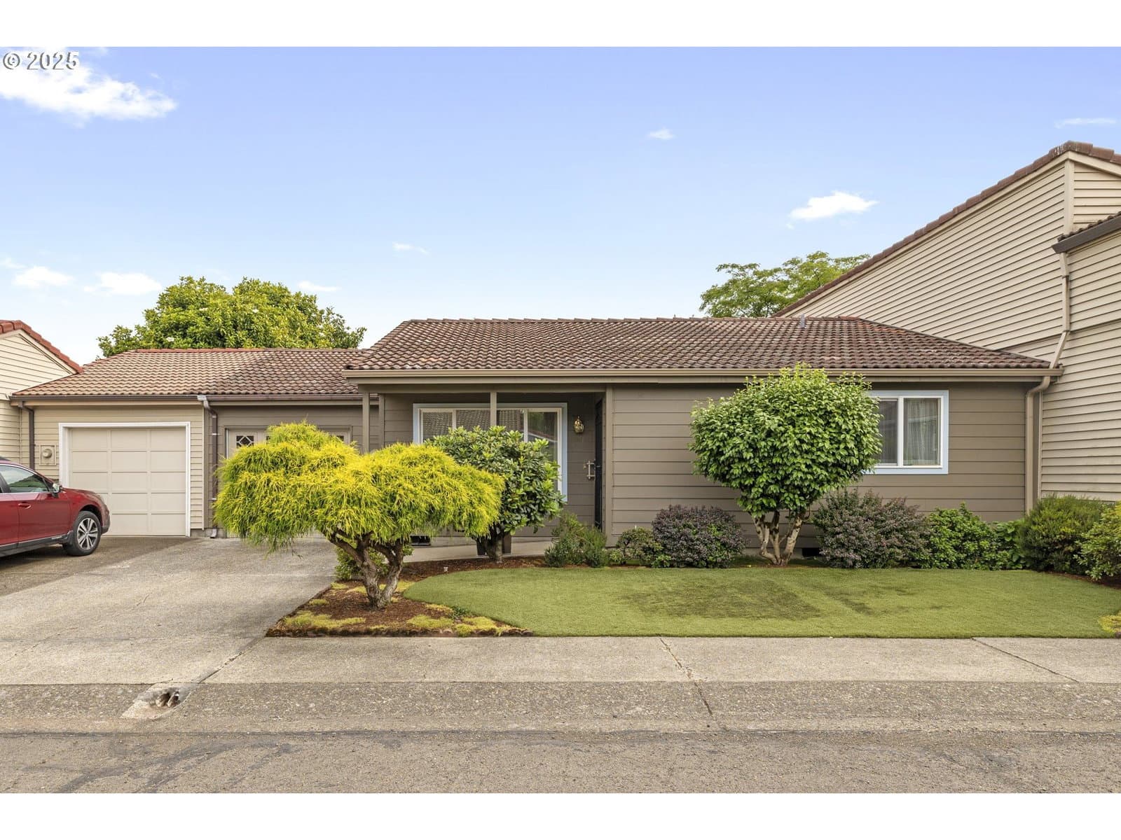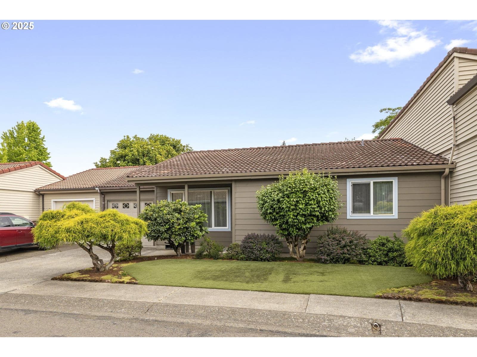 Lovingly maintained, this welcoming single-level home offers serene living in the Crestview Manor 55+ community. Enjoy peace of mind with the comfort and privacy provided by its location nestled between common wall neighbors. From the charming porch, the interior opens to a vaulted great room awash in natural light. The bright dining area which adjoins offers a meditative site for meals overlooking the covered patio. Beautifully finished with elegant marble pavers, installed around 2010, the patio offers a lush setting for enjoying the beauty of the seasons. The yard is also designed for low-maintenance with year-round greenery thanks to artificial turf. Thoughtful finishes extend inside as well, including sliding shelves in the kitchen and bathroom for convenient access and the added accessibility of a higher commode and walk-in shower. Subtle touches, like hooks around the bedroom and living room windows, make it easy to add seasonal lighting. The extra-deep garage features built-in storage for dedicated shop or hobby space while the electric car charging station provides an environment-friendly update for energy conscious living. Combining functionality with ease of maintenance, along with the convenient location near shops and services, this beautiful residence awaits to welcome a new homeowner appreciative of its warmth and thoughtful finishes. Garage door replaced in Feb 2018; garbage disposal replaced Sept 2018; Patio roof replaced Dec 2018. $1000 Transfer fee for new owners.