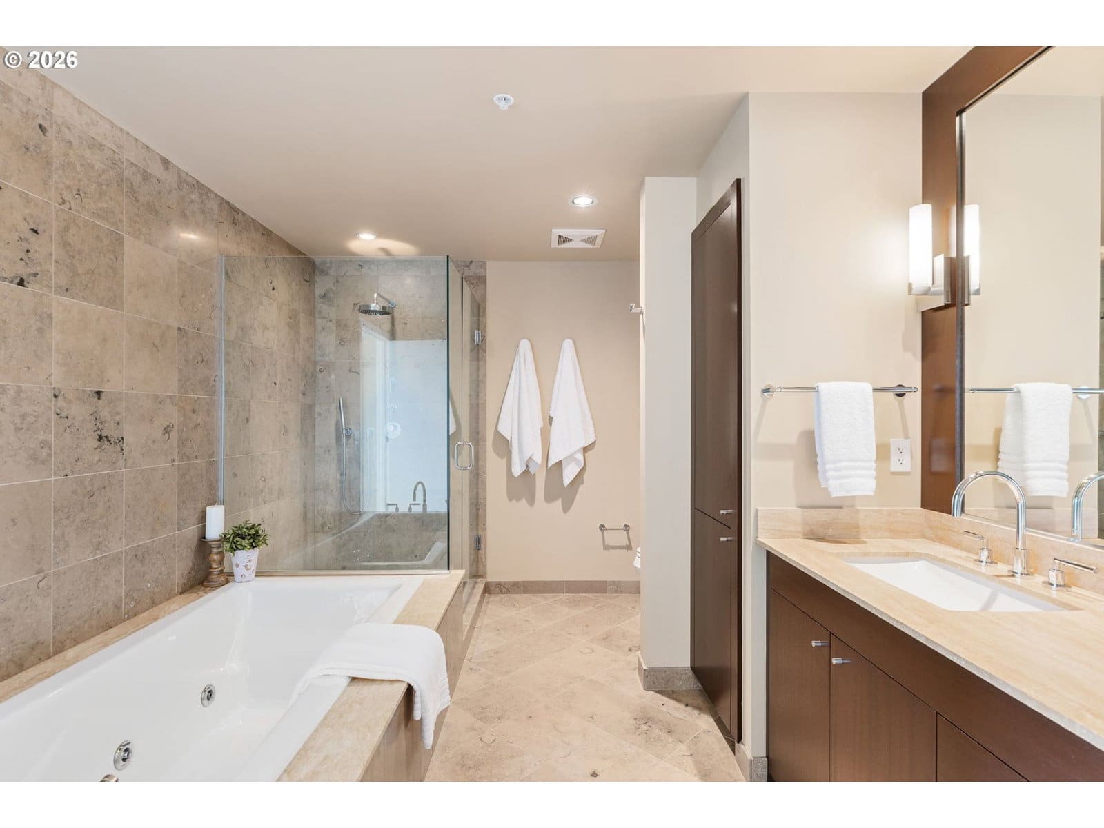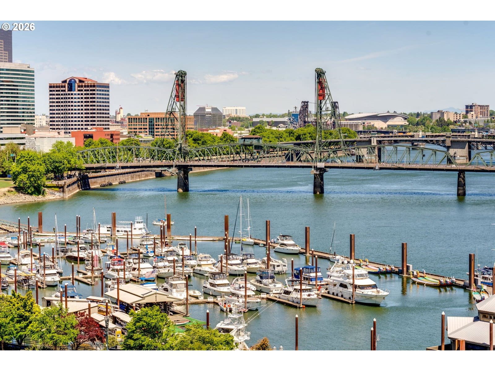 **BEST PRICED JR PENTHOUSE on the PORTLAND WATERFRONT** Elevated Waterfront Living at The Strand's West Tower. This exceptional 10th-floor residence offers soaring ceilings, refined finishes, and panoramic views of the Willamette River, delivering a rare blend of Luxury, value, and location. Move-in ready and meticulously maintained as a pristine second home, this is a compelling opportunity to own one of the most desirable waterfront vantage points. A gracious foyer opens to an expansive open concept floor plan, where an eastern wall of windows floods the home with natural light and frames captivating river and cityscape views. Designed for elevated entertaining and everyday ease, the chef's kitchen features top-tier Thermador stainless steel appliances, a five-burner cooktop, a built-in refrigerator, wine storage, and granite countertops. The living area extends seamlessly to a private deck—perfect for taking in the river's rhythm below. The primary suite is a sophisticated retreat, offering a custom walk-in closet and a spa-inspired bath with travertine radiant heated floors, a jetted soaking tub, and a rain shower. Every detail reflects thoughtful Luxury, from hardwood floors and wool carpeting to surround sound, solar blinds, and plantation shutters. Additional features include secure deeded EV parking, dedicated storage, and full-service concierge living. Just steps from the riverfront path, bike trails, streetcar, dining, and Portland's cultural destinations, including Keller Auditorium and Oregon Health & Science University, this Jr. Penthouse embodies sophisticated comfort with unmatched convenience—an extraordinary offering in Portland. Capture the opportunity to make this one your own![Note the 10th floor is designated a Jr Penthouse with higher ceilings, finishes, and SS appliance package compared to other units on lower levels).