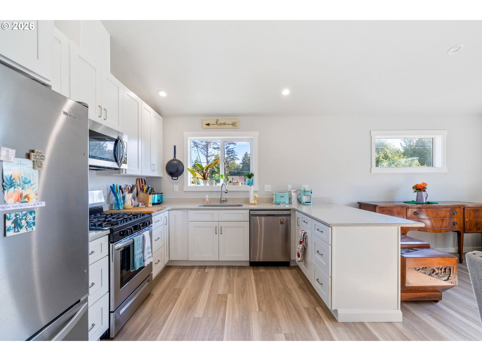 Welcome to this beautifully built 2021 two-story home offering 1,574 SF of light-filled living space in Lincoln City’s sought-after “Eaglet Neighborhood.” Designed for outdoor enthusiasts and nature lovers, this 3-bedroom, 2.5-bath home showcases serene views of a nearby Bald Eagle’s nest right from your window. Enjoy an unbeatable location just a 2-minute walk to the Lincoln City Public Dock, a 4-minute drive to the Devil’s Lake Boardwalk hiking trail—where Devil’s Lake is stocked with fish for a fisherman’s enjoyment—and only 5 minutes to beach and ocean access.Inside, you’ll find durable LVP flooring throughout and a bright, open feel, highlighted by vaulted ceilings in the living room and a cozy gas fireplace—perfect for relaxing on chilly coastal days. Step outside to the deck for gorgeous morning views w/ coffee or sunset relaxation. The kitchen is well-appointed with quartz countertops, an eat-bar, pantry, and stainless steel gas appliances, ideal for both everyday living and entertaining. The spacious owner’s bed features a walk-in closet, and a bath with double sinks.Additional highlights include generously sized bedrooms, a dedicated laundry area with built-ins, a stair chairlift with remote, and a garage equipped with a hot and cold water spigot—perfect for coastal living and cleanup after a day of adventure.