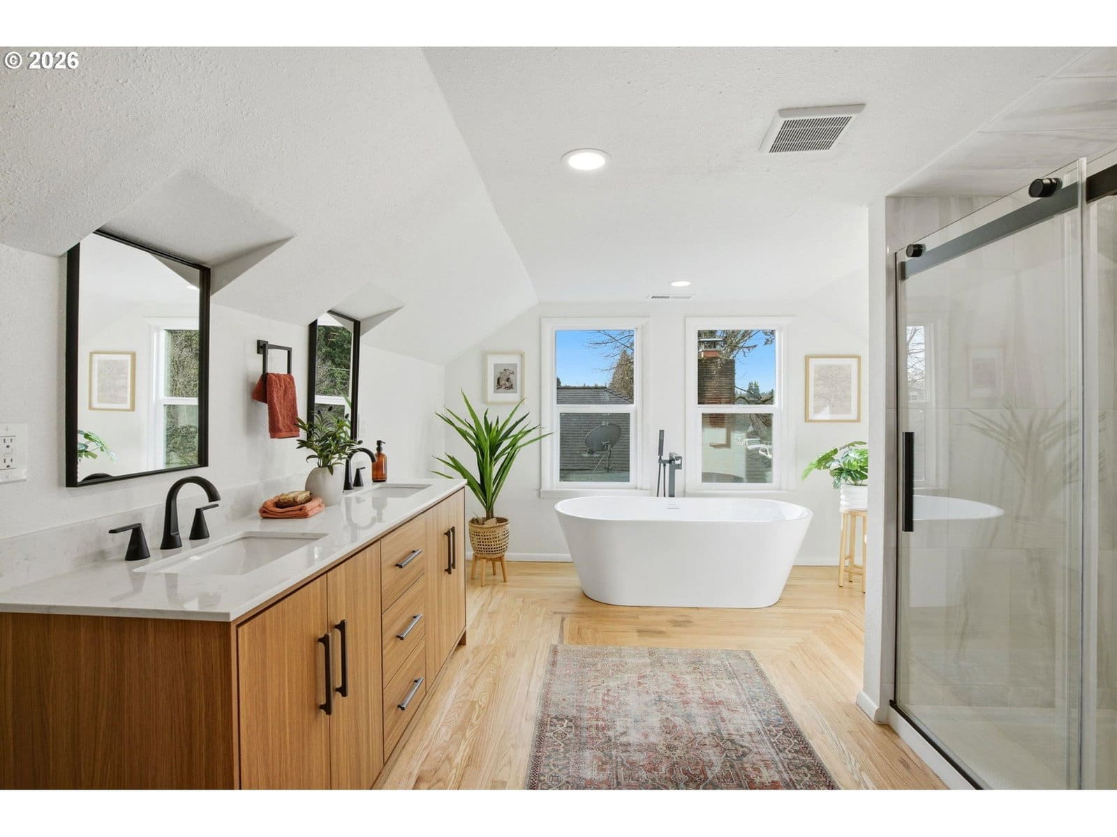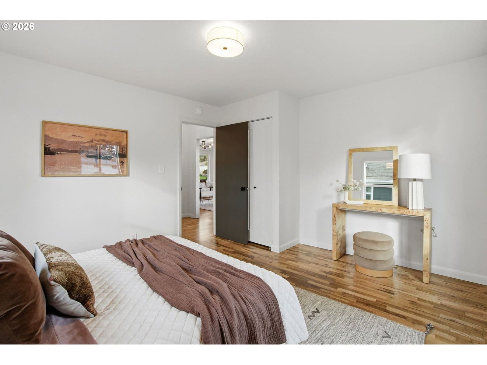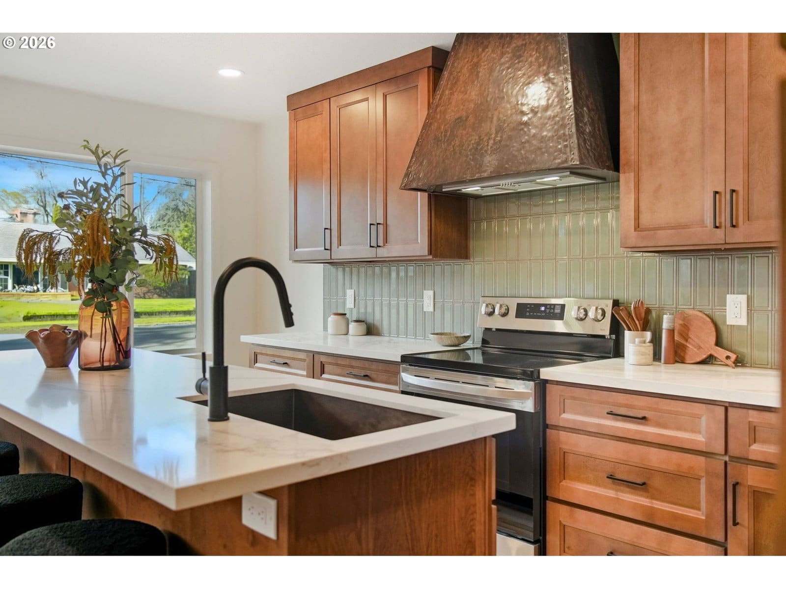 Thoughtfully reimagined classic with confidence and edge, this home delivers a renovation that feels intentional from top to bottom. Original character has been preserved where it matters, while the home has been fully upgraded with new systems, refined finishes, and a layout that works. Inside, restored original hardwood and parquet floors set the tone, leading into a brand-new kitchen centered around a dramatic 9 foot island, designed for gathering, cooking, and everyday living. LG appliances and Delta fixtures bring clean functionality, while a striking vintage copper hood over the range adds a sculptural focal point that anchors the space with personality. A custom dining room bar and newly created office space add smart flexibility for entertaining and work-from-home life. The main level offers two comfortable bedrooms, a dedicated office, and an updated full bath with crisp, current finishes. Upstairs, the primary suite feels like its own level of calm, complete with a new walk-in closet and a generous bath featuring a deep soaking tub, tiled shower, double vanity, and separate toilet room designed for comfort. Beyond the design, the home has been comprehensively improved: updated plumbing and electrical with modern outlets and switches, new double-pane windows, Trane heat pump with A/C, new water heater, new roof and gutters, new sewer line, and a decommissioned oil tank. The result is an all-electric home built for efficiency, longevity, and peace of mind. This is a transformation that respects the home’s roots while delivering a fresh, confident take on everyday living. Distinctive, functional, and truly move-in ready, this Milwaukie home offers originality paired with substance.