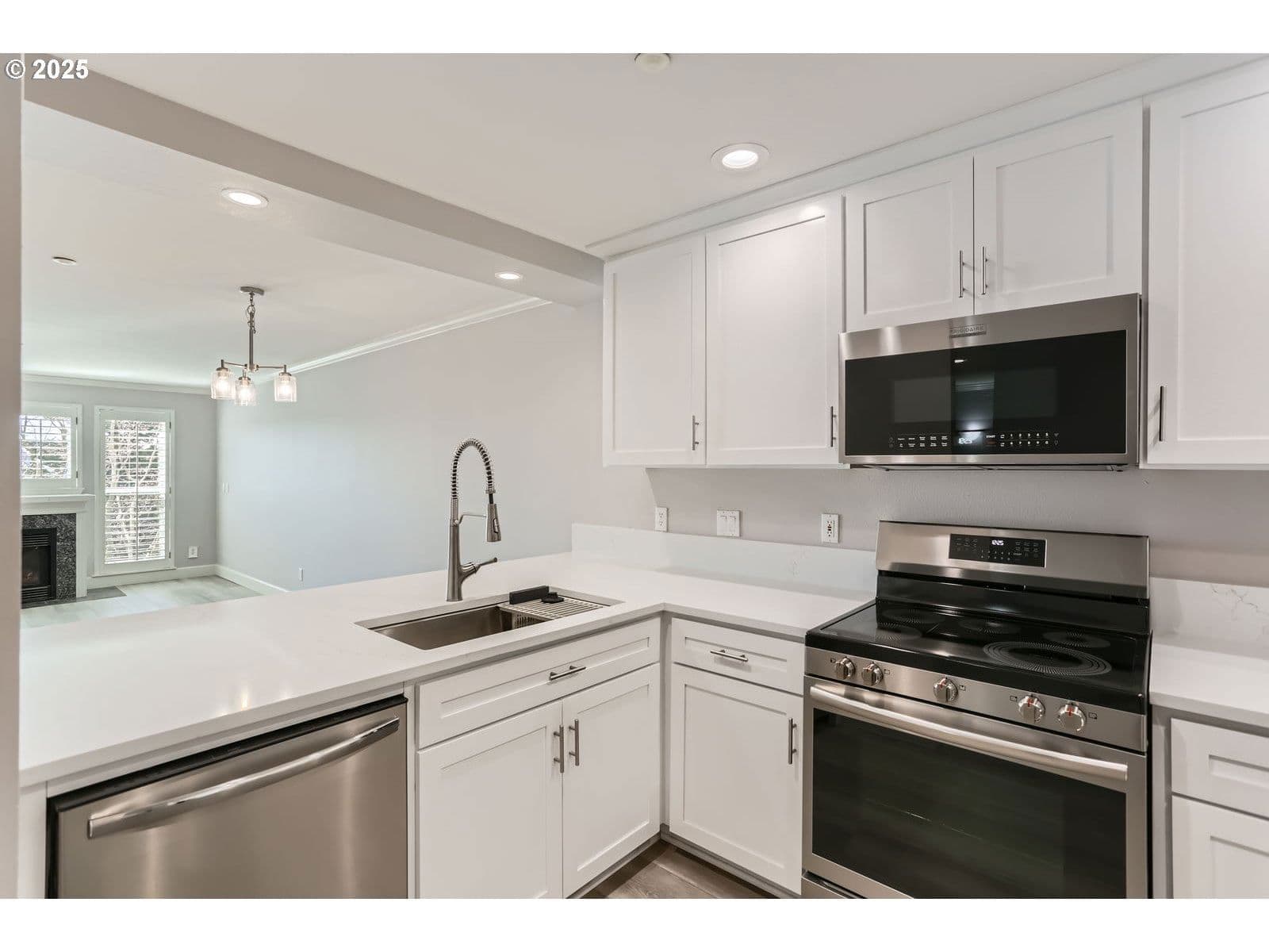 This south facing second floor one level condo has been completely updated, offering brand new finishes throughout. Enjoy the fresh look with new interior paint, updated plumbing & gorgeous quartz countertops in the kitchen & baths. The kitchen also boasts additional cupboards for extra storage & convenient soft-close technology on all cabinets. Appliances are all brand new, and a stacked washer & dryer are included, adding to the home’s convenience. The shower stalls have been reglazed & new quartz countertops installed in the baths also and the furnace is approximately 10 years old, you’ll have peace of mind knowing the home’s systems are in great shape. Storage won’t be an issue either with the additional kitchen cupboards & the dedicated storage unit in the garage. There’s even a peek-a-boo view to enjoy. This home is ready for you to move in and make it your own! Great location, close to downtown Vancouver and walking paths