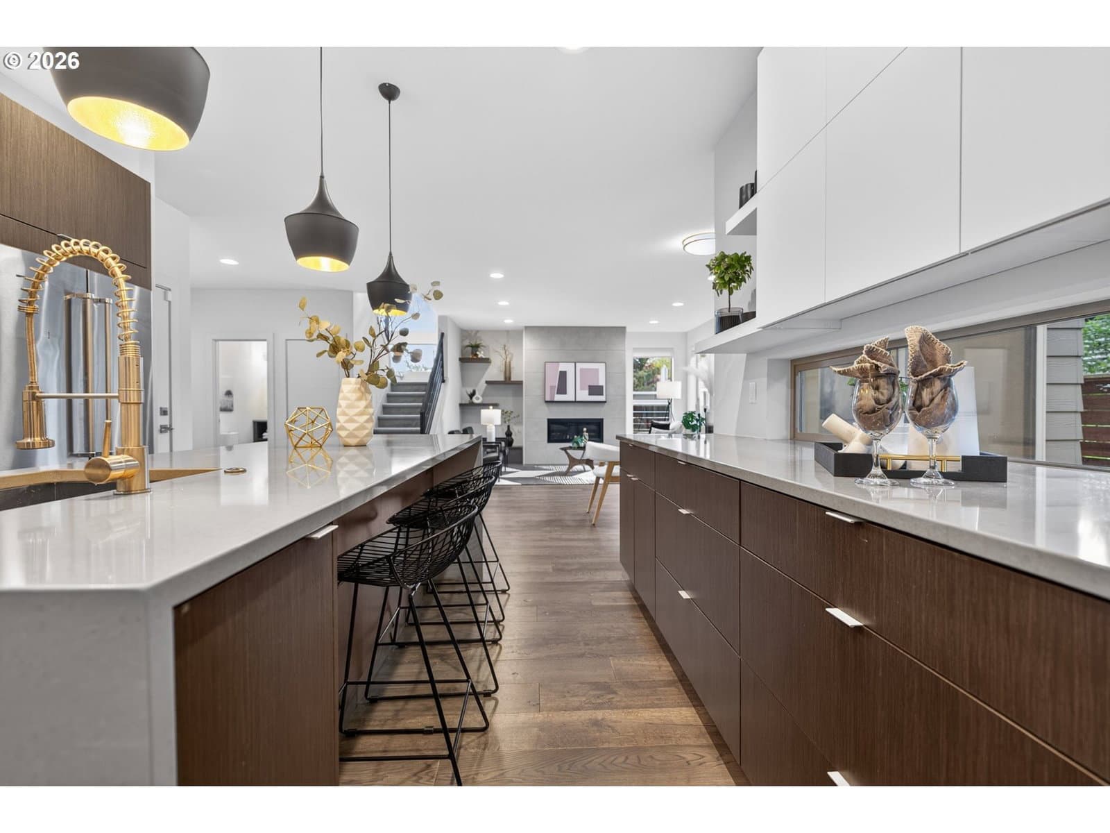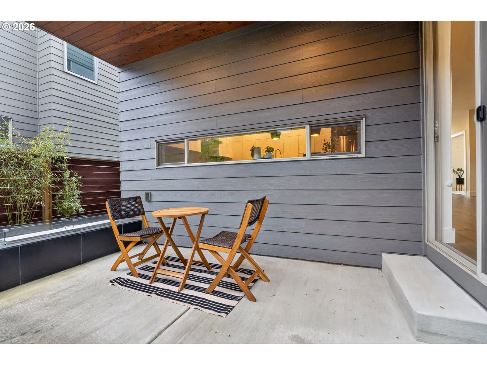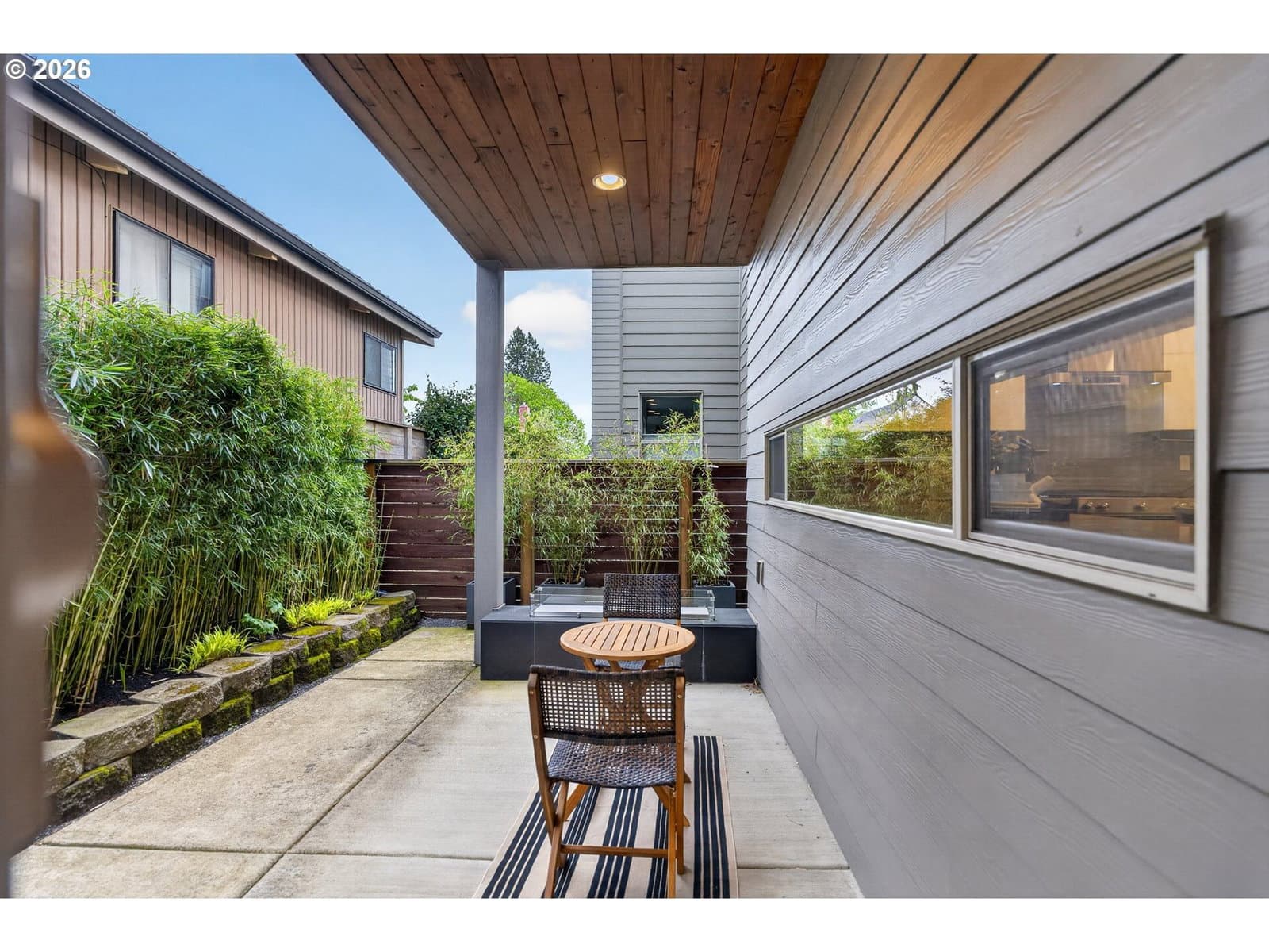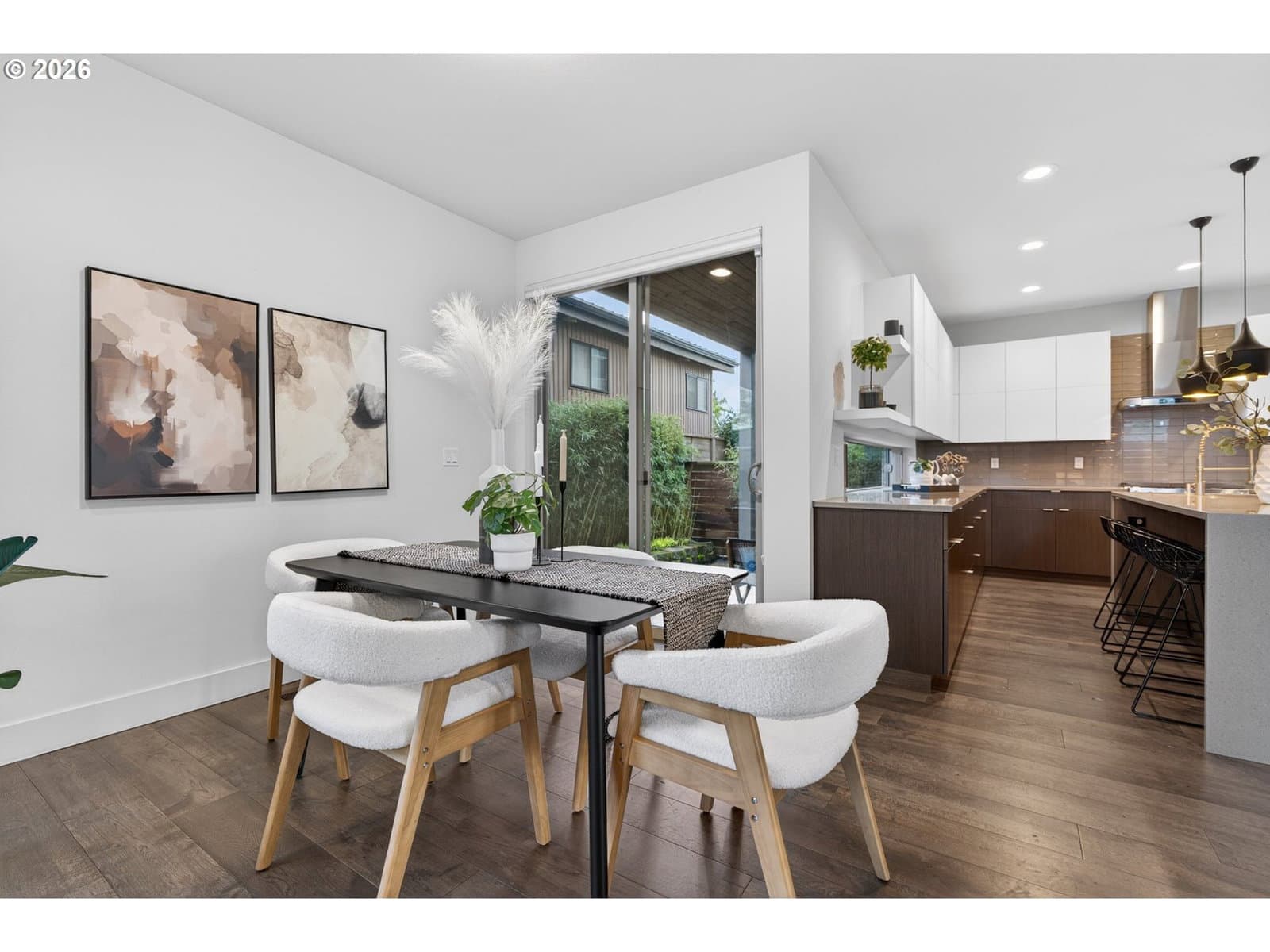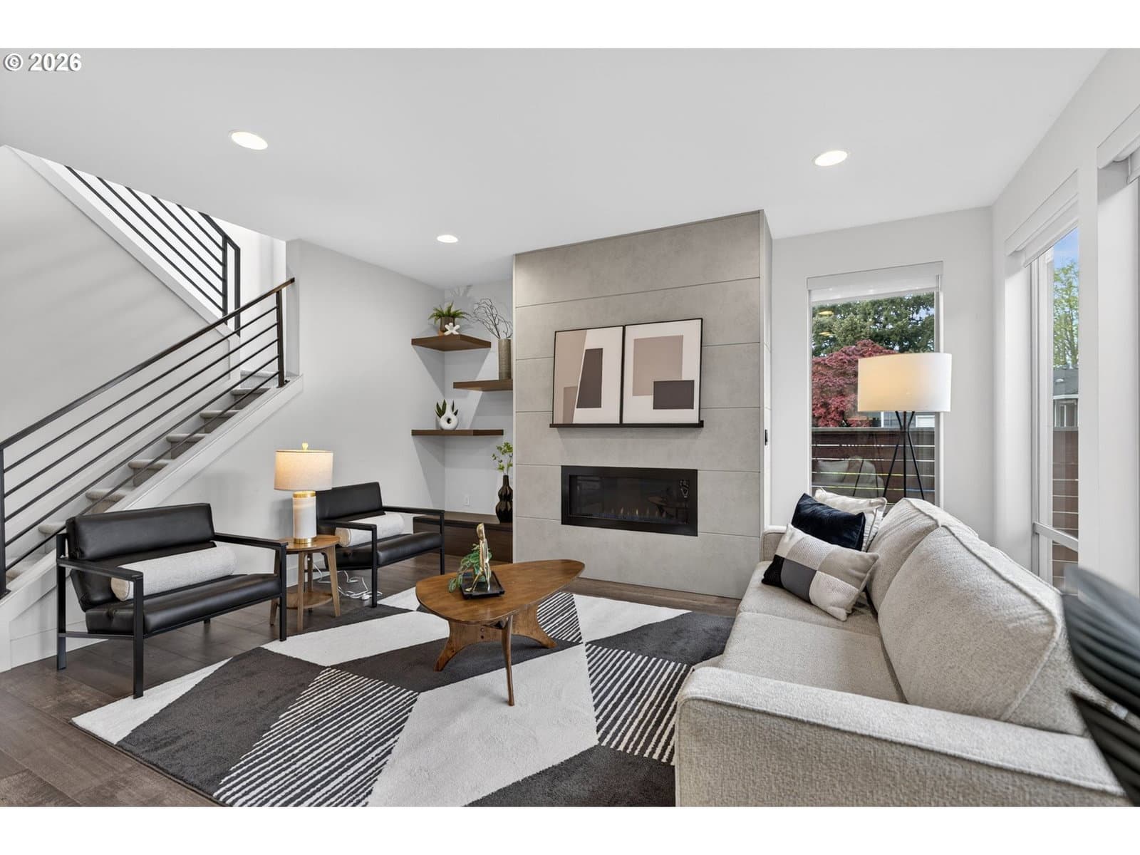 Striking modern home in the heart of Woodstock. Two-tone board and batten siding and floor-to-ceiling windows, thoughful landscape & vibrant Japanese maple make a statement from the curb. Inside, wide-plank hardwood floors flow through an open main level anchored by a floor-to-ceiling tile surround gas fireplace, floating shelves and vaulted ceilings. The chef's kitchen features a large quartz island with island seating, two-tone cabinetry, stainless steel appliances, gas oven, built-in Miele espresso maker, french door refrigerator with bottom freezer, and drawer microwave. The dining area opens directly to a covered cedar-ceiling patio with a gas fire feature, surrounded by lush bamboo for privacy. The primary suite is generous with a tray ceiling, sitting area, attached bathroom with heated floors, freestanding soaking tub, glass-enclosed walk-in shower and a bright walk-in closet with built-in shelving. Flexible main-level room with frosted glass French doors works perfectly as a home office or library. Attached double car garage, Central heat & AC, new roof. Corner lot, fenced yard make this one easy home to live in! Location is a 10!