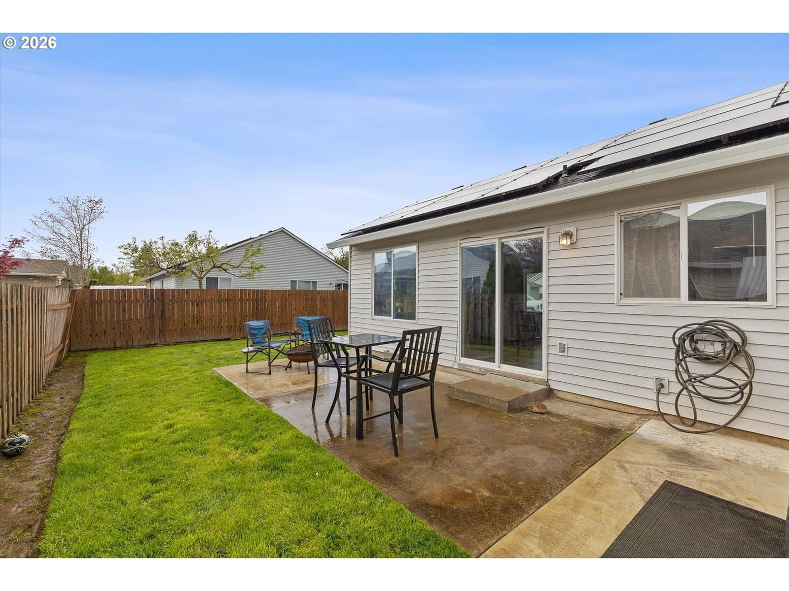 4days on marketWelcome to this charming single-level home nestled in the heart of Oregon’s sought-after wine country! From the moment you arrive, the wide private driveway welcomes you with ample parking, including room for trailers, RVs, or multiple vehicles.Inside, this 3-bedroom, 2 full bathroom home offers comfort, convenience, and plenty of space both inside and out with a very well designed layout. The living spaces flow seamlessly to the outdoors through sliding glass doors, opening to an expansive patio—perfect for weekend BBQs, entertaining guests, or relaxing evenings around a firepit under the stars. The spacious primary suite offers a true retreat as you enjoy a walk-in closet, double-sink vanity, and a step-in shower for added comfort and functionality. The fully fenced backyard offers endless possibilities, with plenty of room for garden beds, play structures, or pets to roam freely. Whether you’re looking to create your dream outdoor oasis or simply enjoy the open space, this property delivers.Conveniently located just moments from local schools, parks, and everyday amenities, this home combines peaceful small-town living with easy access to everything you need.Don’t miss your opportunity to own a slice of wine country living in this inviting and versatile home!There is a FHA assumable loan at very low rate! Home has energy efficient solar panels installed in 2023. New roof and heat pump in 2017. New base molding and interior paint in 2026. So much parking!