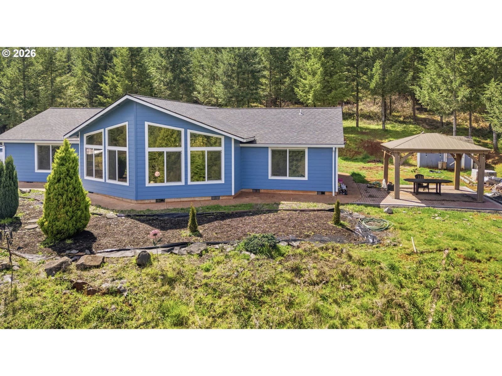 Perched at the top of Cascade Woods Drive, this stunning 30-acre property offers a rare combination of privacy, natural beauty, and breathtaking views. Tucked behind a gated private road shared with just two other homes, the setting provides an added sense of seclusion and security. Surrounded by mature trees and laced with scenic trails, it’s an ideal retreat for those seeking space to explore, unwind, and enjoy the outdoors.The 3-bedroom, 2-bath home is designed to take full advantage of its surroundings, featuring a light-filled living room with expansive east-facing windows that capture incredible sunrises and sweeping vistas. The spacious primary suite offers a peaceful retreat, complete with a walk-in closet for added comfort and convenience.Step outside to enjoy the property’s many amenities, including a charming gazebo—perfect for relaxing, entertaining, or simply taking in the serene landscape. Two additional outbuildings provide excellent flexibility for storage, hobbies, or workspace needs, while a detached studio adds even more versatility as a home office, creative space, or workout room.Whether you're looking for a quiet escape or a place to spread out and live fully, this property delivers a truly special lifestyle opportunity. 2025 Timber deferral taxes $3117.53.