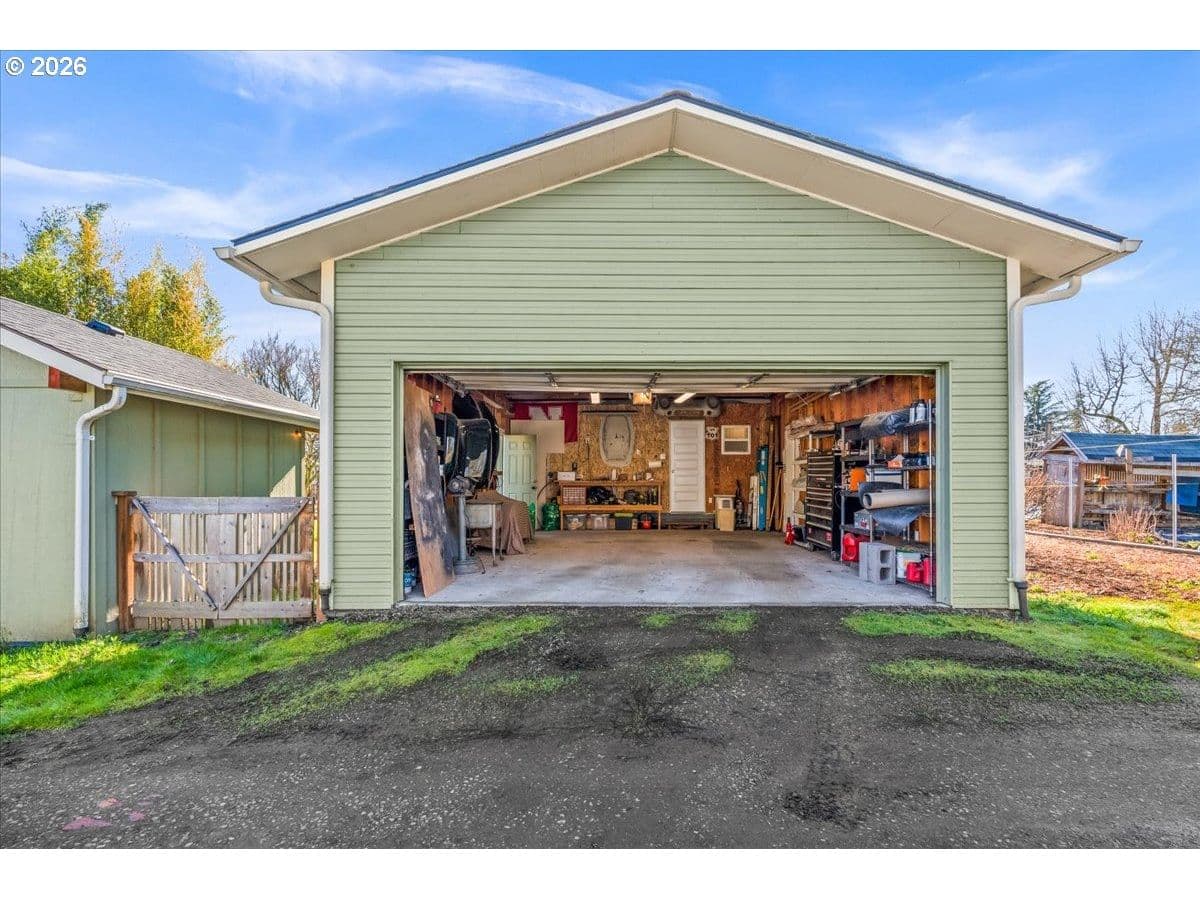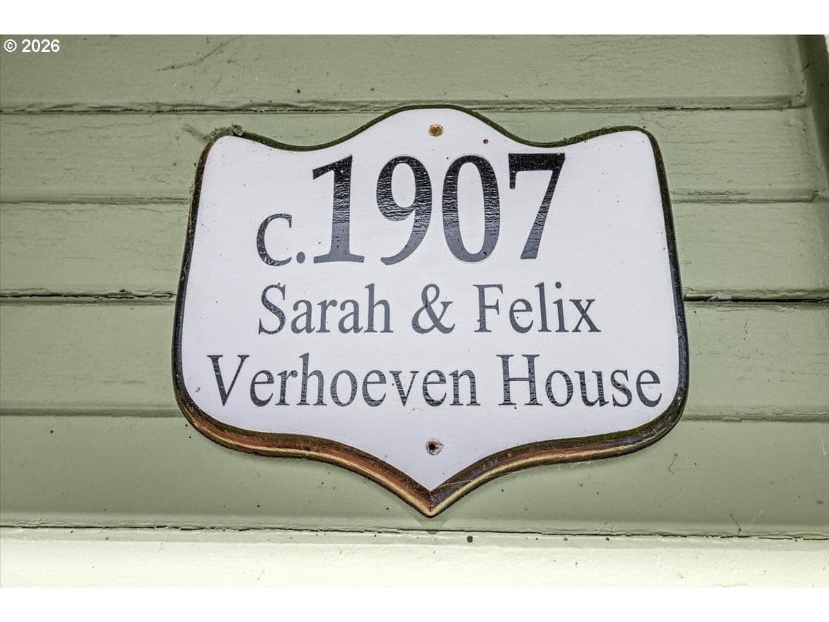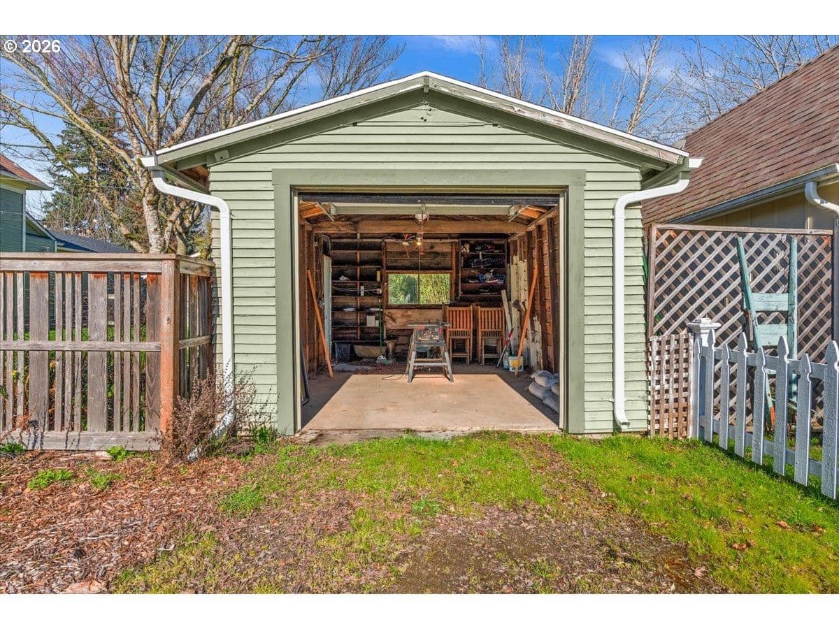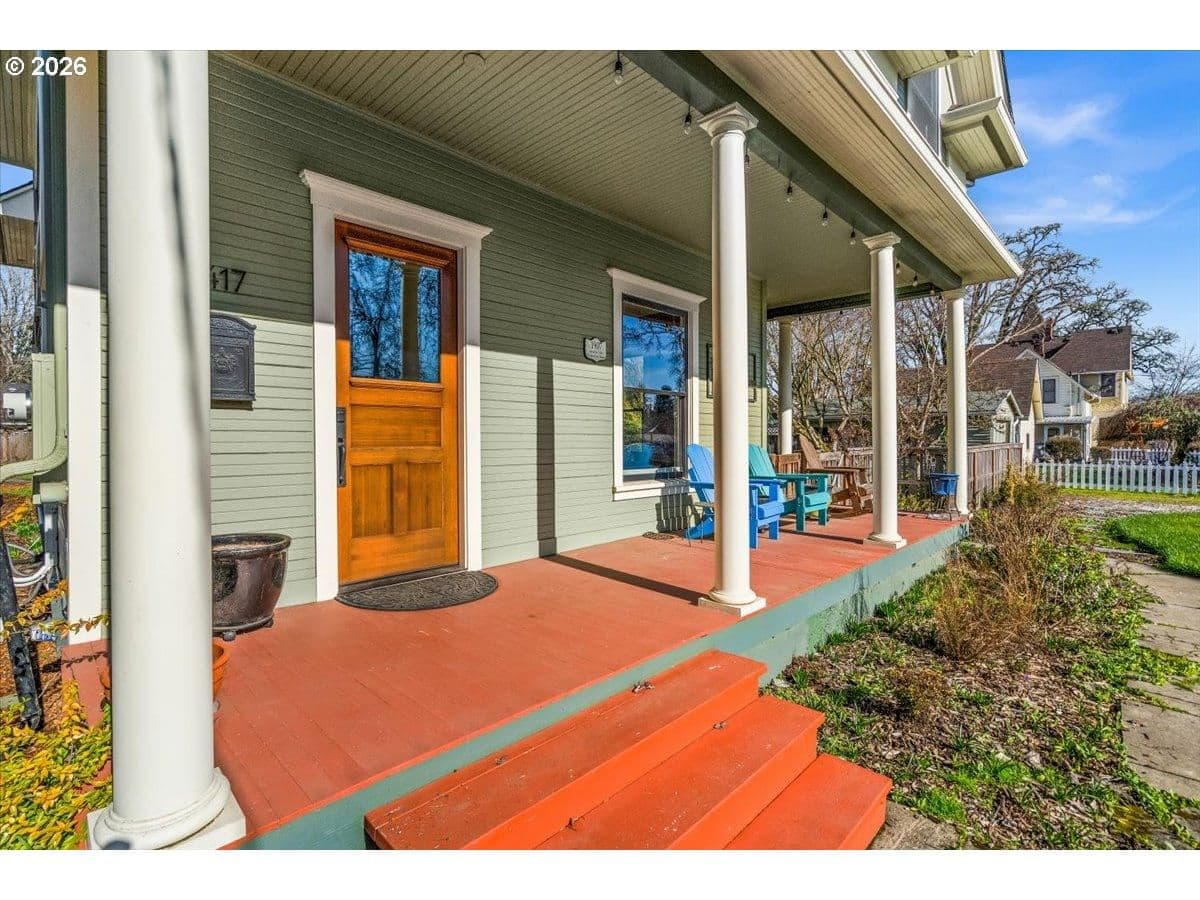 Open House Saturday and Sunday 12-2pm! Step into timeless charm with this captivating 1907 farmhouse that blends vintage character with modern flair. A sweeping covered front porch welcomes you home, wrapping gracefully to the dining area—perfect for morning coffee or sunset gatherings. Inside, soaring ceilings and a gallery-style hallway set the stage for your favorite artwork, highlighted by a stunning stained-glass window and an elegant open wooden staircase. The formal living and dining rooms impress with wood-wrapped picture windows, exposed beams, and beautiful natural light that creates a warm, inviting ambiance. The cozy family room offers plush comfort with sunny windows that bring the outdoors in—hardwoods waiting beneath the carpet. At the heart of the home, the chef’s kitchen dazzles with quartz countertops, subway tile backsplash, copper sink, stainless steel appliances, glass-front cabinetry, and a movable island with breakfast bar seating. A spacious mudroom provides abundant storage and a deep utility sink—ideal after gardening or outdoor adventures. Main floor office boasts a bright window and a half bath with pocket door. Upstairs, an open loft offers the perfect flex space for relaxing or movie nights, plus a convenient laundry closet with built-ins (washer and dryer included).The primary suite features designer paint, built-ins, a generous closet, and room for a sitting area retreat. Three additional spacious bedrooms boast excellent storage, charming built-ins, and brand-new carpet. Outside, enjoy a fully fenced yard bursting with blooms, paver patio space for outdoor dining or a firepit, and a delightful garden shed. With a two-car attached garage, an additional detached garage, and a location within walking distance to Rogers Park—and just 15 minutes to Hagg Lake—this home offers character, comfort, and convenience in one unforgettable package.