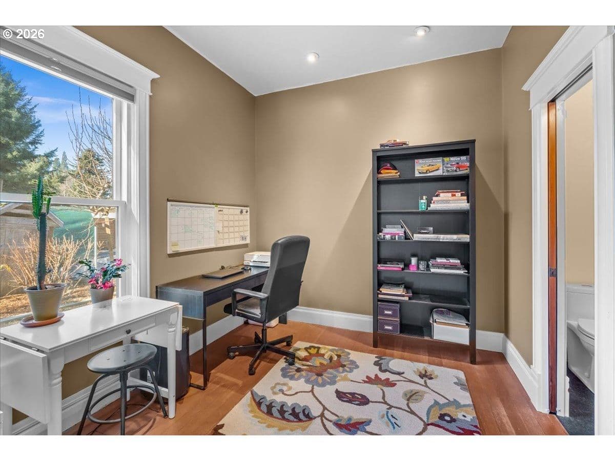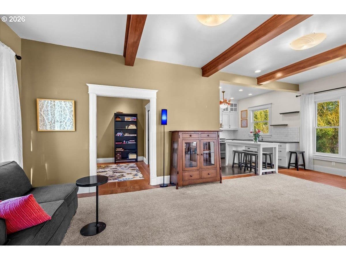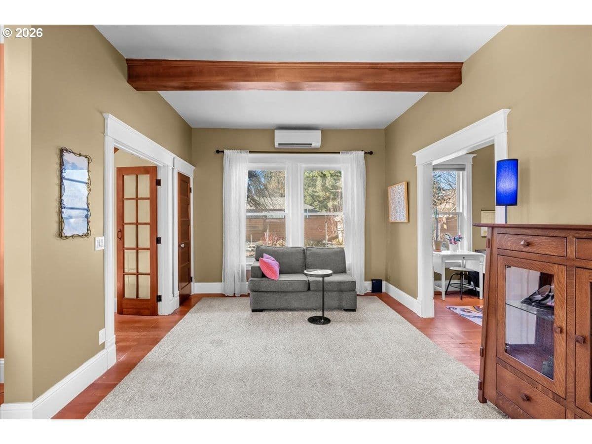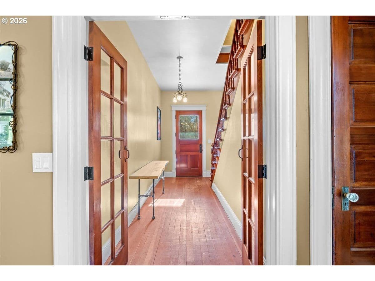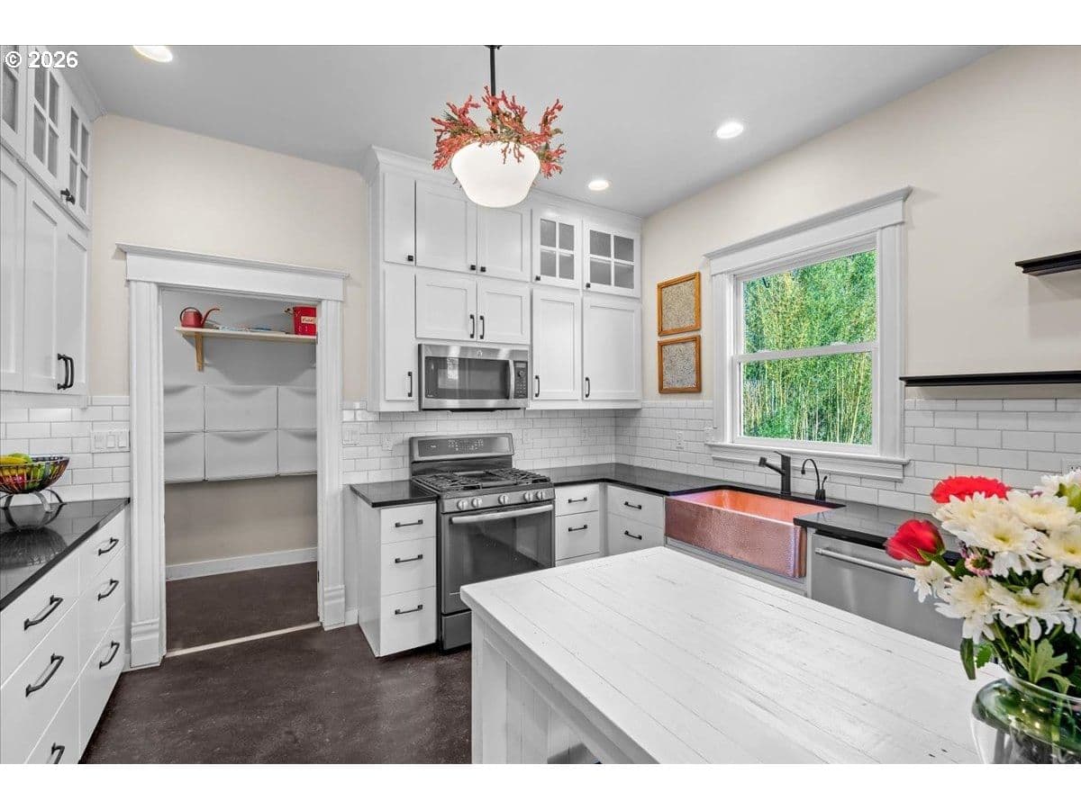 Open House Saturday and Sunday 12-2pm! Step into timeless charm with this captivating 1907 farmhouse that blends vintage character with modern flair. A sweeping covered front porch welcomes you home, wrapping gracefully to the dining area—perfect for morning coffee or sunset gatherings. Inside, soaring ceilings and a gallery-style hallway set the stage for your favorite artwork, highlighted by a stunning stained-glass window and an elegant open wooden staircase. The formal living and dining rooms impress with wood-wrapped picture windows, exposed beams, and beautiful natural light that creates a warm, inviting ambiance. The cozy family room offers plush comfort with sunny windows that bring the outdoors in—hardwoods waiting beneath the carpet. At the heart of the home, the chef’s kitchen dazzles with quartz countertops, subway tile backsplash, copper sink, stainless steel appliances, glass-front cabinetry, and a movable island with breakfast bar seating. A spacious mudroom provides abundant storage and a deep utility sink—ideal after gardening or outdoor adventures. Main floor office boasts a bright window and a half bath with pocket door. Upstairs, an open loft offers the perfect flex space for relaxing or movie nights, plus a convenient laundry closet with built-ins (washer and dryer included).The primary suite features designer paint, built-ins, a generous closet, and room for a sitting area retreat. Three additional spacious bedrooms boast excellent storage, charming built-ins, and brand-new carpet. Outside, enjoy a fully fenced yard bursting with blooms, paver patio space for outdoor dining or a firepit, and a delightful garden shed. With a two-car attached garage, an additional detached garage, and a location within walking distance to Rogers Park—and just 15 minutes to Hagg Lake—this home offers character, comfort, and convenience in one unforgettable package.