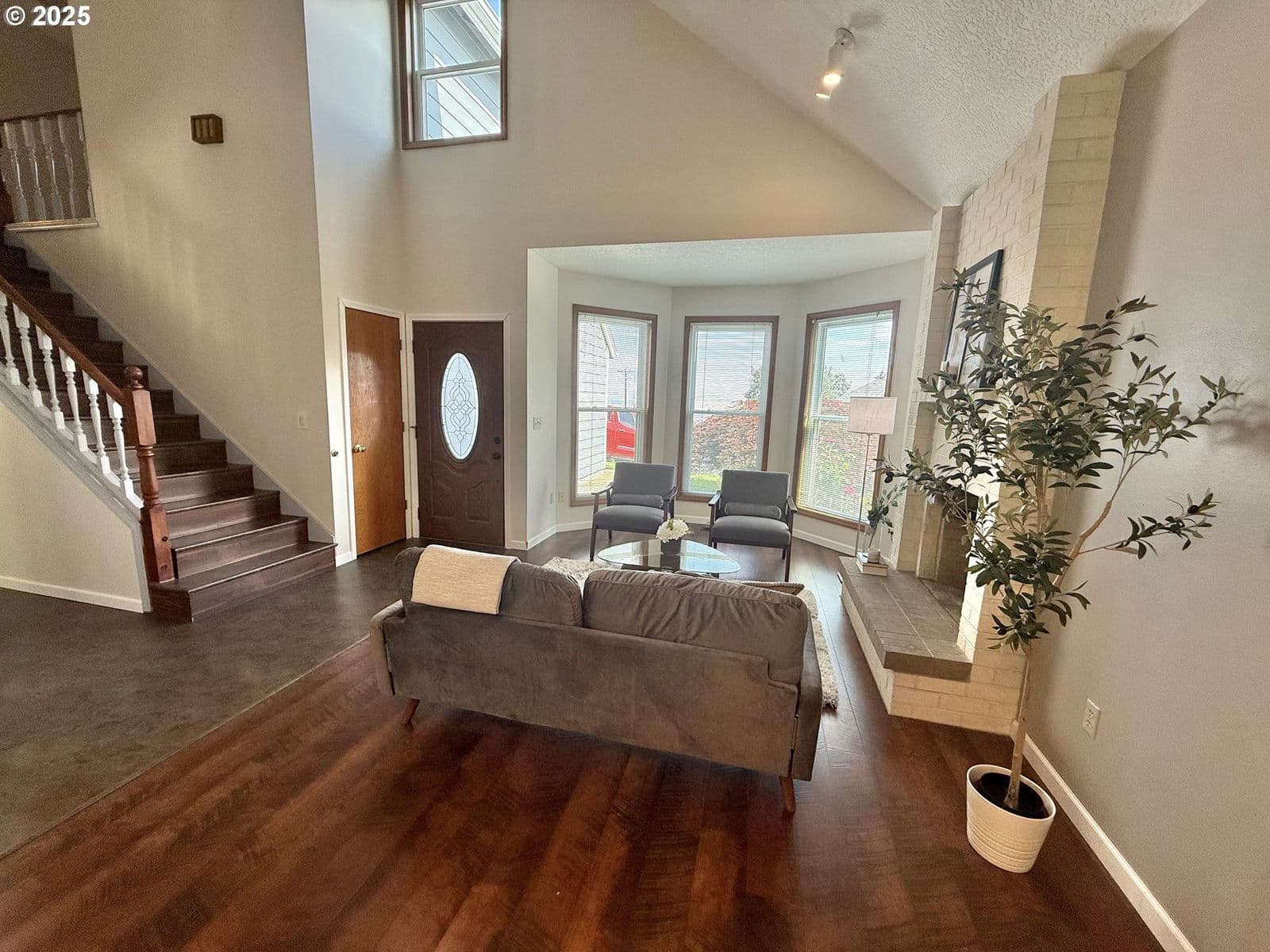 Nice 3-bedroom, 2.5-bath home offering 1,915 SQFT of comfortable living space. The inviting living room features soaring ceilings and a cozy fireplace, perfect for relaxing or entertaining. Enjoy cooking in the updated kitchen with Corian countertops. Upstairs, the spacious master suite features a vaulted ceiling and private bath with a double vanity. Two additional bedrooms are roomy and functional. Recent updates include a new roof, siding, and windows. Step outside to a nicely landscaped backyard—ideal for outdoor enjoyment. Move-in ready and full of charm!