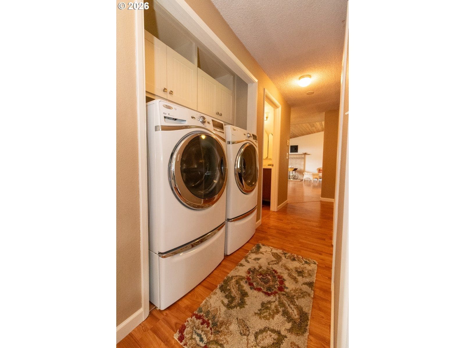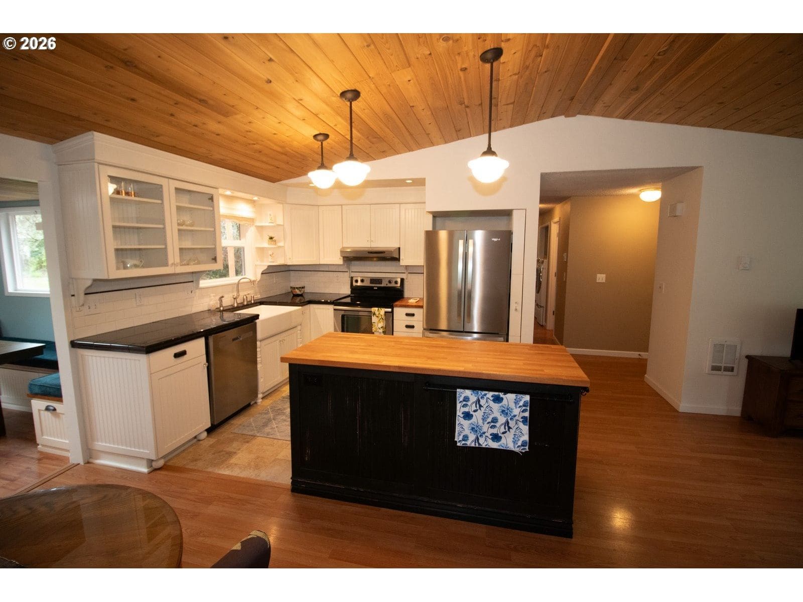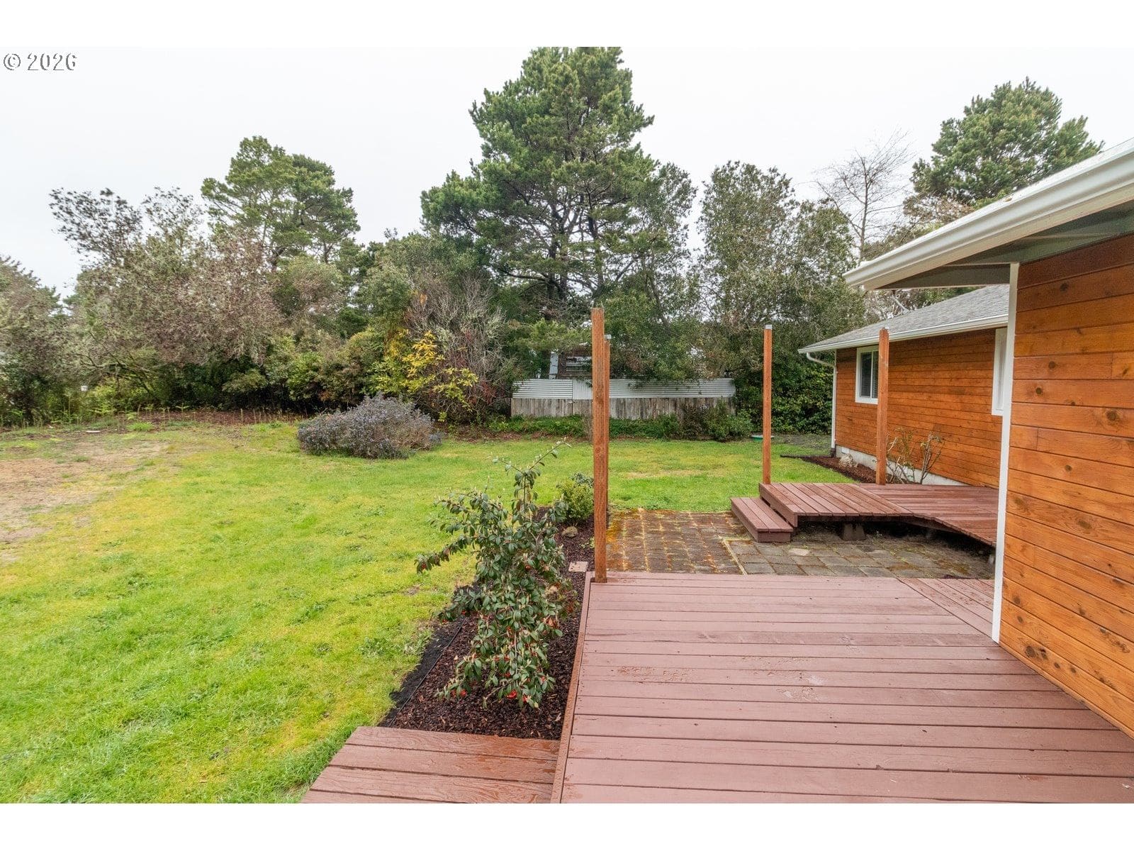 Welcome to this beautifully remodeled coastal home, featuring a unique front yard showcase with a section of the historic Siuslaw River Bridge, complemented by thoughtfully landscaped rock, driftwood, and nautical rope accents and Pond! A covered, open entry welcomes you inside, while the double-car garage offers a new overhead door, built-in shelving, and a functional workspace. The spacious backyard includes a woodshed and double side gates, perfect for recreational vehicle parking. Inside, the home boasts an open floor plan with vaulted wood ceilings and vinyl windows that fill the space with natural light. The kitchen features tile countertops, a butcher block island, a farmhouse sink, stainless steel appliances, and a cozy eating area. The dining room includes built-in cabinetry, shelving, a bench seat, and a sliding door leading to double patio area —ideal for a future hot tub setup & BBQ. This 3-bedroom home offers generously sized rooms. Guest bedrooms include double closets & organizer, while the primary suite features carpeting and a walk-in closet & organizer. The ensuite bathroom includes a vanity, large shower, and charming beadboard half walls. The main bathroom offers a tub/shower combination along with an antique vanity and mirror. Additional highlights include a conveniently located hall closet housing the washer and dryer. This well-maintained home is truly move-in ready and full of character.