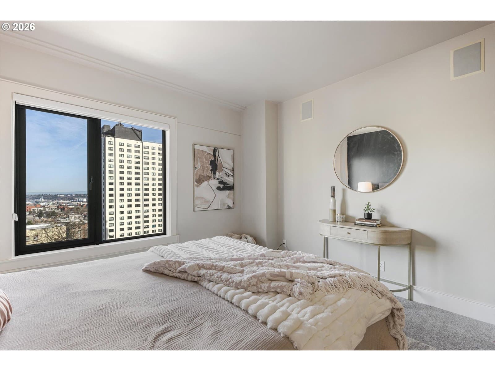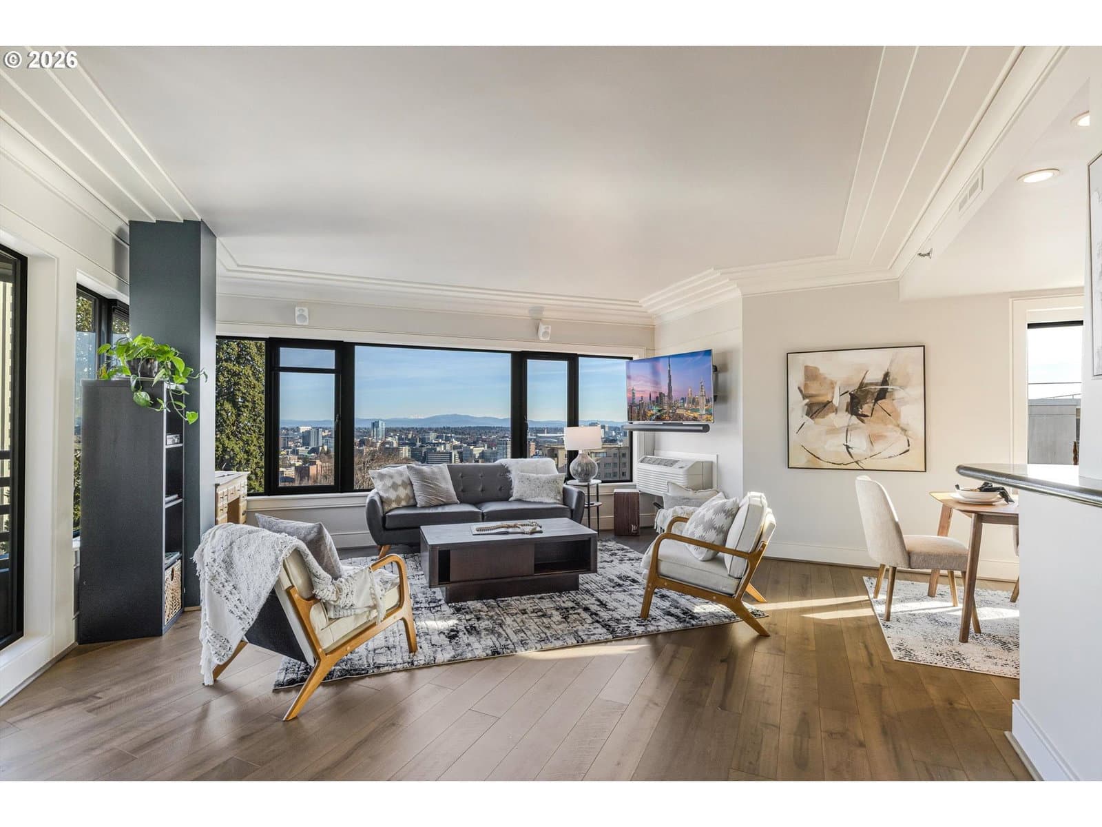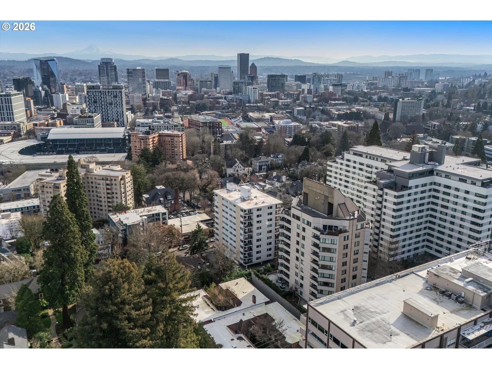 Located on the 7th floor in the heart of Goose Hollow, this 2-bedroom, 2-bath condo offers the perfect mix of city living and Northwest beauty. Just steps from Forest Park, the MAC, Providence Park, Zupan’s Market, and the MAX light rail, you’re surrounded by Portland’s best amenities. Inside, wall-to-wall windows showcase sweeping city views and multiple mountain vistas, filling the space with natural light. The open kitchen features a newer gas range, Sub-Zero refrigerator, granite surfaces, and all appliances included, along with an in-unit washer and dryer. New luxury vinyl plank flooring adds warmth and durability. The primary suite includes a walk-in closet, dual-sink vanity, and tiled shower, while the second bedroom offers flexible space for guests or a home office. Step outside to your covered patio and enjoy a peaceful spot to take in the skyline. Secure building access, a well-managed HOA, deeded parking in the secure garage, and a large storage unit on the garage level complete the package. A rare opportunity to own a beautifully located condo in one of Portland’s most desirable neighborhoods.
