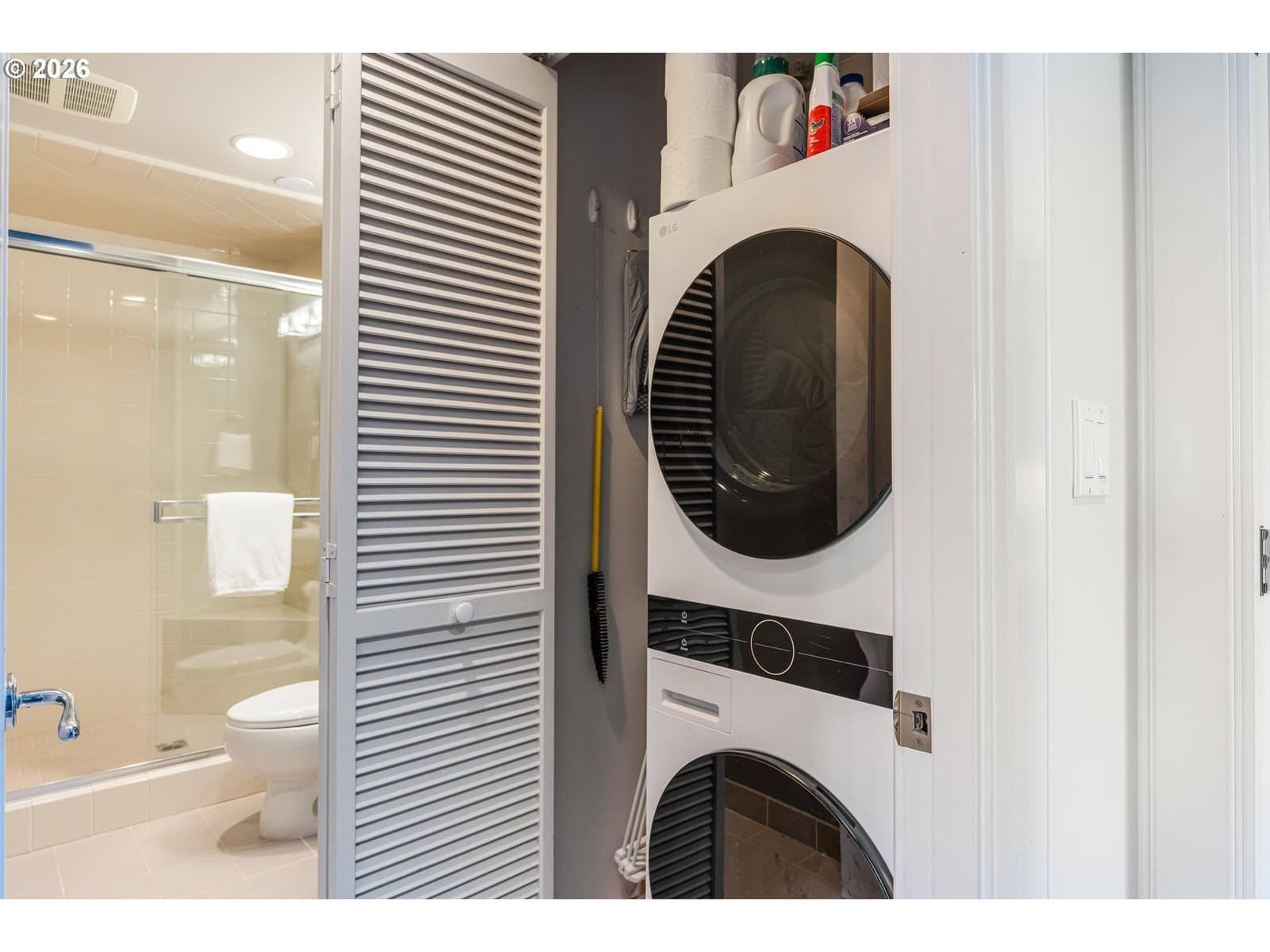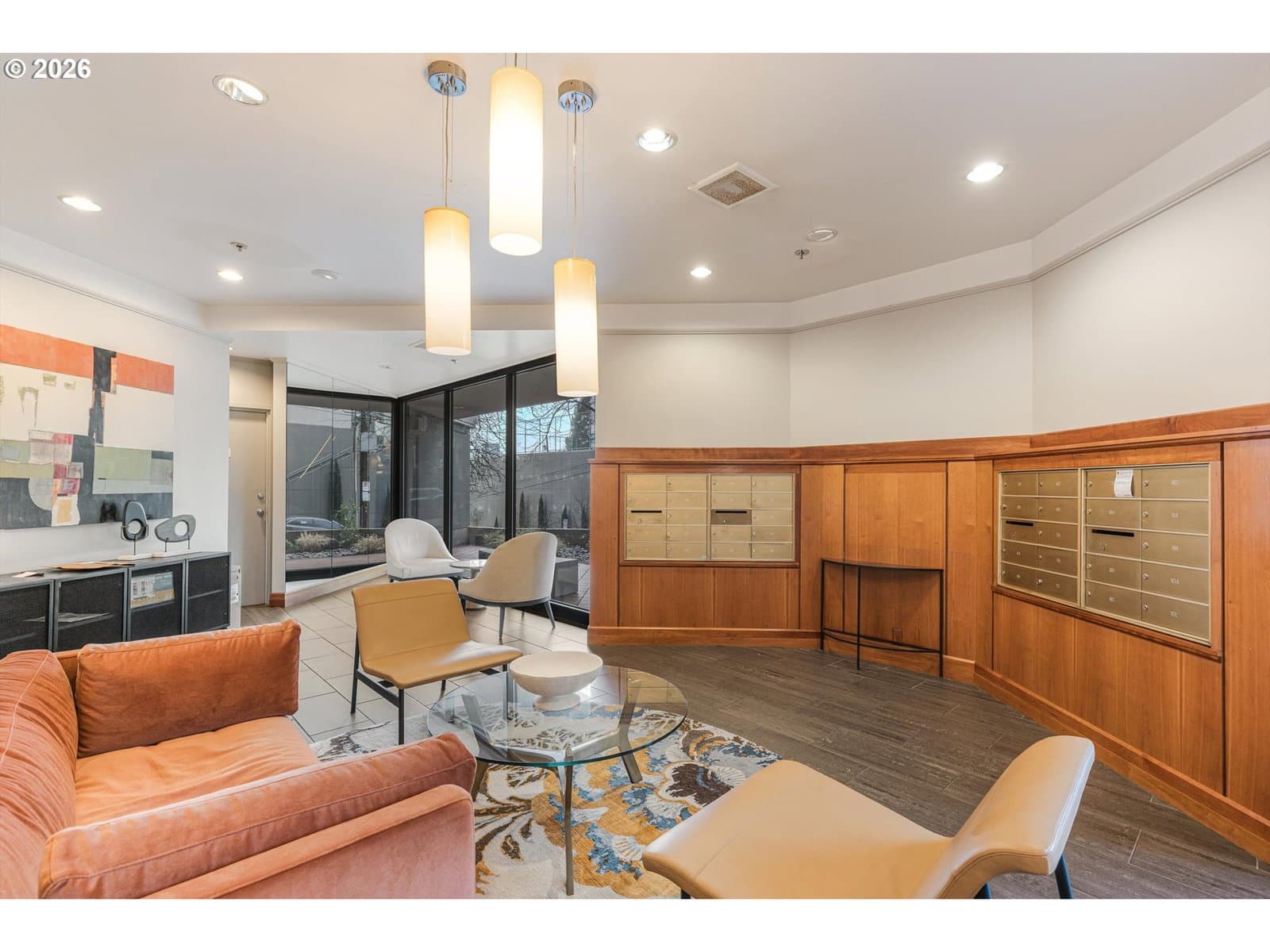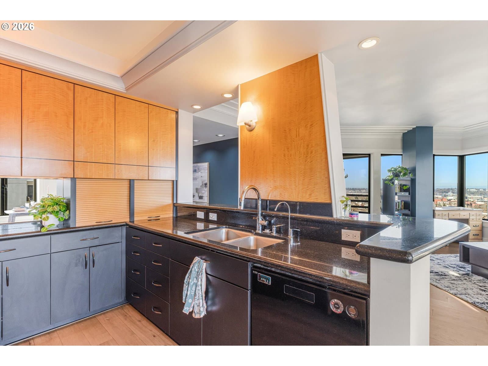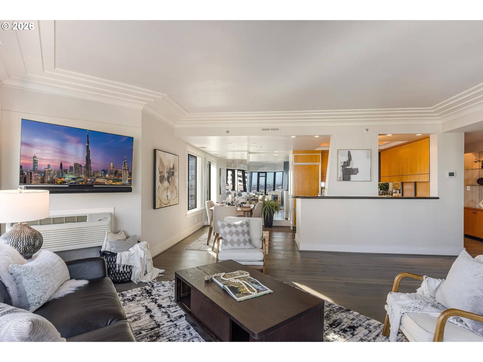 Located on the 7th floor in the heart of Goose Hollow, this 2-bedroom, 2-bath condo offers the perfect mix of city living and Northwest beauty. Just steps from Forest Park, the MAC, Providence Park, Zupan’s Market, and the MAX light rail, you’re surrounded by Portland’s best amenities. Inside, wall-to-wall windows showcase sweeping city views and multiple mountain vistas, filling the space with natural light. The open kitchen features a newer gas range, Sub-Zero refrigerator, granite surfaces, and all appliances included, along with an in-unit washer and dryer. New luxury vinyl plank flooring adds warmth and durability. The primary suite includes a walk-in closet, dual-sink vanity, and tiled shower, while the second bedroom offers flexible space for guests or a home office. Step outside to your covered patio and enjoy a peaceful spot to take in the skyline. Secure building access, a well-managed HOA, deeded parking in the secure garage, and a large storage unit on the garage level complete the package. A rare opportunity to own a beautifully located condo in one of Portland’s most desirable neighborhoods.