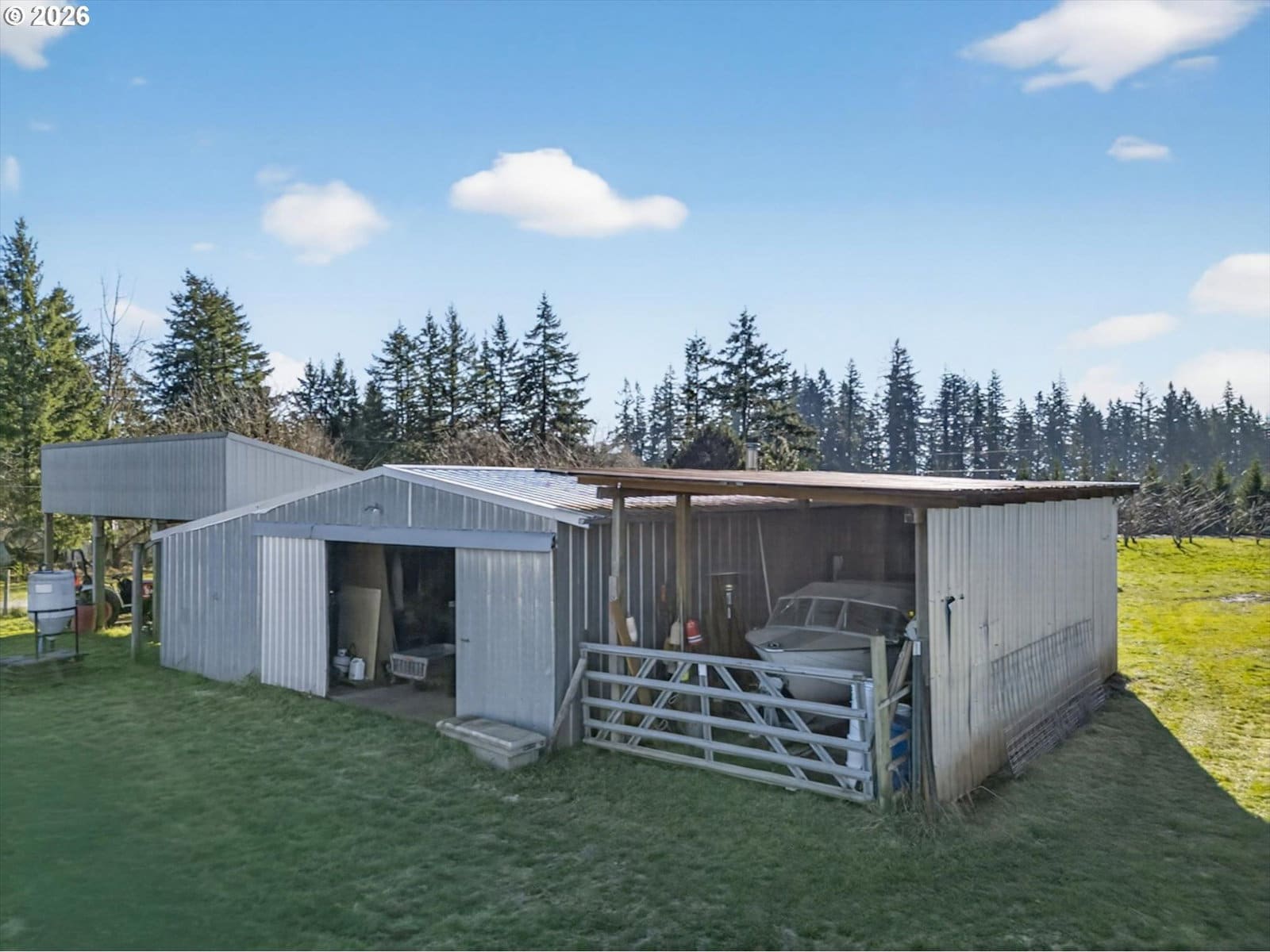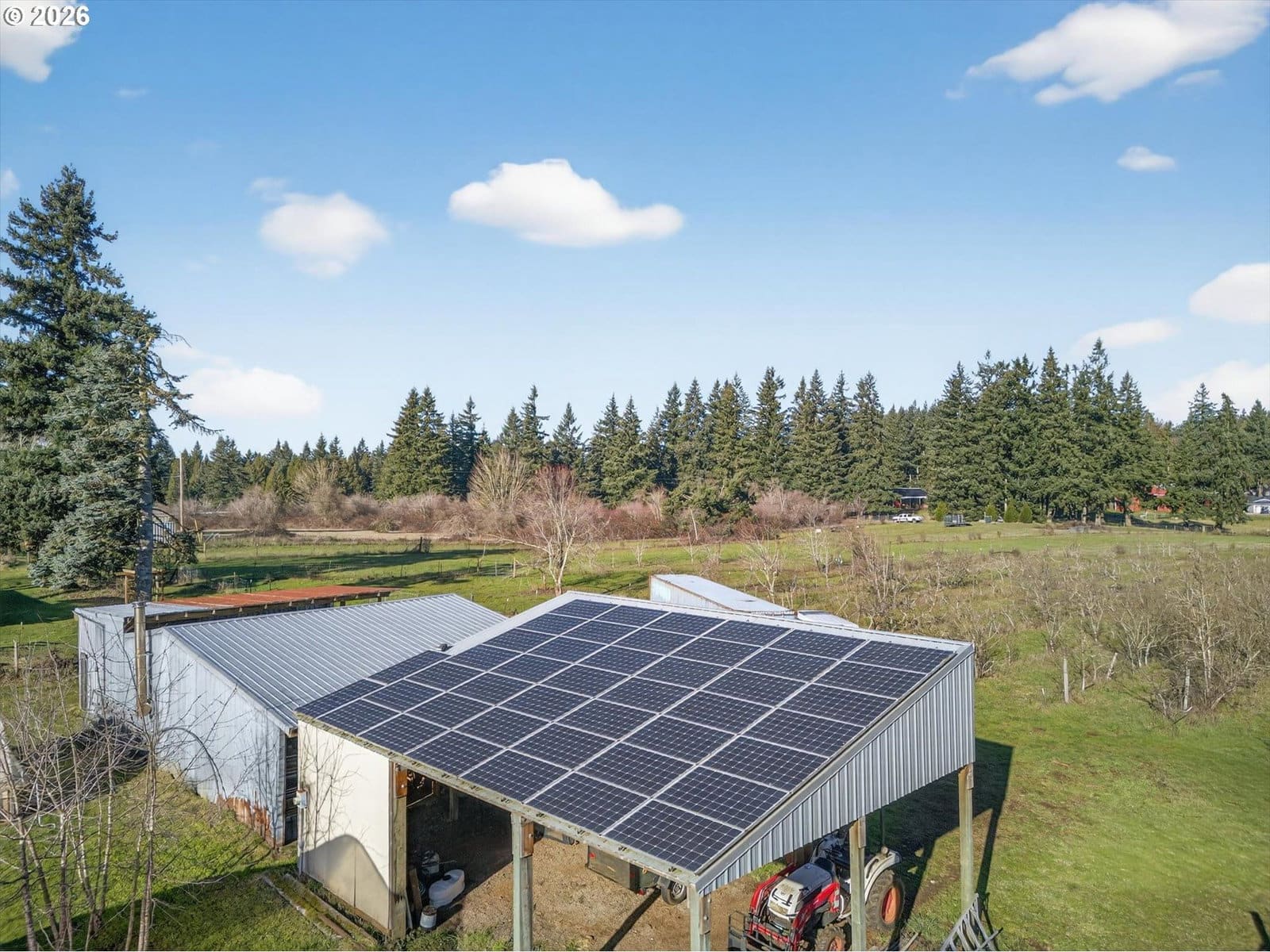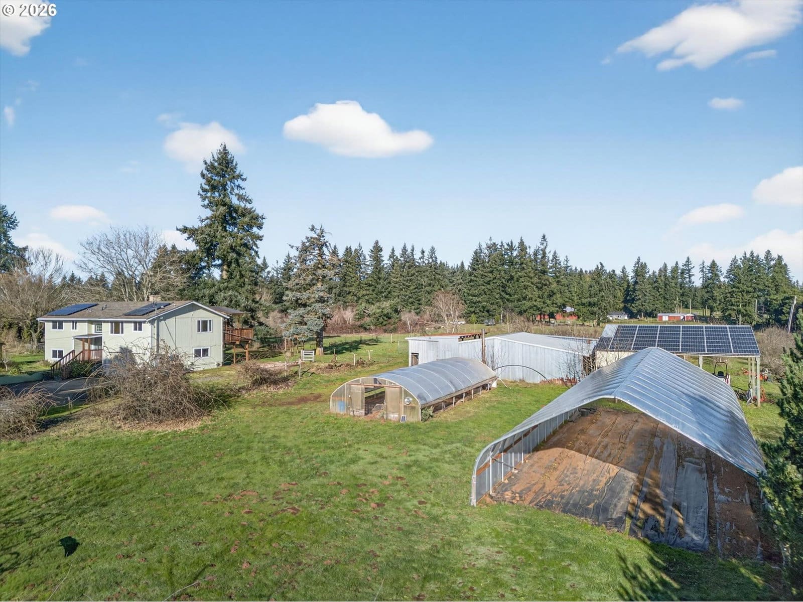 Set on 6.77 level acres in the quiet countryside outside Canby, this turn-key rural property offers a rare blend of usable acreage, established agricultural improvements, and energy-efficient living. Ideal for buyers seeking a mini farm or hobby farm lifestyle, the property is fully set up for immediate use.The 1,870 sq. ft. home is warm, inviting, and move-in ready, featuring hardwood, bamboo, slate, and laminate flooring, a pellet stove, fireplace with heatilator, and a Lennox heat pump. Recent updates include a newer roof, updated supply-side plumbing, septic improvements, vinyl windows, and a remodeled kitchen with cherry wood countertops, updated cabinetry, and appliances. A sliding door opens to a partially covered deck overlooking pasture and orchard. The finished lower level provides flexible living space with laundry and additional bedroom and bathroom options.Outside, the land is the standout feature. The property includes approximately 500 fruit trees, with hundreds of dwarf apple trees across dozens of varieties, along with pears, quince, and mature sweet cherry trees. Additional plantings include raspberries, blueberries, gooseberries, figs, persimmons, and kiwis. Ag deferral is in place, helping keep property taxes low and supporting continued food production.Well-established infrastructure includes cross-fenced pastures with new livestock fencing, a large barn/shop with loft and work areas, greenhouse, high tunnel, raised garden beds, drip irrigation, and an RV pad with water and power on a separate access. A private well supplies all water needs.Solar panels installed on both the main home and the shop provide excellent energy efficiency and consistently low utility costs. Conveniently located less than 10 minutes to I-205 and near Oregon City, Canby, and Molalla, this is a rare opportunity to own a fully established, move-in-ready acreage property.
