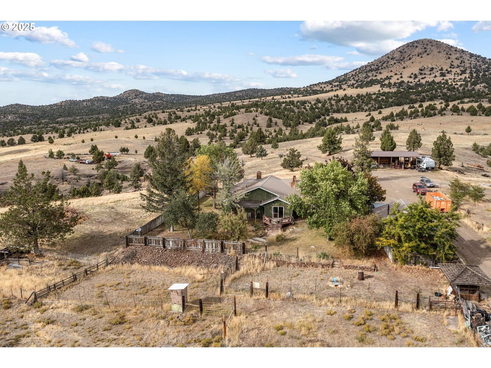 Rare opportunity to own 82+ acres in Mitchell, Oregon! This versatile property includes 35 acres of water rights, is fully fenced and cross fenced, and spans 3 separate tax parcels. You'll find a rustic but functional barn, multiple shops, machine sheds, and hay storage- everything you'll need for livestock, farming, or equipment. The main home sits proudly on a hilltop, offering sweeping panoramic views from every window. Inside, you'll find 3 bedrooms, 2 bathrooms, a large open floorplan, multiple bonus rooms, and 3 heating/cooling sources: woodstove, oil monitor, and full HVAC with A/C. Bonus: a second home on the property with its own well, meter, and septic- ideal for multi-generational living, guest quarters, or rental income. Just minutes from downtown Mitchell and the Painted Hills, this property is perfect for those seeking wide open space, privacy and potential.
