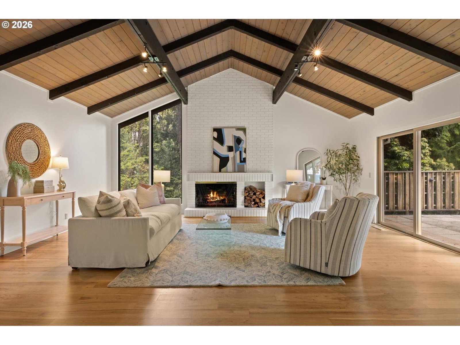 Mid-century retreat in prestigious Forest Highlands neighborhood. Tucked into a serene, tree-lined enclave just moments from Tryon Creek State Park, this 1962-built home offers the rare combination of architectural character, natural beauty, and meaningful system upgrades—creating an ideal canvas for your personal vision. Inside, classic mid-century design elements take center stage: soaring vaulted ceilings, exposed beams, and warm tongue-and-groove detailing that bring volume, texture, and timeless style. With 5 bedrooms, 3 full baths, and 4,146 square feet, the floor plan offers flexibility for a variety of living arrangements, creative spaces, or multi-generational needs. The heavy lifting has already been done. A meticulously maintained concrete tile roof, updated HVAC and water heater, electrical improvements, whole-house generator, updated water main, repaired sewer line, and refreshed front deck framing provide peace of mind—freeing you to focus on the design and style of the home. Separate exterior entrance to the lower level opens the door to a distinct living area—well-suited for multi-generational living, guest quarters, or flexible use depending on your needs. Wooded exteriors surrounding a calming back yard with apple, fig, pear and plum trees as well as producing blueberry bushes. Backing to protected greenspace within the Tryon Creek watershed, the property offers a tranquil, almost meditative connection to nature—yet remains just minutes from trailheads, bustling First Addition Lake Oswego, and top-rated Forest Hills Elementary School. Surrounded by luxury homes in one of the area’s most sought after neighborhoods, this is a rare opportunity to bring your vision to life in a setting that supports it. A compelling blend of location, architecture, and investment opportunity — ready for its next chapter.