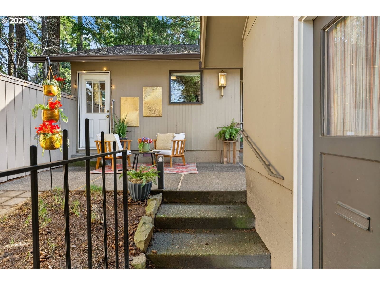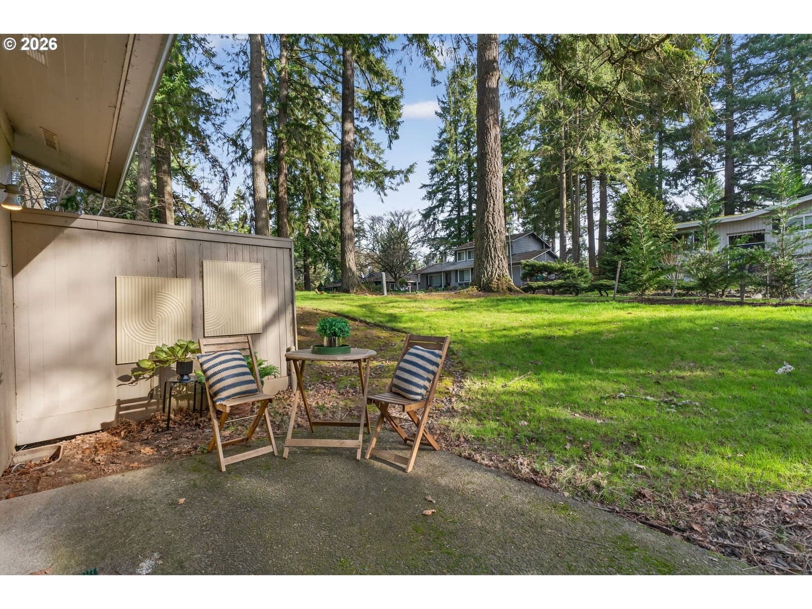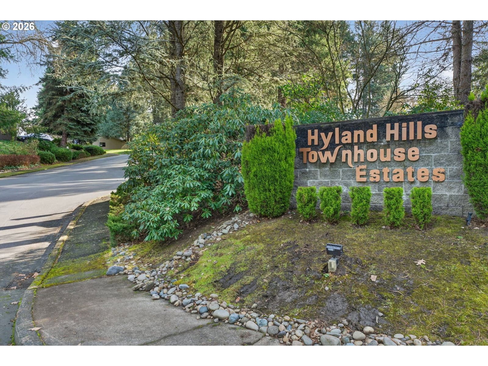 Enjoy low-maintenance, one-level living in Beaverton’s coveted Hyland Hills Townhome Estates. This delightful end unit is tucked among park-like grounds, instantly taking you from daily bustle to peaceful retreat. Enter through a private, gated courtyard that sets a welcoming tone before arriving at the carved wooden front door with original textured-glass sidelights- one of many vintage details that give this home its character. The entry introduces a smart, spacious floor plan that balances openness with definition, allowing each space to naturally connect while remaining distinct. The well-equipped kitchen offers ample storage, a pantry, a laundry closet, and space for an eating nook. The dedicated dining room includes a wet bar that's perfect for entertaining, a nightly unwind, or setting up a dedicated coffee station. Flowing from there, the living room is anchored by a cozy gas fireplace and a wall of windows with a double-sliding door to the back patio and green space. Down the hall, two generous bedrooms are thoughtfully separated for privacy. The primary suite features a dual walk-thru closet area and an ensuite with a newer walk-in shower, while a full hall bathroom serves guests and the large secondary bedroom that's perfect for guest space or a home office. Across the courtyard, the oversized two-car garage adds exceptional versatility with a built-in workstation and abundant storage. Hyland Hills residents enjoy a community pool, athletic court, and private clubhouse, along with tree-lined walking paths throughout the neighborhood. Conveniently located minutes from Murrayhill, Nike, trails, parks, shops, restaurants, major commuter routes, and the nearby Hyland Woods Forest Park for outdoor escapes. HOA dues are $565/mo due on the first of the month, and a one-time $2k transfer fee will apply to the buyer. HOA handles exterior maintenance other than windows and doors.