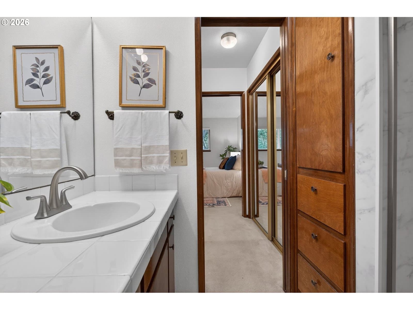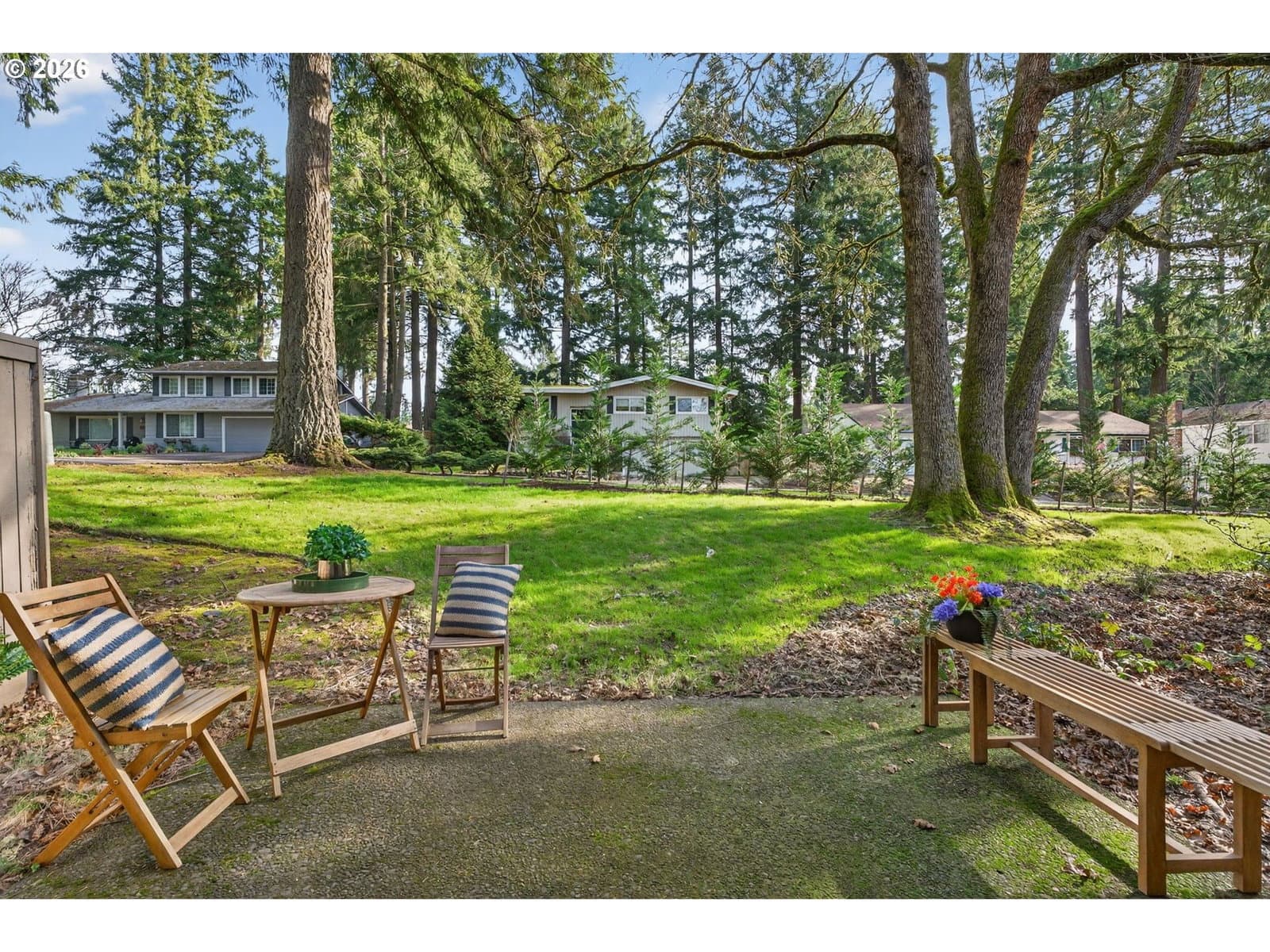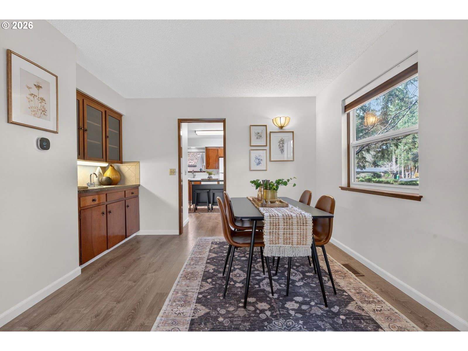 Enjoy low-maintenance, one-level living in Beaverton’s coveted Hyland Hills Townhome Estates. This delightful end unit is tucked among park-like grounds, instantly taking you from daily bustle to peaceful retreat. Enter through a private, gated courtyard that sets a welcoming tone before arriving at the carved wooden front door with original textured-glass sidelights- one of many vintage details that give this home its character. The entry introduces a smart, spacious floor plan that balances openness with definition, allowing each space to naturally connect while remaining distinct. The well-equipped kitchen offers ample storage, a pantry, a laundry closet, and space for an eating nook. The dedicated dining room includes a wet bar that's perfect for entertaining, a nightly unwind, or setting up a dedicated coffee station. Flowing from there, the living room is anchored by a cozy gas fireplace and a wall of windows with a double-sliding door to the back patio and green space. Down the hall, two generous bedrooms are thoughtfully separated for privacy. The primary suite features a dual walk-thru closet area and an ensuite with a newer walk-in shower, while a full hall bathroom serves guests and the large secondary bedroom that's perfect for guest space or a home office. Across the courtyard, the oversized two-car garage adds exceptional versatility with a built-in workstation and abundant storage. Hyland Hills residents enjoy a community pool, athletic court, and private clubhouse, along with tree-lined walking paths throughout the neighborhood. Conveniently located minutes from Murrayhill, Nike, trails, parks, shops, restaurants, major commuter routes, and the nearby Hyland Woods Forest Park for outdoor escapes. HOA dues are $565/mo due on the first of the month, and a one-time $2k transfer fee will apply to the buyer. HOA handles exterior maintenance other than windows and doors.
