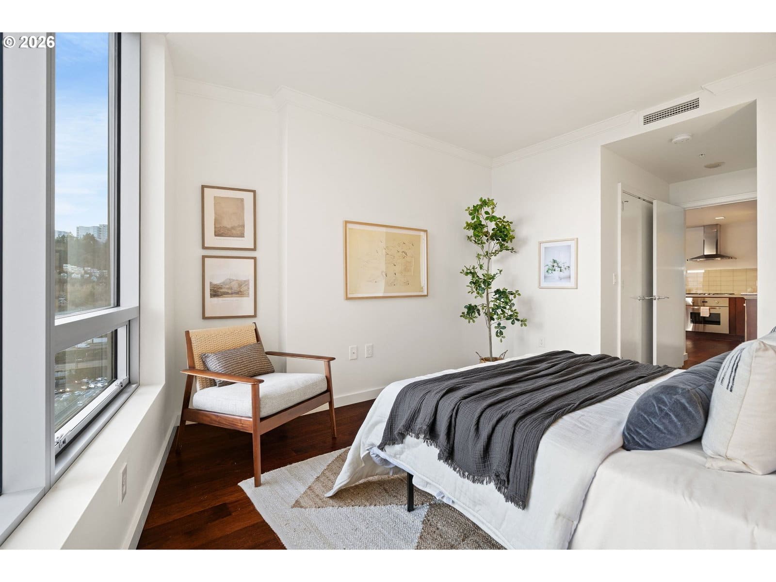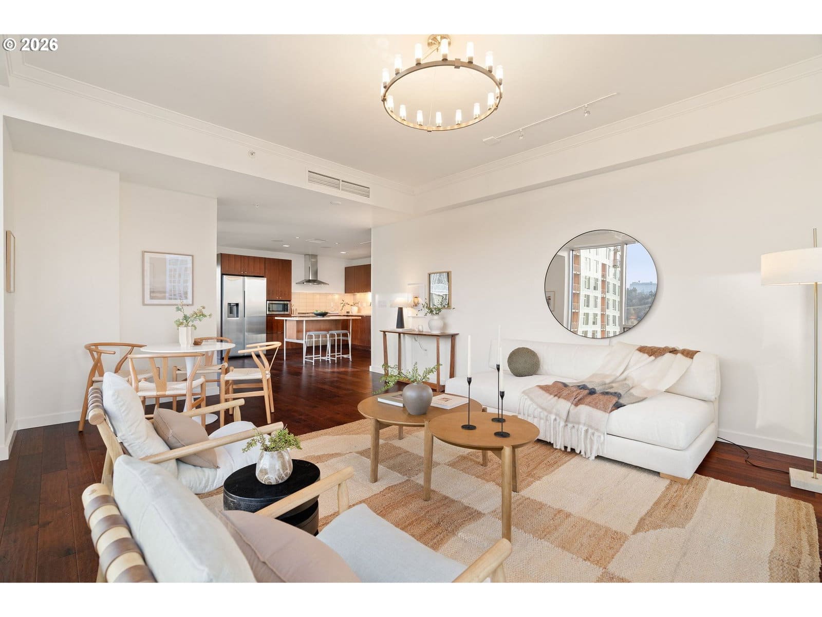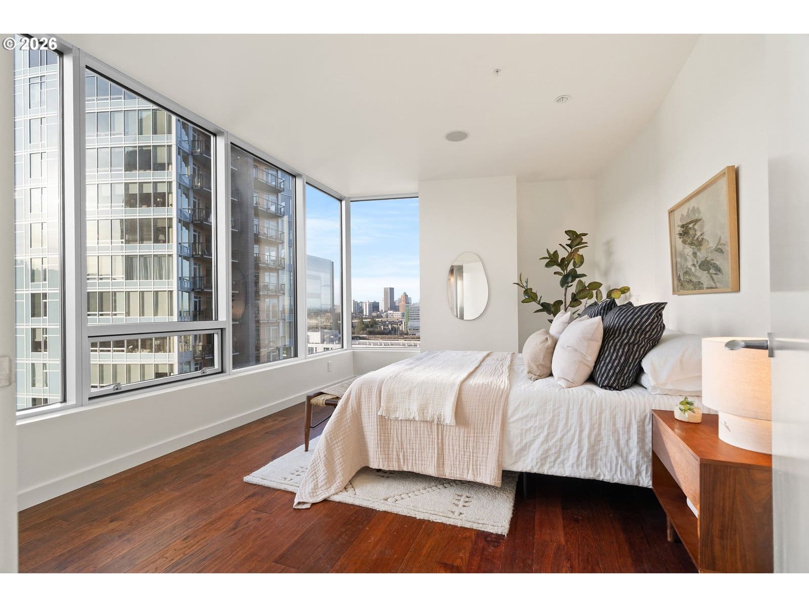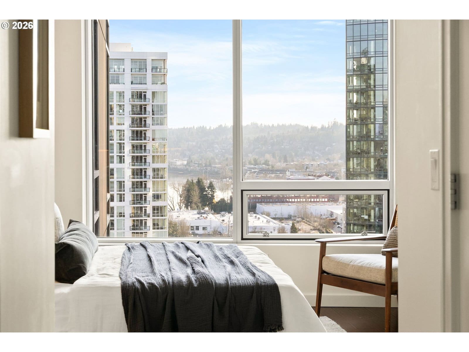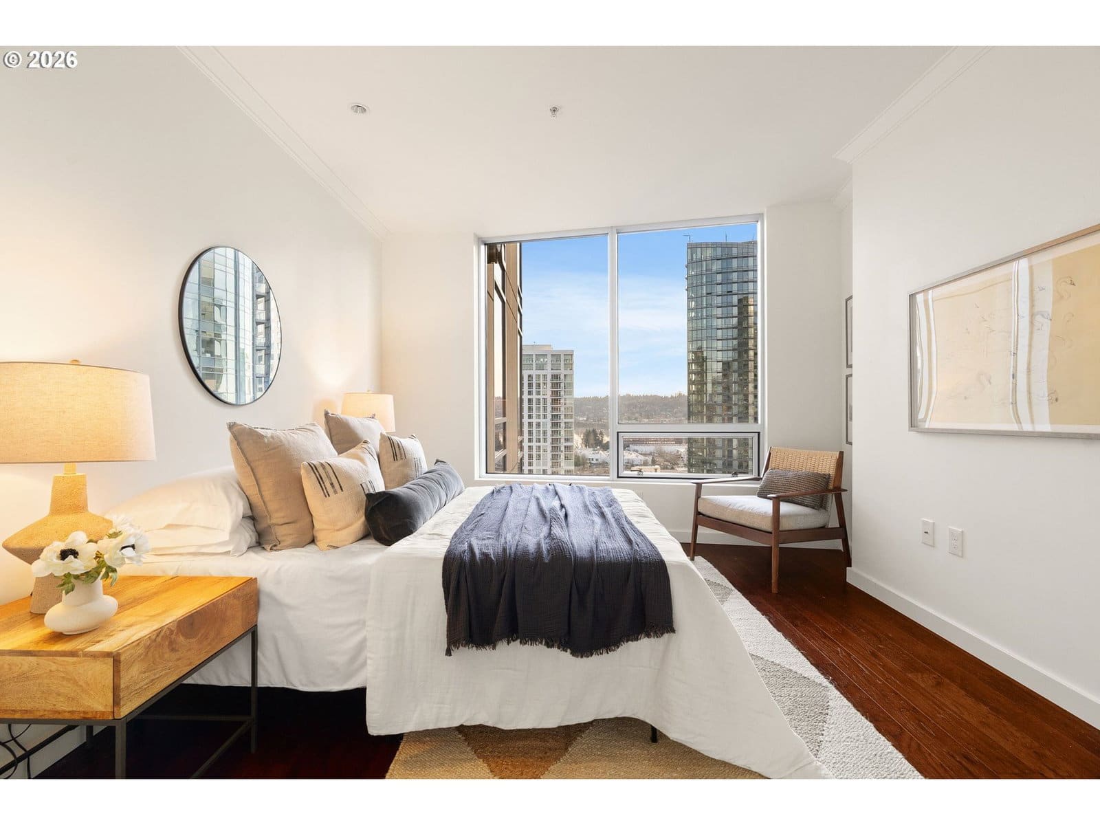 Beautifully updated two bedroom with panoramic views, 2 parking & storage in the coveted Meriwether in South Waterfront. This lovely home features North to South views of the Willamette River, west hills, city, bridges, and Mt St Helens. Desirable floor plan features a large ensuite primary bedroom, spacious kitchen with pantry & covered balcony. Home has been upgraded & elevated with wood floors throughout & elegant crown moulding. Building amenities include 24/7 concierge, a rentable guest suite, private guest parking & kayak storage. Enjoy life in the beautiful South Waterfront along the river with parks, restaurants, shops, fitness studios, Greenway, OHSU, Streetcar & more.