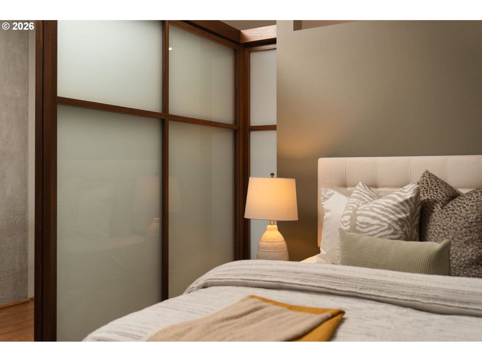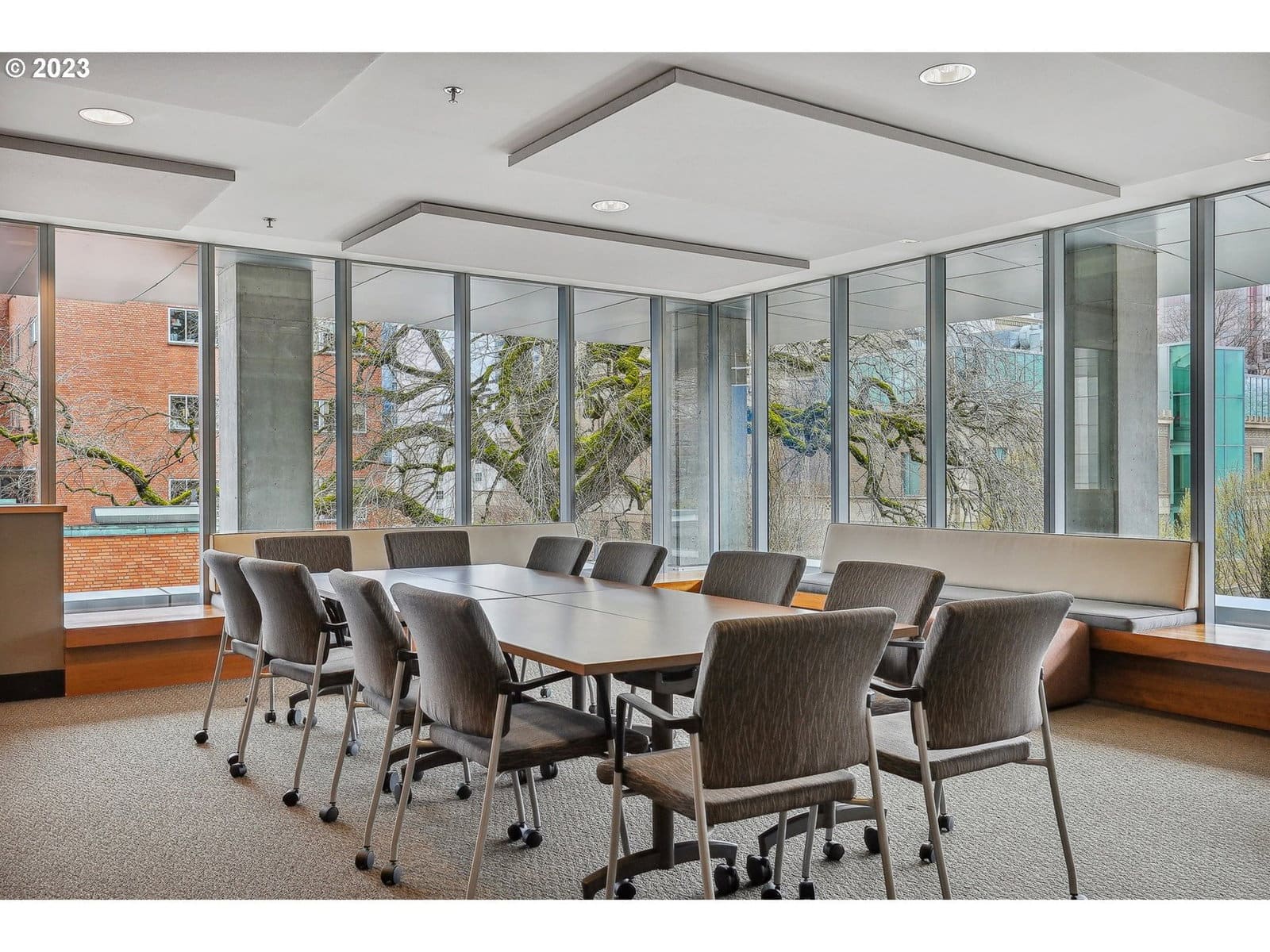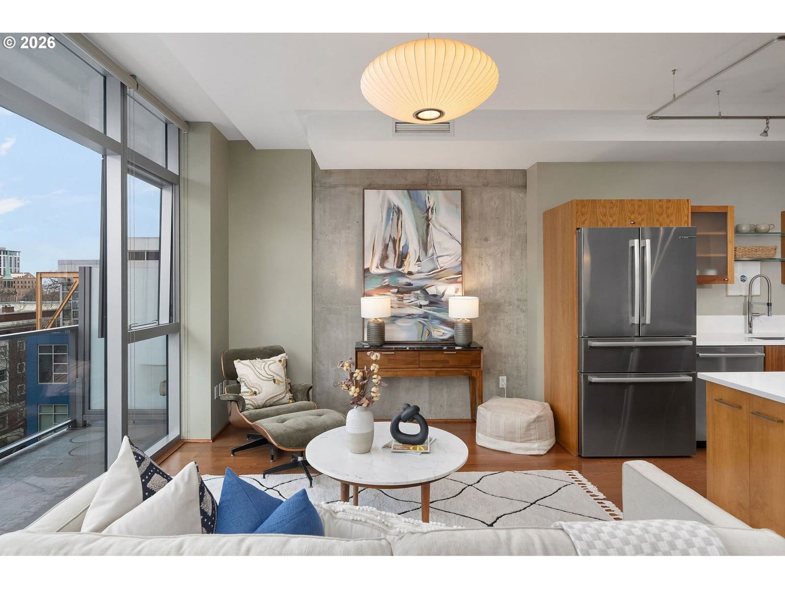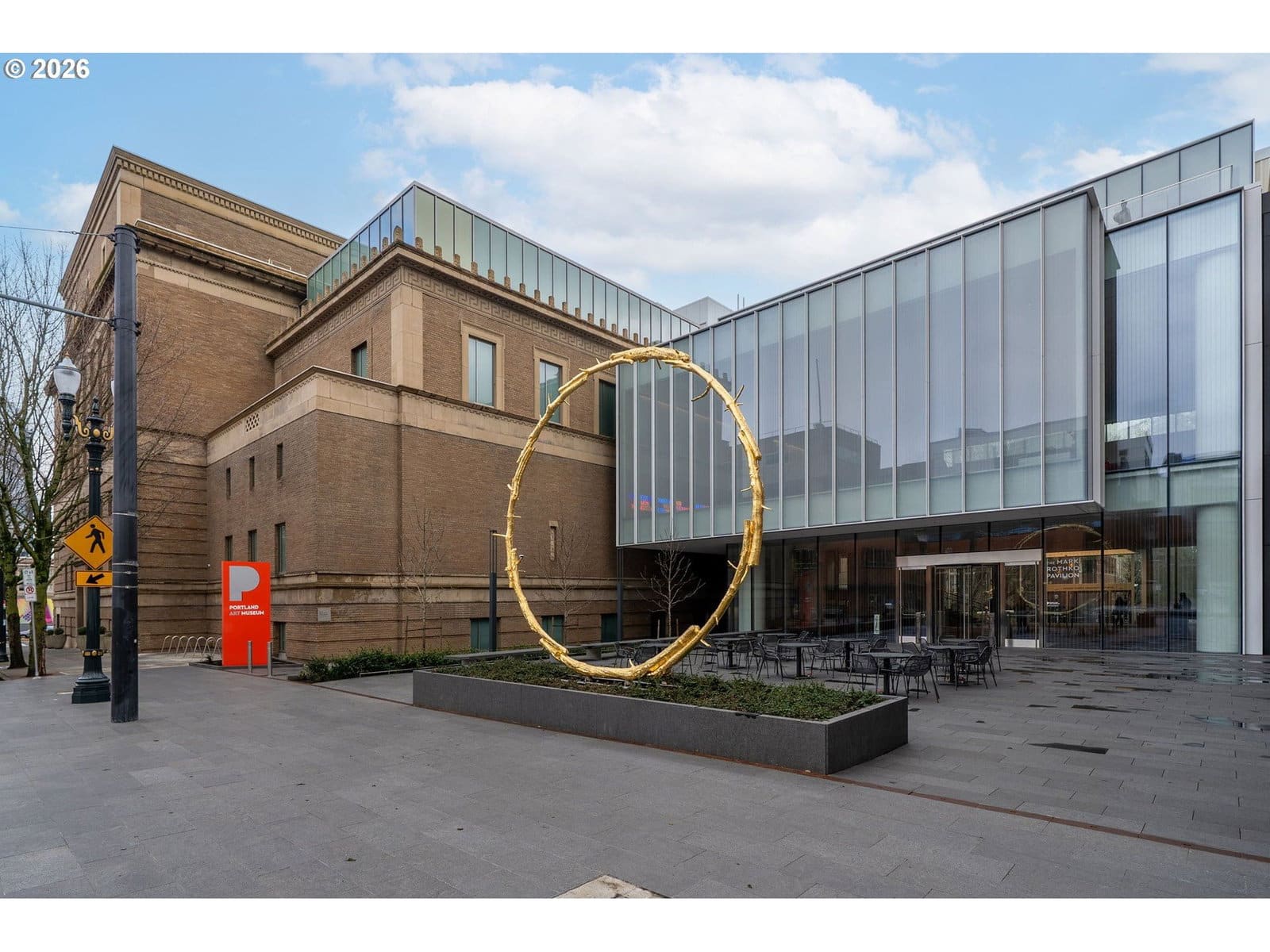 This chic, contemporary condo has gorgeous updates and designer touches. Floor-to-ceiling windows and a generous balcony offer perfect views of the sunset, West Hills, & the city. Enjoy cooking in the remodeled kitchen with stainless appliances, quartz countertops, refreshed cabinets, and a kitchen island with an eating bar. The open living area has accent walls perfectly suited for displaying art. A sliding glass wall gives the bedroom privacy & style. The bath is updated with new counters, lighting, faucet & hardware. Aside from the built-in closets, the extra large laundry room has a Miele washer & dryer and plenty more storage space. In the Cultural Arts District across from the new Rothko Pavilion at the Portland Art Museum, Arlene Schnitzer Concert Hall, Historical Society, downtown shopping, dining, and many transit options with the Streetcar. The Eliot is one of the best buildings with a gym, library, meeting room, 3rd-floor common deck & 24/7 concierge. Deeded, secure, corner parking space P2-86 is also included. EV charging can be added to the parking space at the new owner's expense.