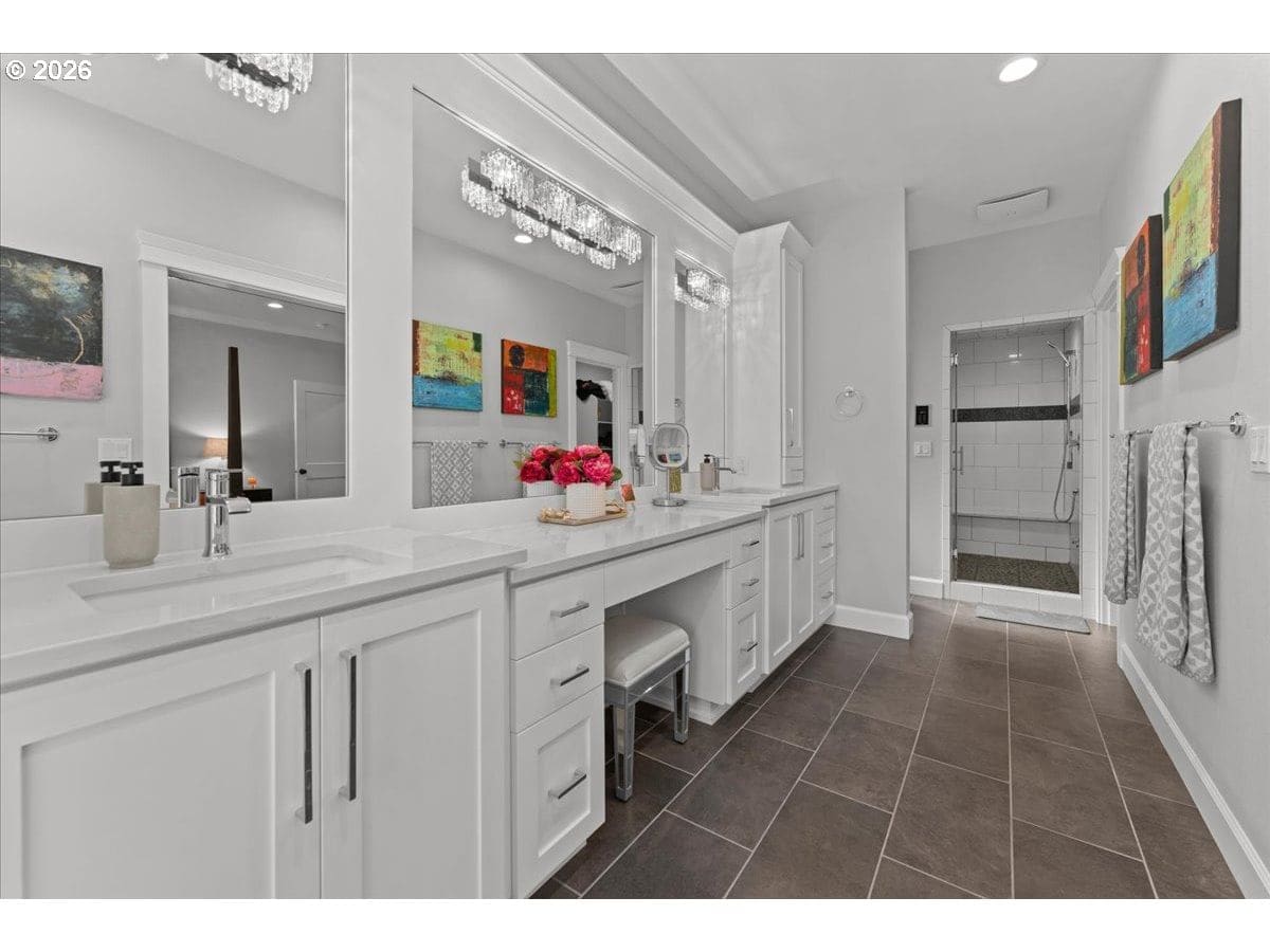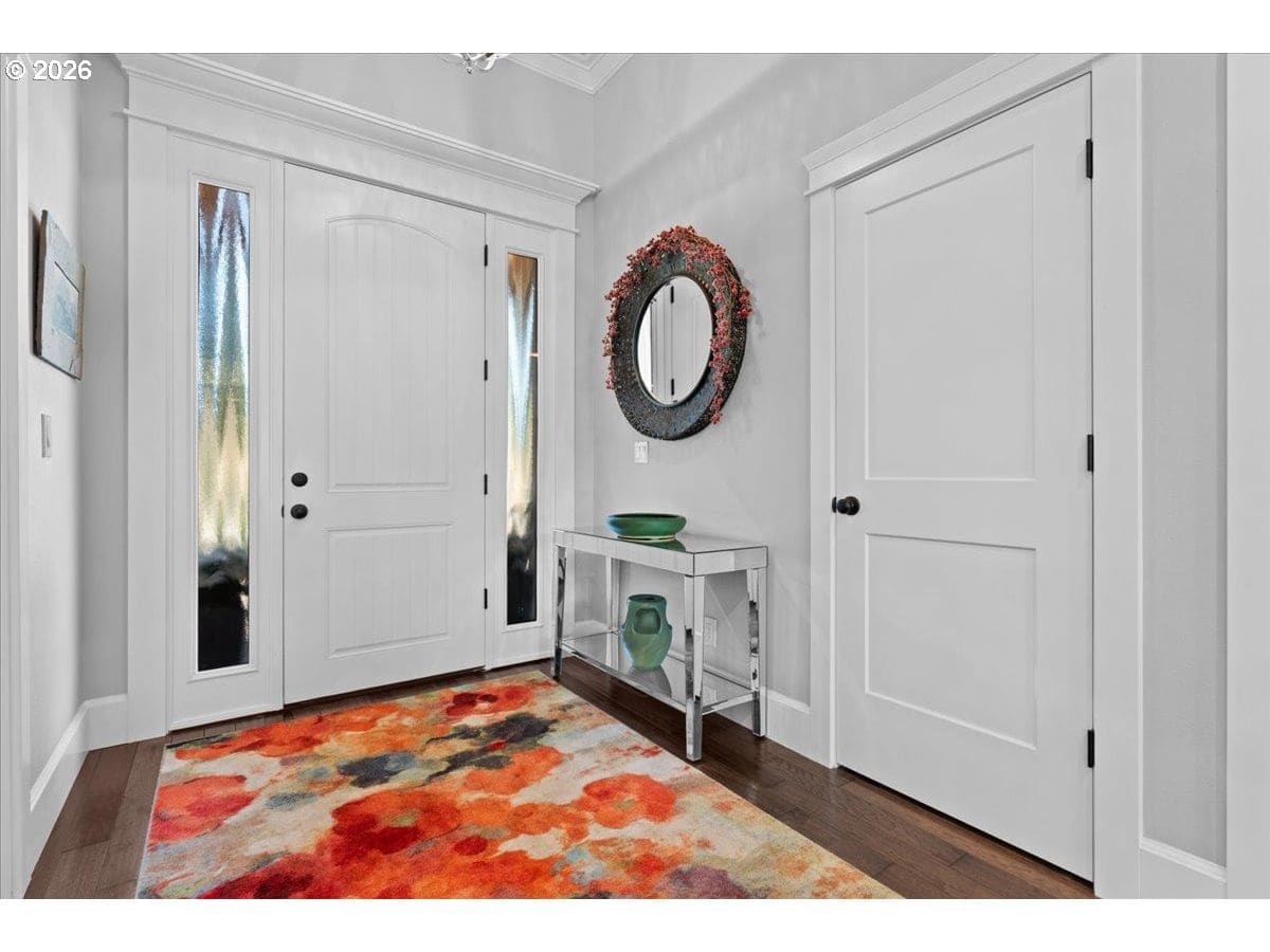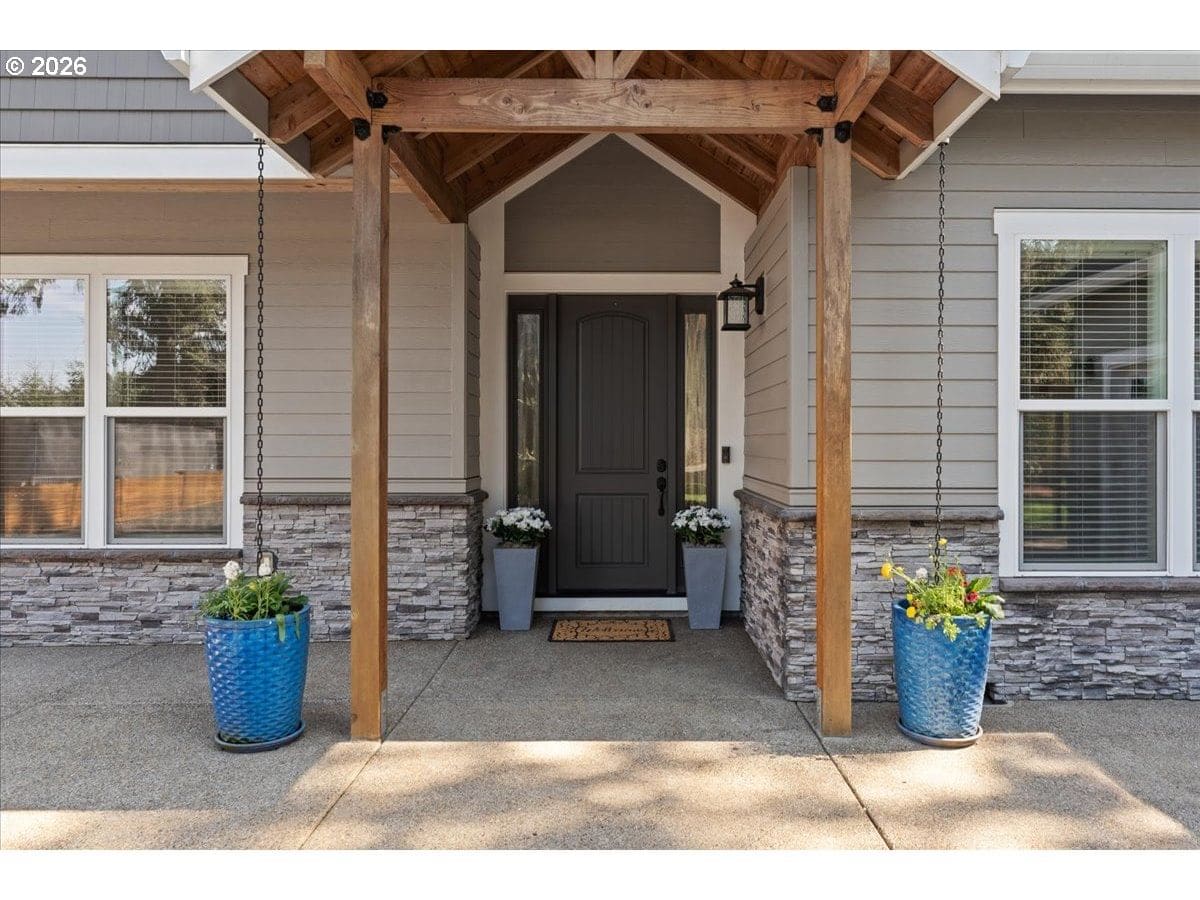 Situated on scenic Abiqua Creek, this 3,769 sq. ft., 5 bedroom, 3.5 bathroom residence blends thoughtful design with serene water views. All within minutes of historic downtown Silverton. A light-filled great room anchors the main level with box beam ceilings, a striking wall of windows to the creek, and a cozy woodburning fireplace—ideal for gatherings in any season. The open kitchen elevates everyday living with a massive quartz island, stainless vent hood, pot filler, custom cabinetry, and hidden pantry The main level primary suite lives like a spa retreat—double vanity, jetted soaking tub, and an oversized walk in steam shower. The main level also includes three additional bedrooms and an office with a full bathroom nearby. Upstairs, a flexible bonus/guest suite includes a kitchenette and full bathroom—perfect for multigenerational living, long term guests, or creative space. Step outside to tiered outdoor living: covered deck, lawn, and a built in firepit—plus a whimsical, custom two story treehouse with a large deck perched above the water for unforgettable creek side moments. The tree house can be used as a yoga studio, art studio, or just to enjoy the view. Practical perks abound: attached 3 car garage and RV parking; forced air heat and central A/C; double pane vinyl windows; and a backup gas fired generator.