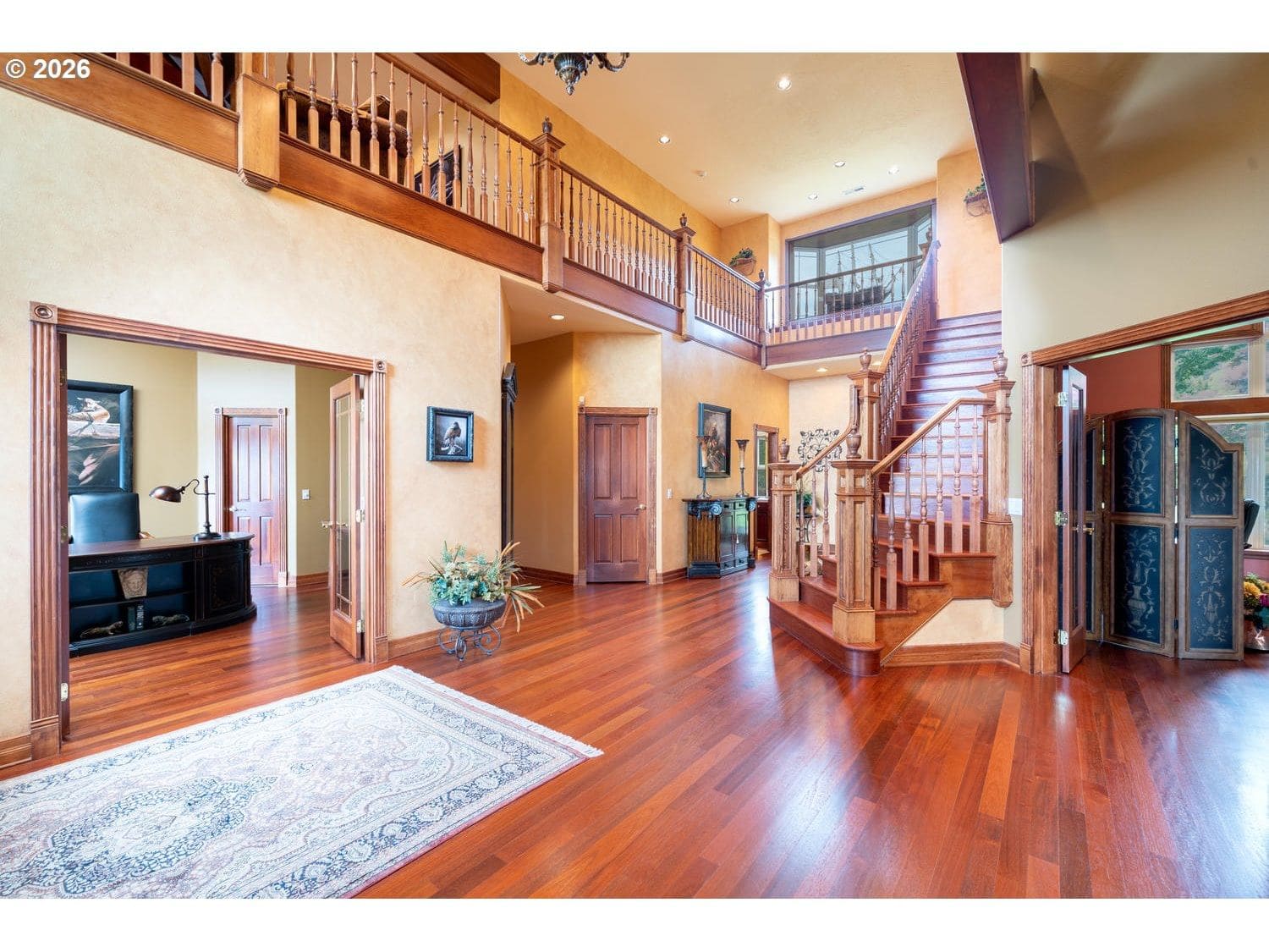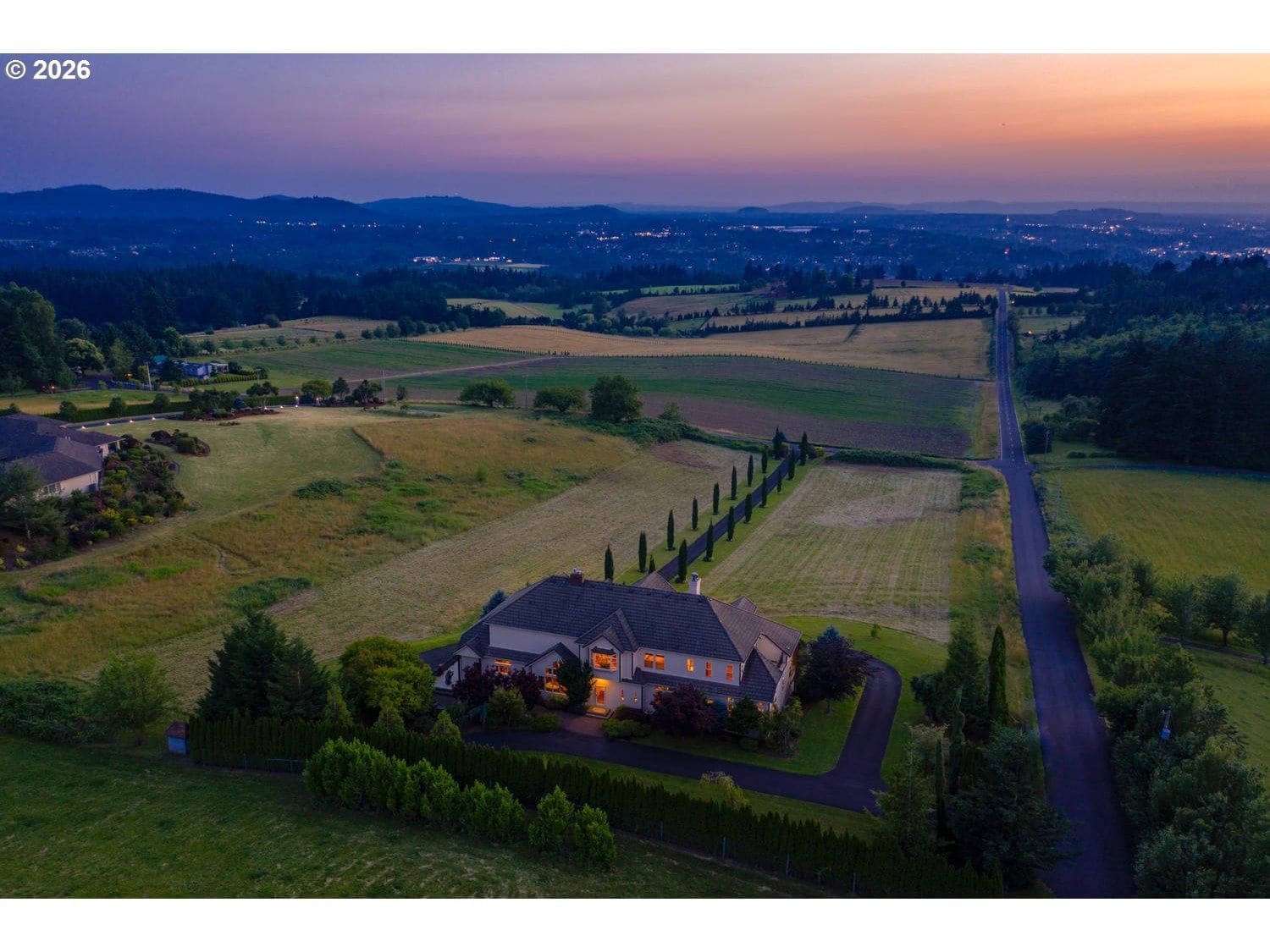 La Villa is a Georgian Farmhouse masterpiece designed with rigorous proportions & commitment to symmetry. Centered on the front facade, the grand entrance is in line with the entry gate & cypress lined drive. Windows look out to spectacular sunsets, sparkling city lights and rolling pastoral vistas. The open plan features timber beams, 19-foot ceilings, abundance of light flooding across Brazilian cherry floors, a chef's kitchen, sunroom, library, 4 fireplaces & a 22-car (3700sf) underground garage. A 20 min drive to PDX, amenities, dining & shops.