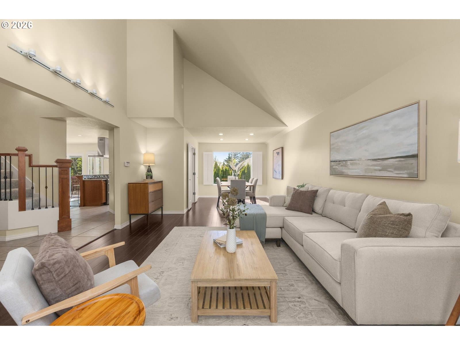 Tucked on a quiet Lake Oswego cul-de-sac just moments from Westlake Park and Cellini Park, this updated home offers a welcoming neighborhood setting with easy access to nearby trails and green space. Multiple levels of living space and several gathering areas provide a layout that offers both flexibility and room to spread out. The main level opens into the family and dining room, where vaulted ceilings and hardwood floors create an open, inviting feel. The kitchen features granite countertops, cherry cabinetry, tile floors, a five-burner gas range with double ovens, built-in Kitchen Aid dishwasher, and a freestanding three-drawer refrigerator. A garden bay window above the sink looks out toward the backyard, while the adjoining living room with a gas fireplace leads to the upper deck. Upstairs are three bedrooms, including the primary suite with its own gas fireplace, walk-in closet, and private bathroom with double sinks, jetted soaking tub, and skylight. The lower level adds even more flexibility with a large bonus room featuring a wet bar, an additional bedroom and full bathroom—ideal for guests, a game room, or multi-generational living. Sliding doors open to a covered deck and fenced backyard with raised garden beds and mature landscaping. Recent improvements include updated flooring and lighting, remodeled bathrooms, updated kitchen appliances, pull-out pantry shelving, newer rear siding, deck updates, landscaping improvements, newer furnace and water heater, and a newly installed garbage disposal. Located within Lake Oswego’s nationally ranked school district with convenient access to I-5, Hwy 217, and 99W. Open House Saturday 11a-1p!