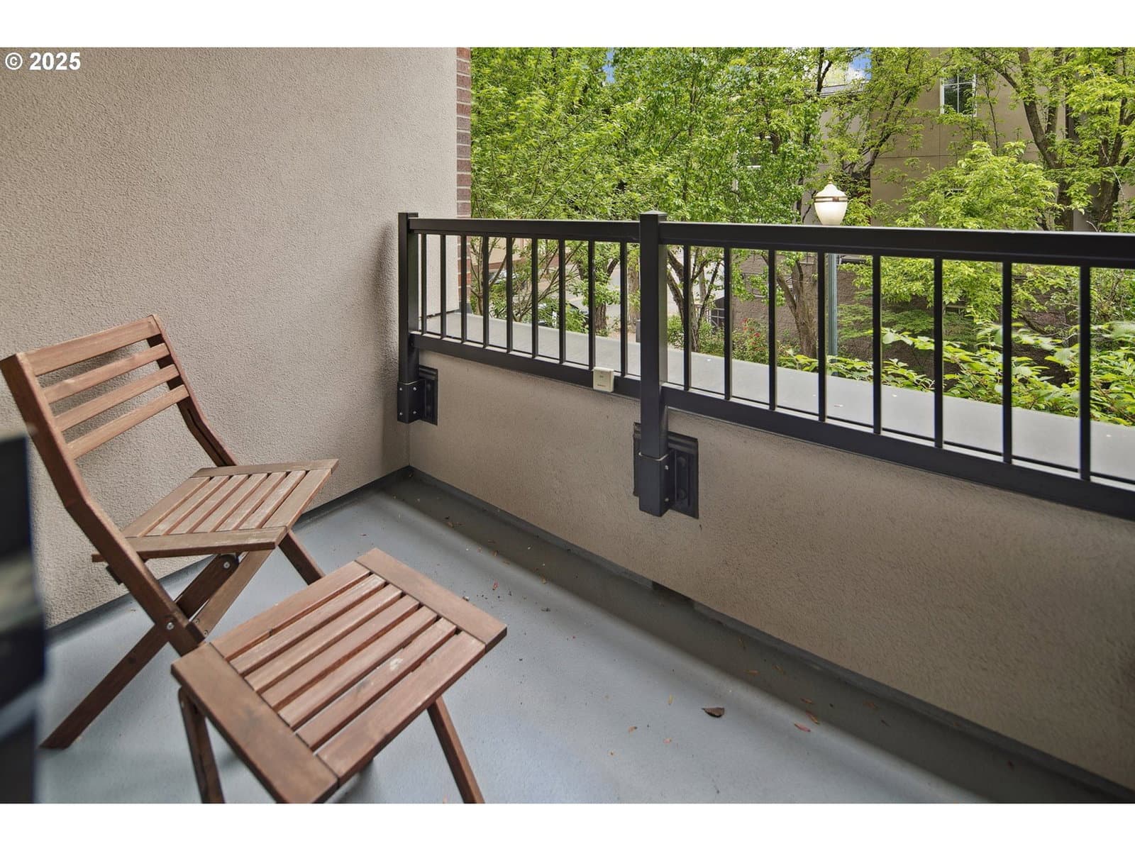 2 BEDROOMS w/ large closets! Stylish corner unit nestled in the heart of Portland’s vibrant Pearl District. Step into a light-filled sanctuary featuring wide-plank oak hardwoods, fresh interior paint, and updated appliances that blend comfort with modern flair. Expansive windows showcase tranquil views of the lush treed courtyard, along with west-facing city views.The open-concept living and dining space flows seamlessly to a private, covered balcony—ideal for your morning coffee or a relaxing evening glass of wine. This same balcony connects to the guest bedroom, creating a quiet retreat. The primary suite includes a spacious walk-in closet, while a full-size laundry closet with built-in shelving near the entry adds to everyday ease and functionality. Recent exterior remodel (2022) delivered new siding, energy-efficient windows and doors, plus updated decks and railings. Your deeded parking space in the secure garage, additional storage, and pet-friendly policy make city living truly turnkey. No rental cap in the building.Step outside and be moments from amazing dining, art galleries, boutique shopping, parks, and the streetcar. This is Pearl District living at its finest—stylish, effortless, and unmistakably Portland.