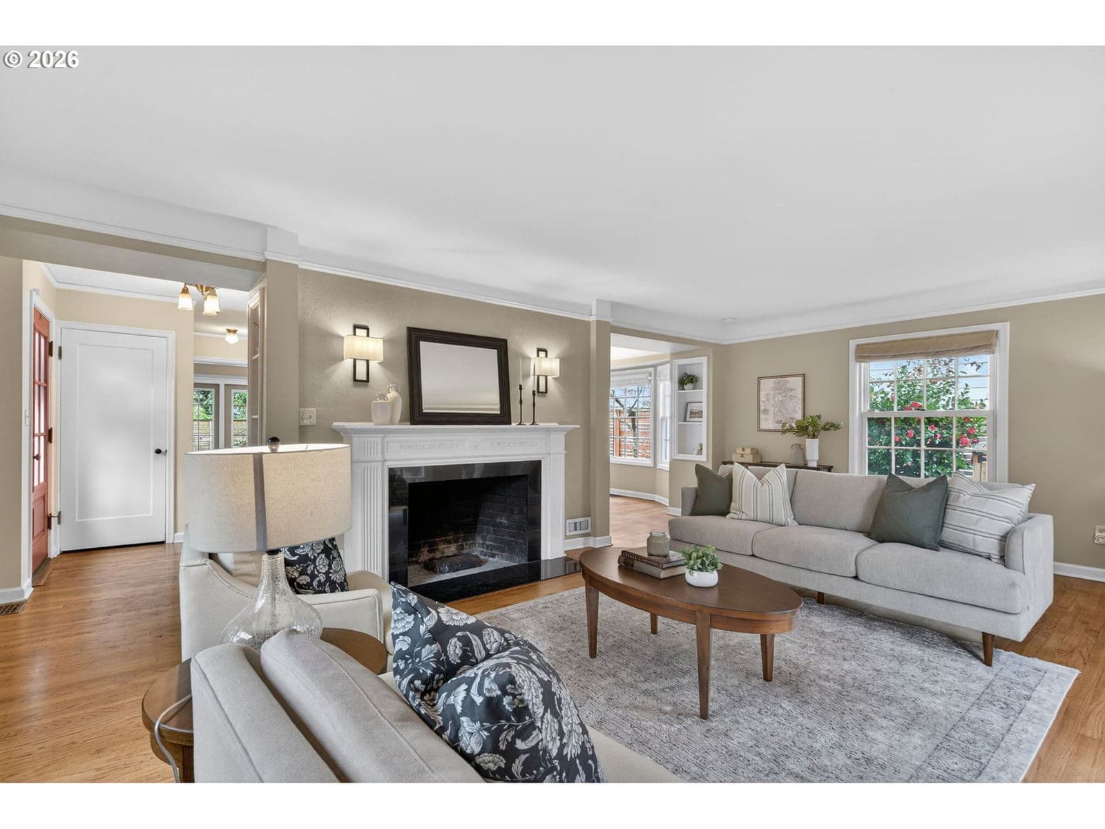 ***Offer Deadline Sat. 2/21 at 2:30pm*** Open House Sat. 2/21 12-2pm. Perfectly situated on a sun-drenched corner lot in the heart of the coveted Irvington neighborhood, this beautiful Colonial offers a rare blend of timeless character, charm and a functional floor plan. Just blocks from local shops, cafes, and parks, this home is designed for both quiet daily living and effortless hosting. The main level glows with natural light throughout and features a circular flow, beginning in the entryway and proceeding into an oversized living room anchored by a wood-burning fireplace, picture rail detailing, and French doors leading to a "perfectly petite" side patio. Enjoy meals in the formal dining room, complete with period built-ins and a large bay window. The updated kitchen serves as the heart of the home, boasting travertine tile floors, SS appliances, and a seamless flow into a flex space perfect for a family room, extra dining area, reading nook + more. A second set of French doors leads directly to the backyard, complemented by a main-floor half bath. Retreat upstairs to the primary suite complete with vaulted ceilings, a cozy reading nook, and a walk-in closet. The en-suite bathroom is functional and bright, offering a tiled shower and skylight. Two additional bedrooms—one featuring a charming "secret hideaway"—share a second full bath with a double vanity. The lower level provides a versatile bonus room ideal for an office or guest suite, plus a half bath, utility room, and extensive unfinished storage for all your PNW gear. The fully fenced backyard is an entertainer’s dream. Enjoy summer gatherings on the large patio surrounded by mature foliage, fruit trees, and roses. The yard is ready for the garden enthusiast with raised beds, full irrigation system and garden shed. Modern essentials include: premium Marvin wood windows throughout, a high-efficiency heat pump for heating/cooling, heated tile floors, and secure off-street parking with an electronic gate. [Home Energy Score = 3. HES Report at https://rpt.greenbuildingregistry.com/hes/OR10241648]