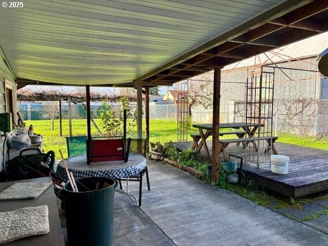 Vacant, move-in ready home on a large, level lot with a fully fenced backyard, wood deck, covered patio and garden boxes. The paved driveway allows RV parking. Features include a two-car detached garage with covered access, new roof (2025), freshly painted interior, remodeled bathroom with step-in shower, vinyl windows and hardwood floors in bedrooms (possibly under living room carpet). The finished 330 sq.ft. attic offers extra storage or playroom space, accessible from an interior staircase built to today's code. This well insulated home will keep you warm and cozy winters and cool in summer. Seller lives on this dead-end street and says it's a friendly quiet place to live.