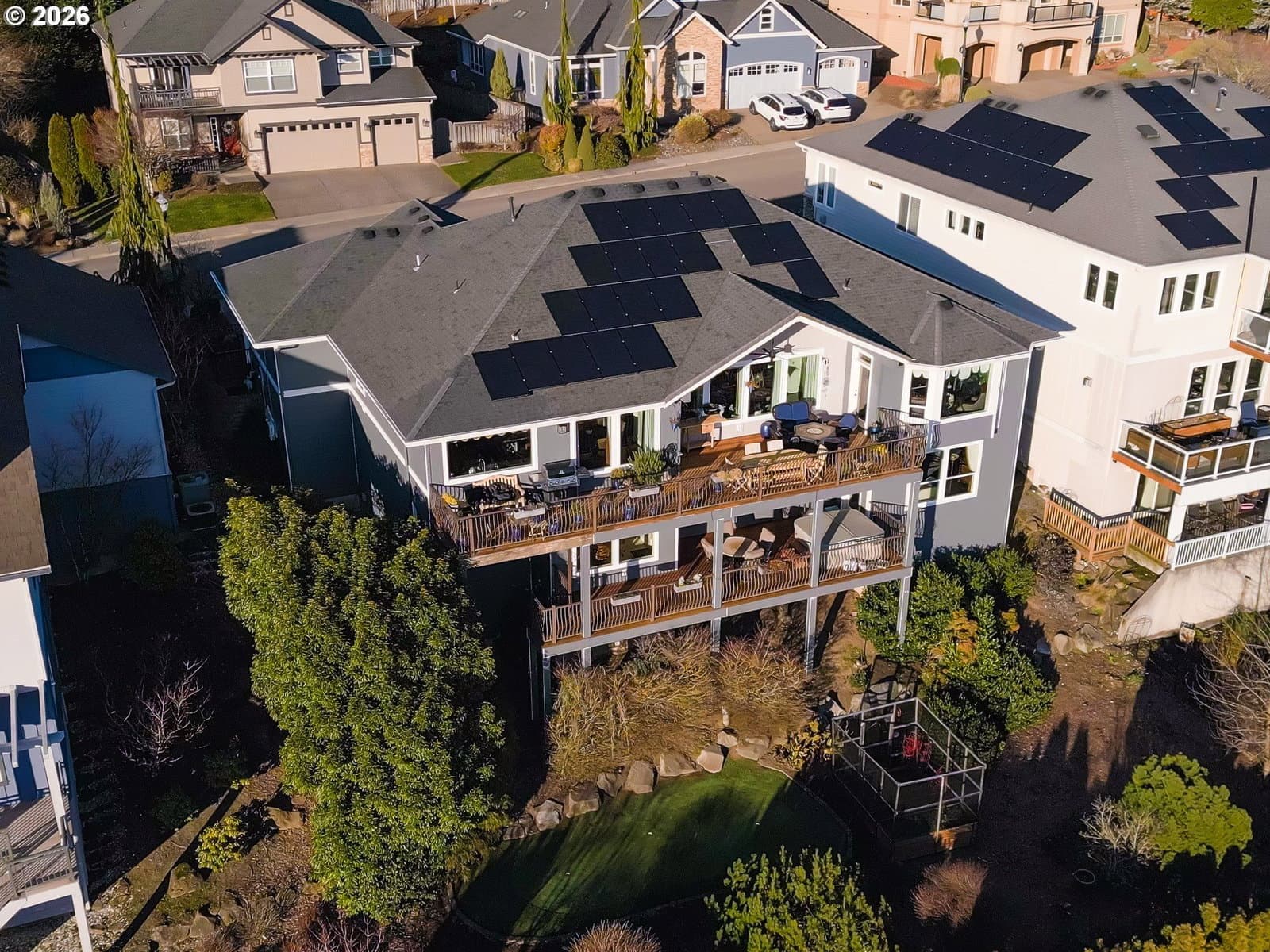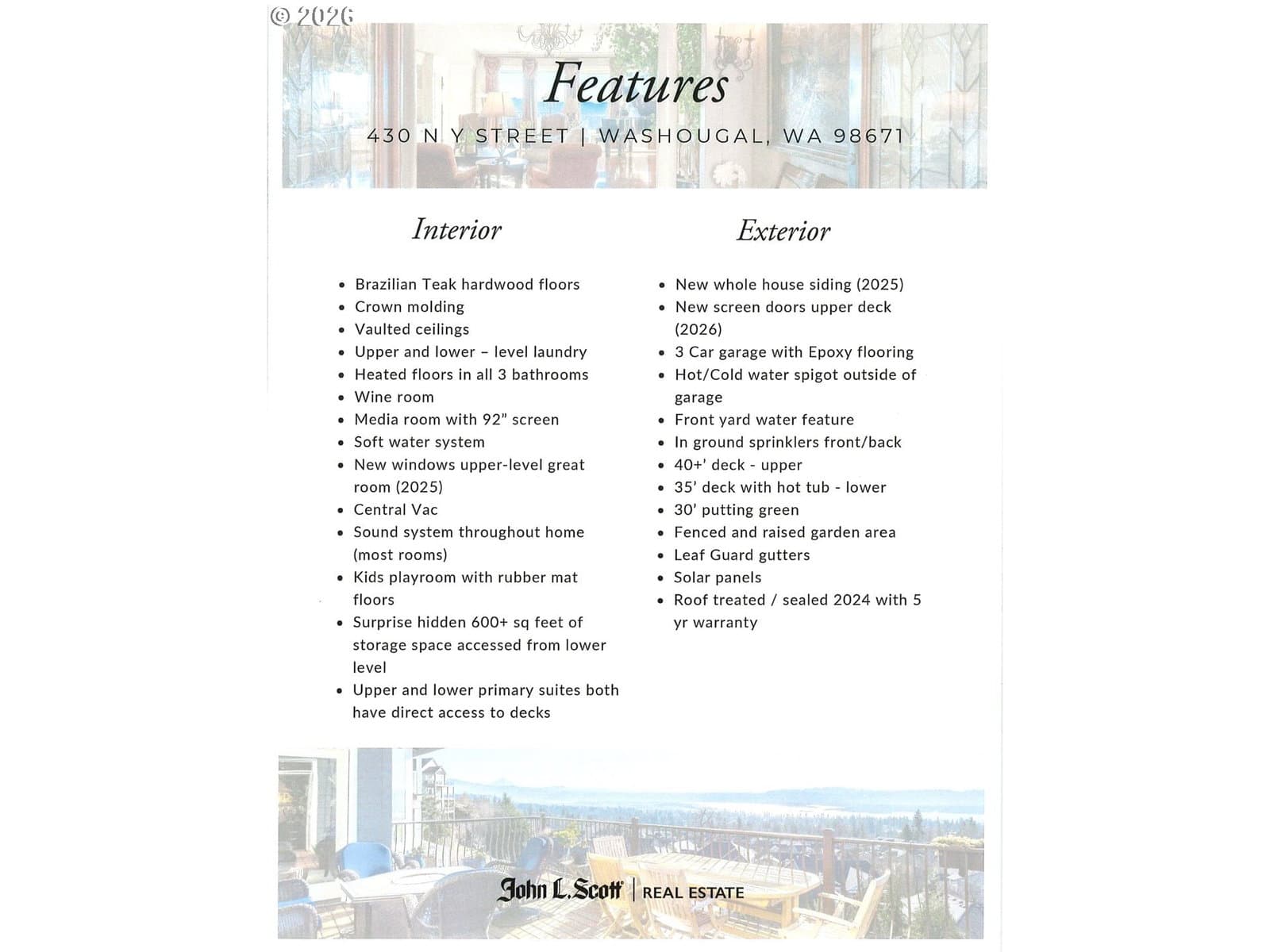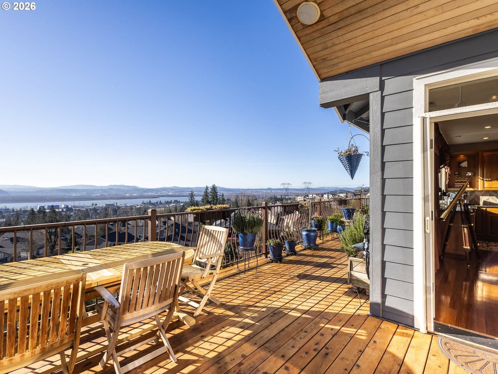Breathtaking panoramic views of the Columbia River, Mt. Hood, and the Portland cityscape set the stage for this exceptional 2004 Parade of Homes residence. Offering 4,700+ sq ft, this 4-bedroom, 3-bath home blends luxury, comfort, and thoughtful design.The main level features 2,475 sq ft of single-level, open-concept living with a spacious great room, gourmet kitchen, and a professional office. Brazilian Teak Hardwood floors, south facing picture windows with river views and a gas fireplace make this level a cozy retreat. Also on the main floor are a beautifully refinished full bath with heated floors, a second bedroom, and a laundry room with sink and ample storage. The primary suite is a true retreat, showcasing a bay window with seating area and direct access to the 40+ foot upper level deck. The ensuite bath includes a jetted soaking tub, 8-ft walk-in shower, double vanities, heated floors, and a walk-in closet.The finished lower level offers an additional 2,230 sq ft, including a second primary bedroom with access to the 35' lower deck and hot tub. This level also features a gaming area with wet bar, theater room, wine room, kids’ playroom, fourth bedroom, updated third bath with heated floors, and a second laundry/craft room, plus access to 600+ sq ft of storage. Outdoor living is equally impressive with mature landscaping, a putting green, and a fenced raised garden area. The 3-car garage features epoxy flooring and a exterior hot- and cold-water spigot for car washing. Brand-new siding (2025) wraps the entire home.Appliances staying with home. With too many features to capture here, this home truly must be seen in person. See the Features Sheet for additional details.OPEN HOUSE Sat 1/31 11am - 1pm and Sun 2/1 12pm - 2pm.