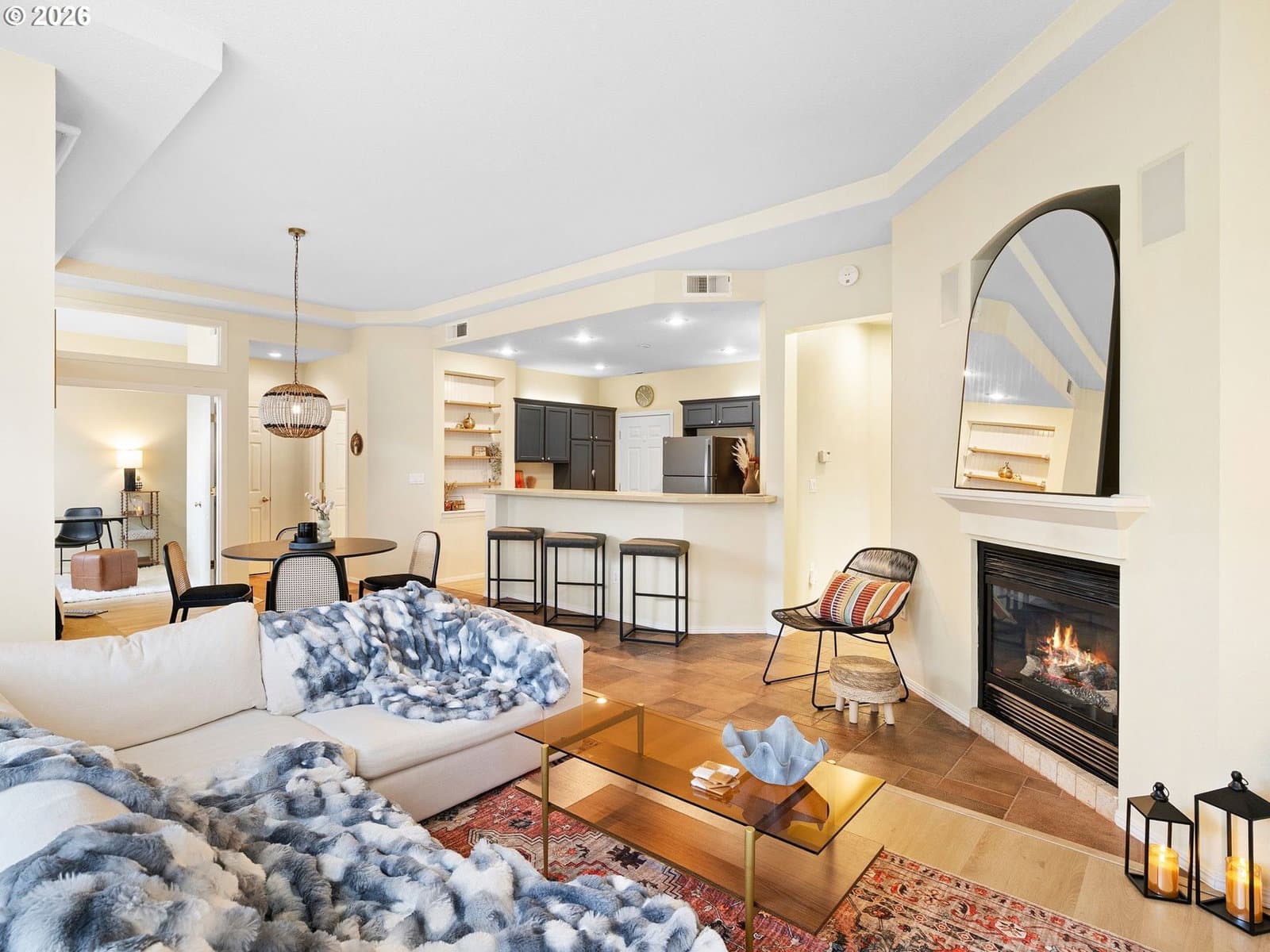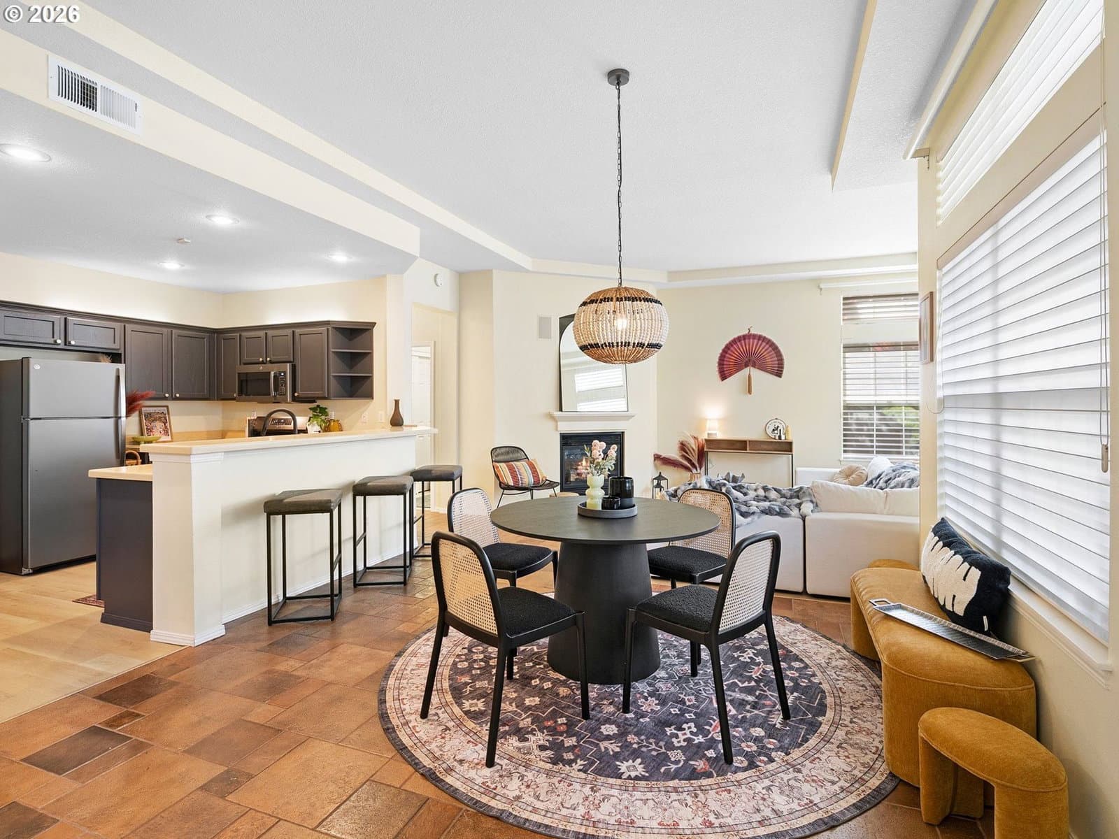 Welcome to this coveted ground-level condo in the heart of Orenco Station, one of Orenco Station’s most desirable communities. Thoughtfully updated and move-in ready, this home blends modern upgrades with effortless, walkable living in Hillsboro.Step inside to find soaring 12-foot tray ceilings and abundant natural light pouring through oversized windows, creating an airy and inviting atmosphere. The fully refreshed kitchen features brand-new GE appliances—including a gas range, microwave, dishwasher, and refrigerator—along with freshly painted cabinetry, updated hardware, and a sleek new faucet. New luxury vinyl plank flooring and stylish light fixtures run throughout, giving the home a clean, contemporary feel.The layout offers both comfort and functionality, with a dedicated laundry room complete with shelving and closet space, plus built-in solid wood storage in the garage. Step outside to your private patio—perfect for morning coffee or evening unwinding.Major exterior updates provide peace of mind, including a newer roof, gutters, and exterior paint (2020), along with a recently resurfaced pool (2024). Inside, enjoy premium upgrades like a California Closet system, surround sound in the living and primary spaces, Hunter Douglas blinds, and an alarm system.As part of the HOA, residents enjoy amenities such as a pool, hot tub, tennis courts, and convenient on-street parking. Located just steps from the shops, dining, and parks of Orenco Station—and minutes from the MAX Light Rail—this home offers an unbeatable combination of comfort, style, and accessibility. With easy access to major employers like Inteland Nike, plus nearby green spaces like Orenco Woods Nature Park, this location truly has it all.Don’t miss this rare opportunity to own a beautifully updated, ground-level condo in one of Hillsboro’s most sought-after neighborhoods.