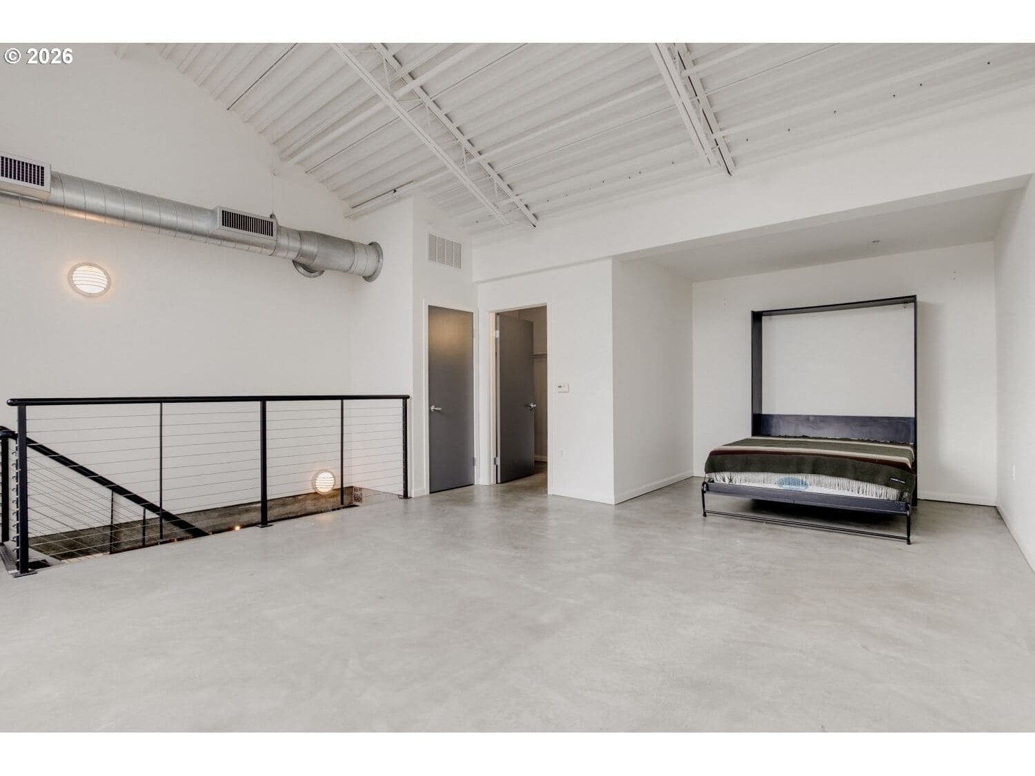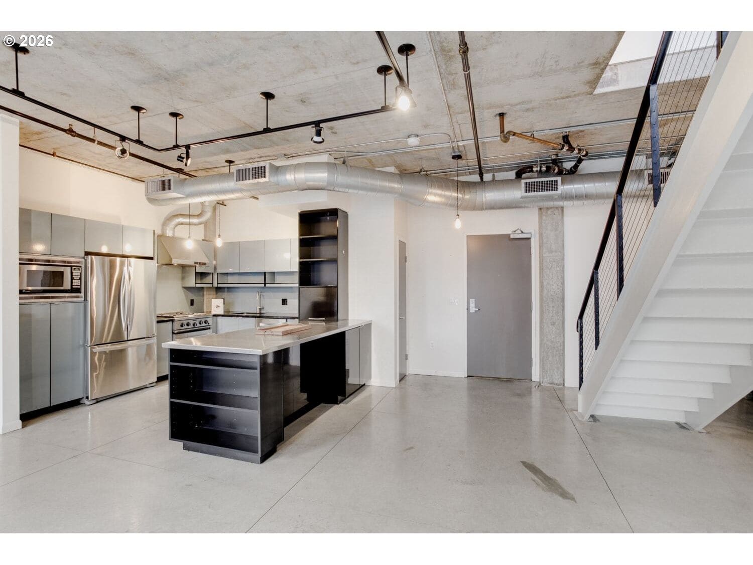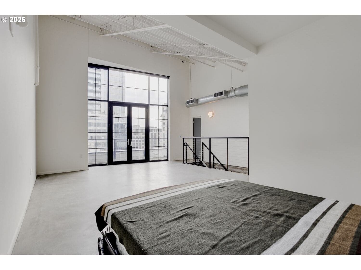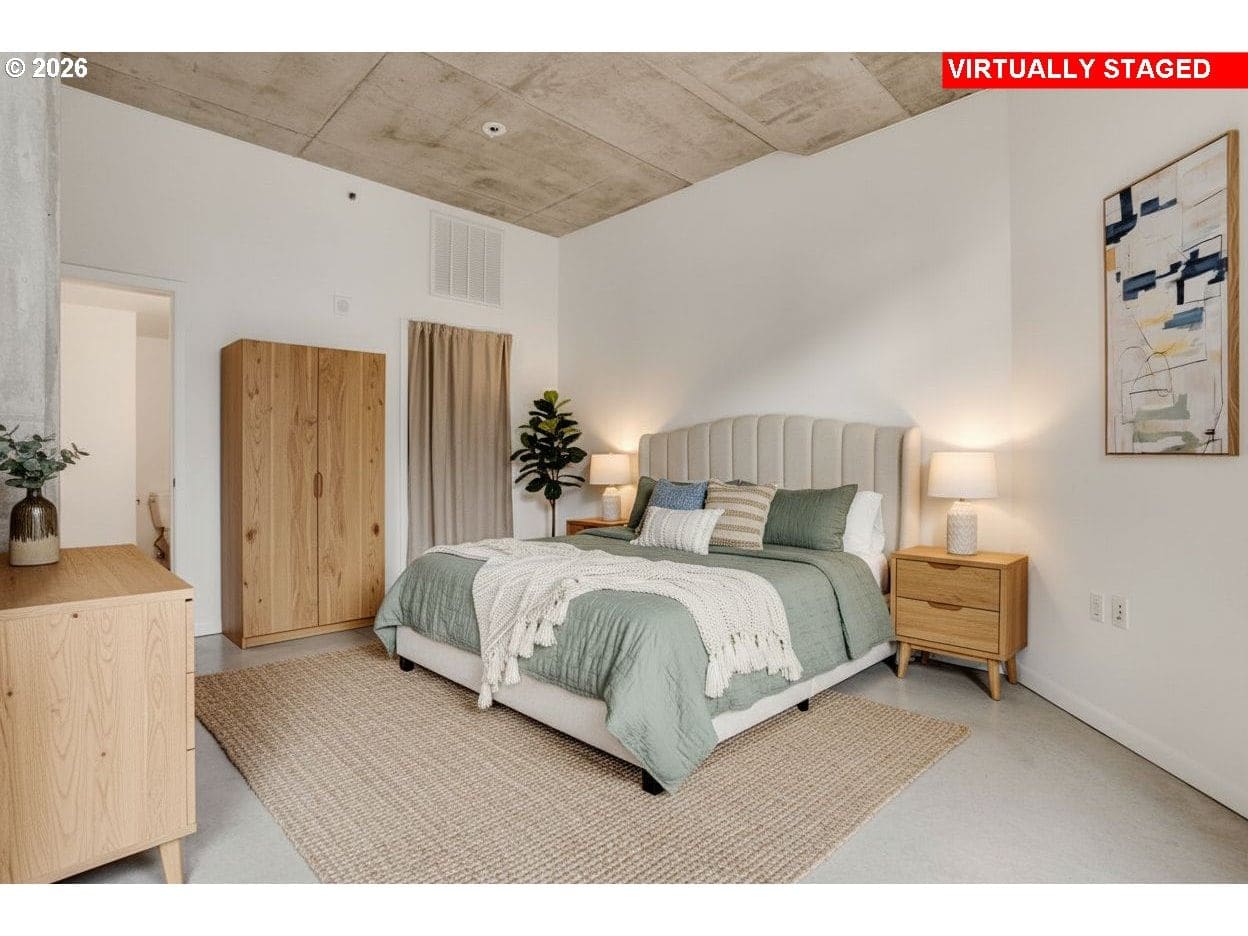 Step into this distinctive industrial-style condo in Streetcar Lofts. This two-story unit features 10–14 ft ceilings, polished concrete floors, and expansive east-facing windows that fill the space with natural light and offer city views overlooking a beautifully maintained courtyard.The main level offers an open-concept layout that connects the kitchen and living area with an electric fireplace next to the floor to ceiling windows. This floor also includes a bedroom with an ensuite bath, making it a versatile flex space that can be used as a dining room, home office, or guest suite.Upstairs, you’ll find a second living area well suited for a den, media room, or creative workspace. The primary suite features french doors that open to a private balcony, a walk-in closet, and a full bathroom with soaking tub, walk in shower, and washer/dryer. Streetcar Lofts offers a range of amenities including a security team, fitness center, community room, and a lush shared garden with BBQ areas. Water, sewer, and garbage are included in the HOA dues. The unit also comes with two side-by-side deeded parking spaces.