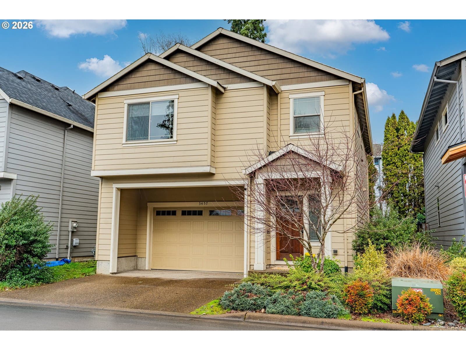 Tucked away at the end of a quiet cul-de-sac next to a park in a small Forest Grove community, this home brings personality, space, and comfort together in all the right ways. A covered entry sets the tone as you step into an open and airy main level where a cozy fireplace anchors the living room and the kitchen shines with stainless steel appliances, generous counter space, and loads of cabinetry made for real cooking and entertaining. A convenient half bath on the main floor adds ease, while the sliding door opens to a fully fenced backyard and patio ready for summer dinners, pets, and play. Upstairs is a flex space that leads to three bedrooms, including a standout primary suite with vaulted ceilings, a walk in closet, and a private en suite bath. A full bathroom and separate laundry room upstairs keep daily life simple, and a two car attached garage rounds out this feel good home that truly lives as well as it looks.
