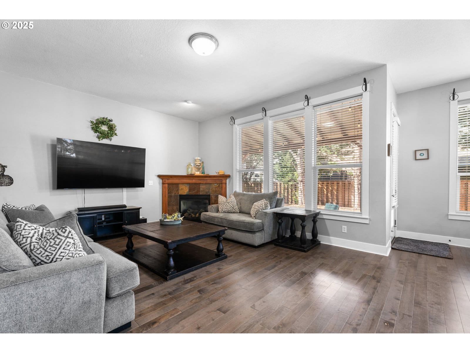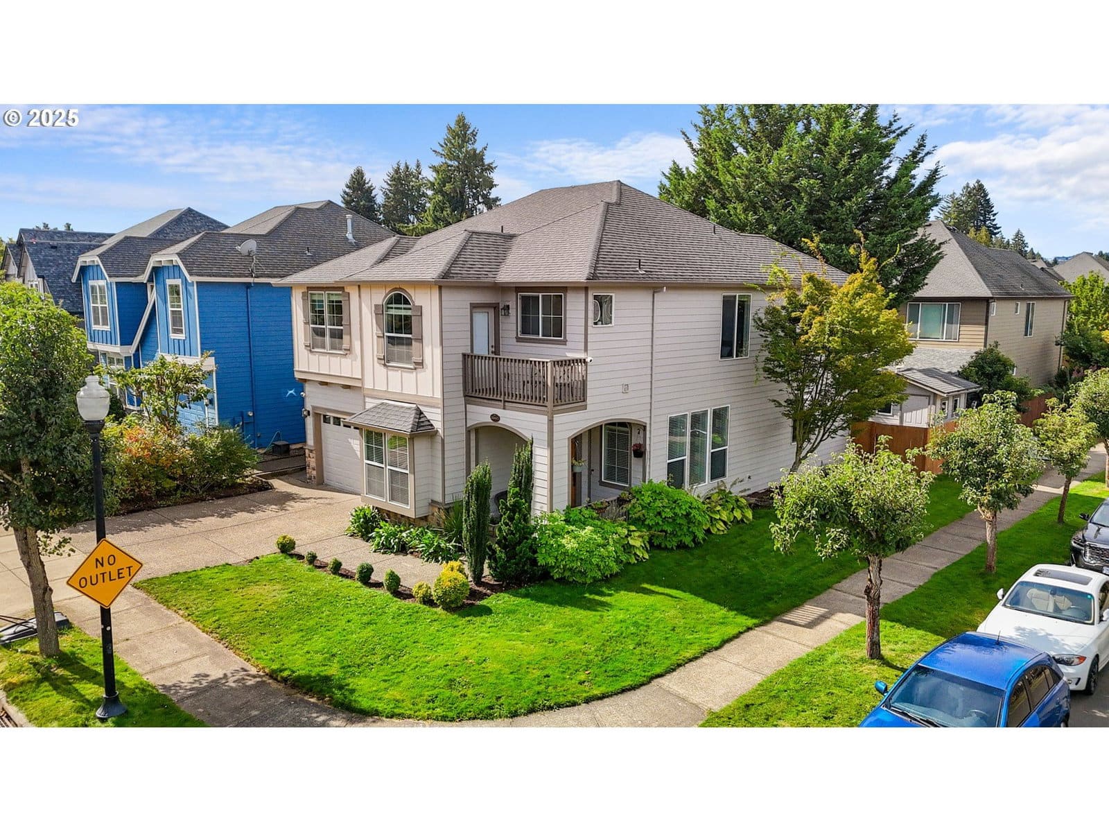 Beautifully remodeled home with quality finishes and thoughtful updates throughout. Main level features 11-foot ceilings, solid maple hardwood floors, and an open-concept kitchen and family room with gas fireplace. The kitchen includes quartz counters, large island, 5-burner gas range with back vent, convection oven, pantry, soft-close cabinets, wine fridge, and new Samsung refrigerator (2023). The Dining area, nook with patio slider, office with French doors, and half bath complete the main floor.Upstairs offers a primary suite with gas fireplace, coffered ceiling, walk-in closet, and bathroom with jetted tub, double sinks, and separate shower. Four additional bedrooms (one with balcony), a loft with built-ins, and a laundry room with tile flooring, butcher block counters, sink, and storage provide comfort and function.Outdoor features include a covered patio, raised garden beds, turf yard, paver walkways, and a shed. Oversized 2-car garage with tandem space, workbench, upper storage, and 1,200 lb. cable/winch. Fiber cement lap siding and solar panels installed 2021. Walking trail and dog station are down the street. Convenient location near shops, restaurants, and parks.