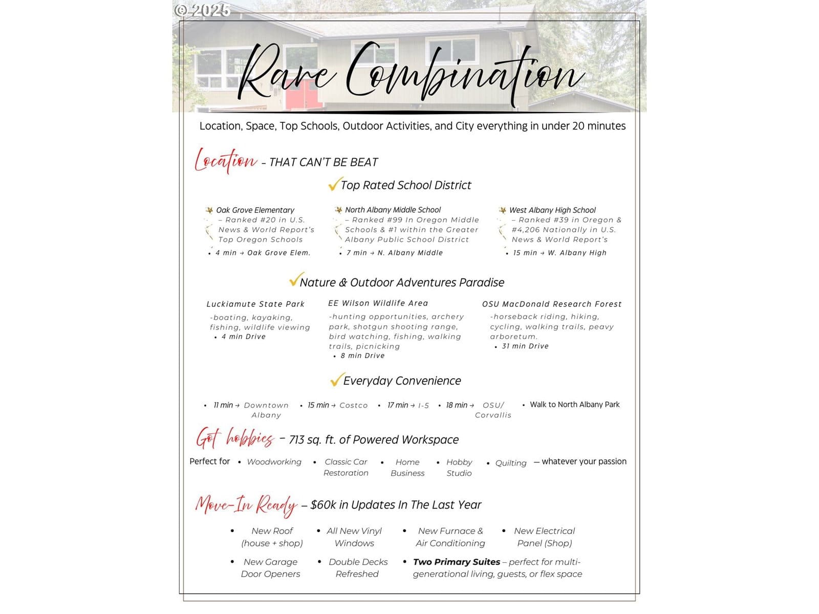 Discover comfort and privacy in this beautifully updated home on 1.24 wooded acres in NW Albany's desirable hills. With over $60,000 in recent improvements, including a new roof on the home and detached shop/garage, new vinyl windows, new furnace, new A/C, replaced shop electrical panel, and garage door openers, plus refreshed decks, it's move-in ready and shines inside out. Inside, two primary bedroom suites, dual fireplaces, and expansive windows flood the space with light and evergreen views. Entertain on the decks, unwind by the water feature or fire pit, or put the 23x31 insulated shop to good use. Prime Location for Outdoor Lovers and Families: the property has a park like feel, a children's play area, a natural spring. It's minutes from Oak Grove Elementary, the highest rated school in the area. Enjoy easy access to North Albany amenities and downtown Albany's vibrant scene – country privacy meets urban convenience! Don't miss this quiet haven – schedule your showing today!