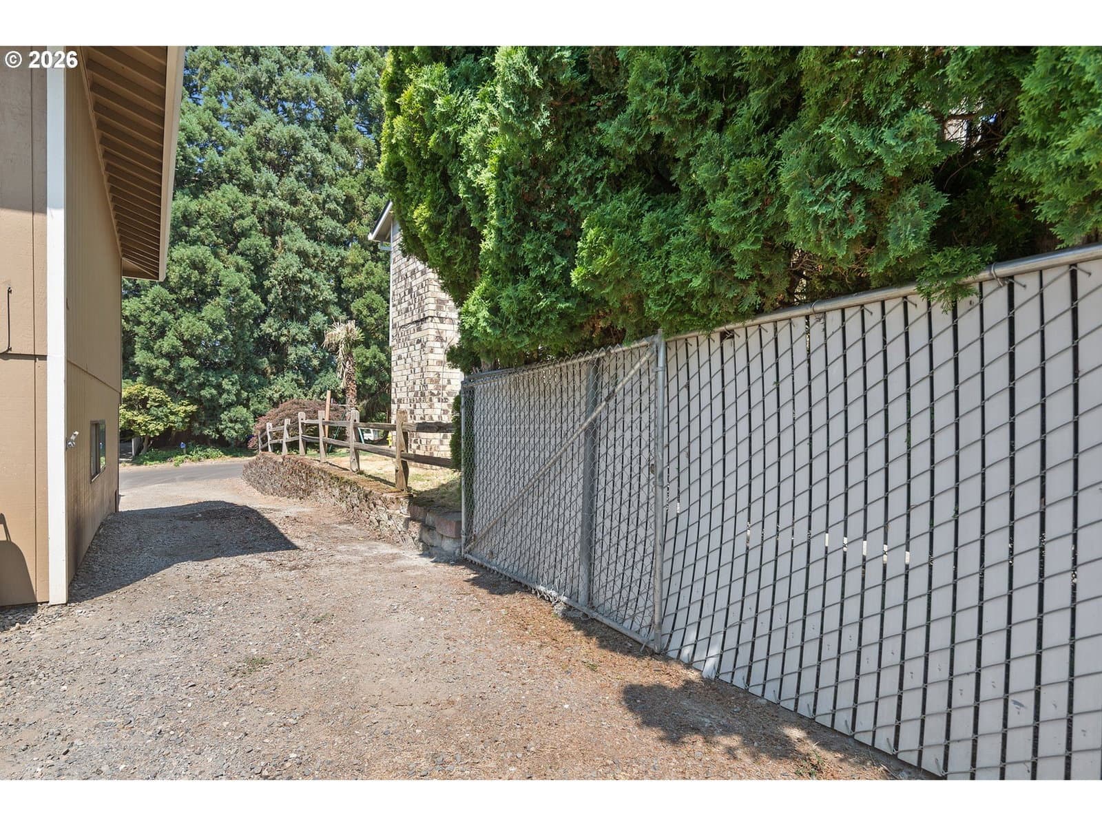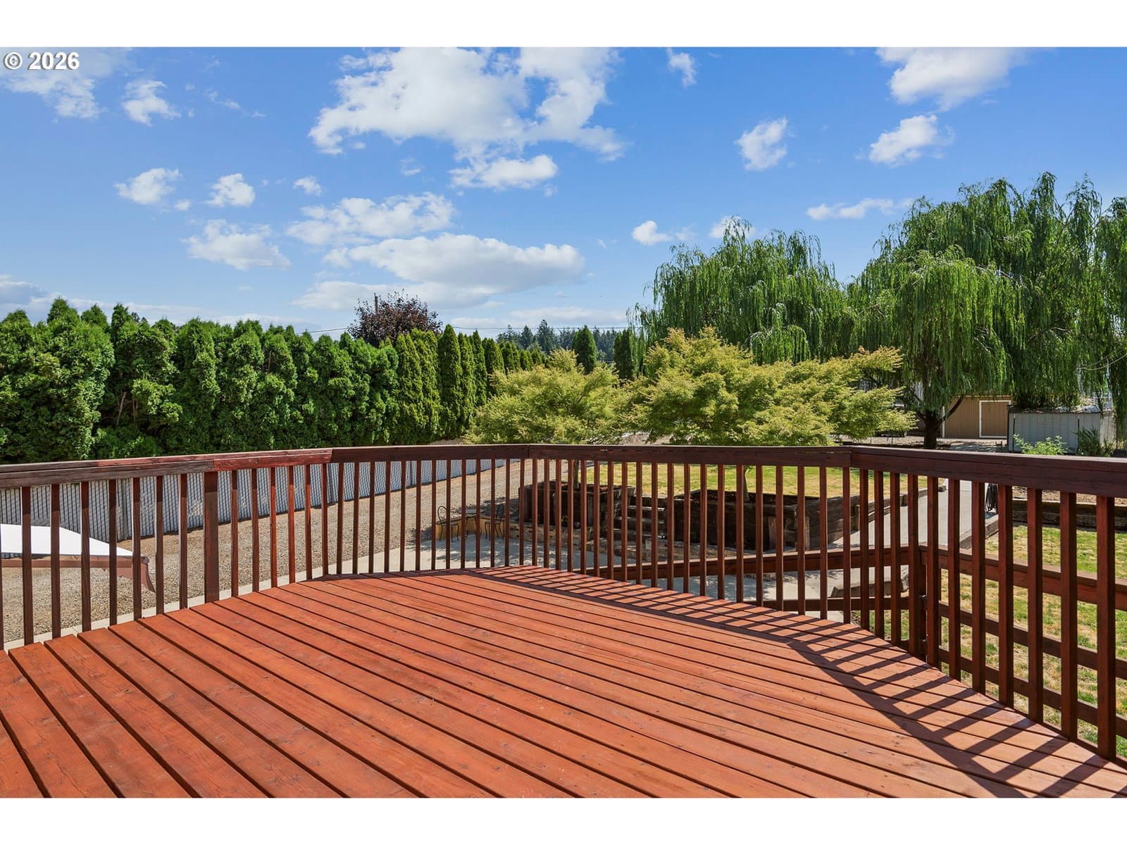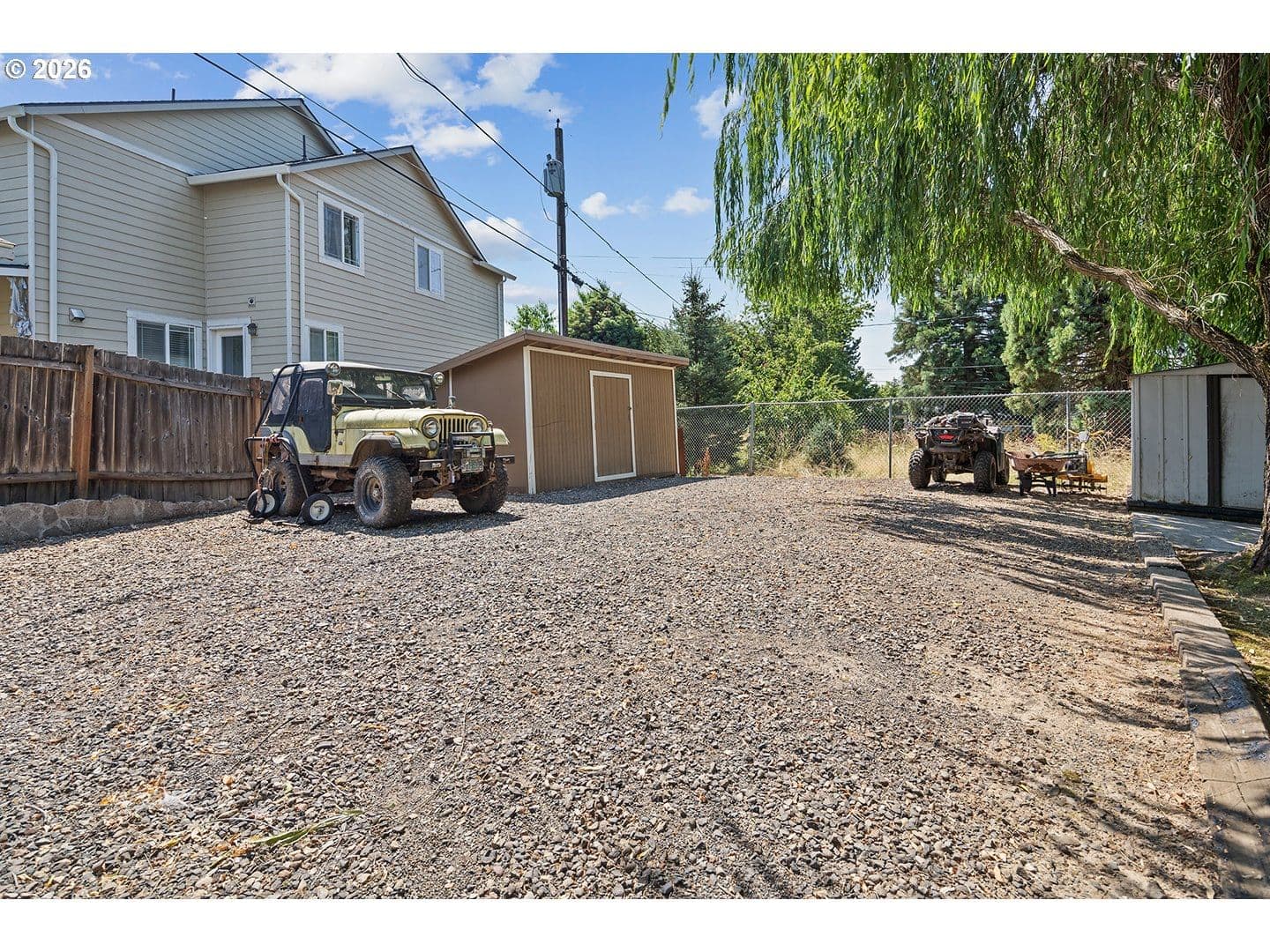 Rare opportunity to own a thoughtfully maintained home on an oversized lot in close-in Happy Valley, offering exceptional flexibility both inside and out. The interior features a well-appointed kitchen with granite countertops and travertine tile floors, remodeled bathrooms with extensive tile work, a spacious living room, two fireplaces, and the confidence of a newer roof and furnace. The lower level provides outstanding versatility with a large bonus room complete with a wet bar, a third bathroom, a separate media room that could function as a fourth bedroom, and an additional flex space ideal for a home office, craft room, or storage, with plumbing already in place to add a full bathroom if desired. Outside, the expansive backyard truly sets this property apart, featuring a massive wood deck, concrete patio with seating area, raised garden beds, mature landscaping, two sheds, and a large covered storage area beneath the deck. Gated drive-through access and a wide rear parking area allow full-size vehicle access to the back of the lot, creating excellent potential for a future shop, ADU, or additional workspace. A generator hookup is already installed for added peace of mind during storms, making this a property with endless possibilities.