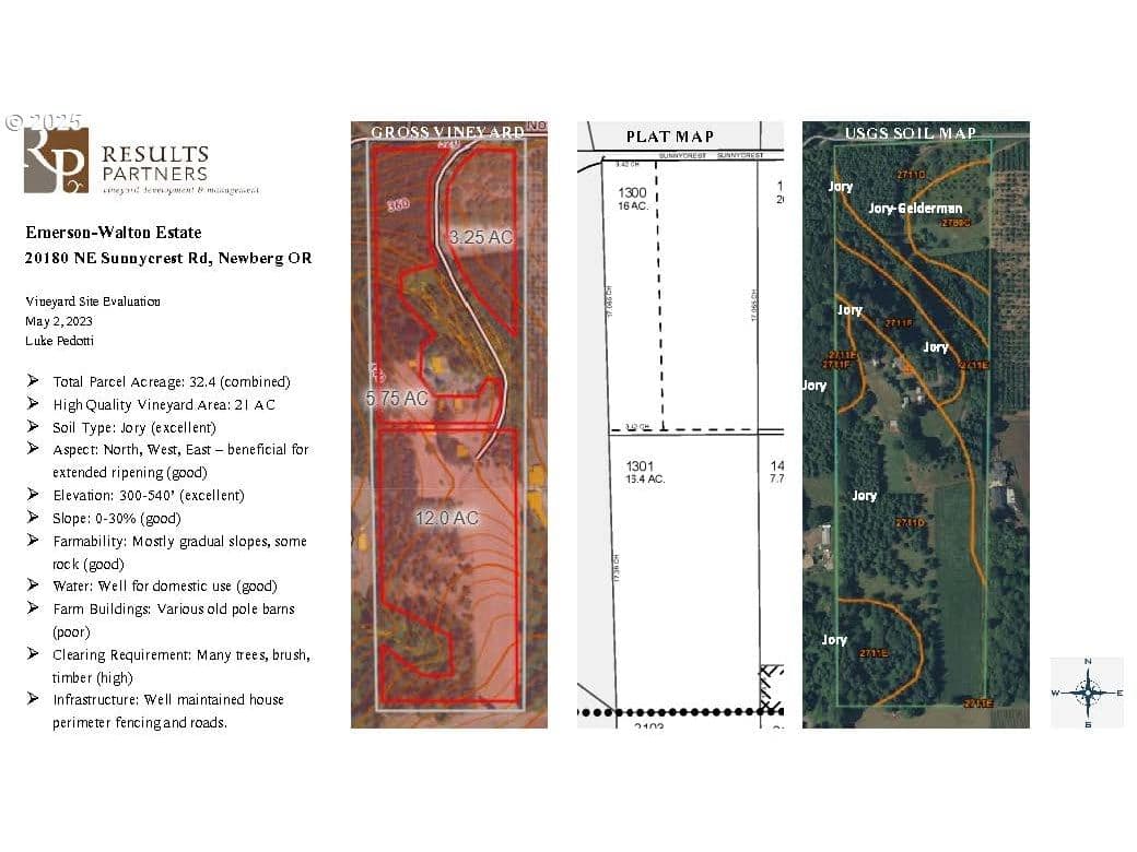 PRICED REDUCED! Welcome to your private retreat of 32 Lush Acres of Vineyard potential land in the Dundee Hills AVA. (See attached Vineyard evaluation) This property has Jory soils and elevations of 360 to 550 feet. Loads of options for whatever dreams you bring with you or have yet to dream!! Property has a 1972 Ranch Home with Multiple barns, tractor sheds, and outbuildings. Fencing & cross fencing. Stunning views from every room of forest, mountain, hillside, and valley. House is a 3 bedroom, 1 ½ bath home with laminate flooring, large family room with fireplace, enclosed sunporch, and extensive patios. Beautiful Oak cupboards with pull out shelves and a breakfast bar in the kitchen/dining area opens onto the sunporch. You will be COMFORTABLE no matter the weather. Plus a fireplace for those winter days that you want to be extra cozy. Beautiful forests to explore. Take your morning coffee out to your viewing deck for a magical sunrise over the valley, and enjoy the beauty of four distinct seasons. Even on a rainy day you are met with the magic of misty mountains. Surround yourself with peace and stunning views, but only 15 minutes to everything you need. 5 minutes to tasting rooms and vineyards. Immerse yourself in the heart of wine country and real farm to table living. A MUST SEE Magical Place!!