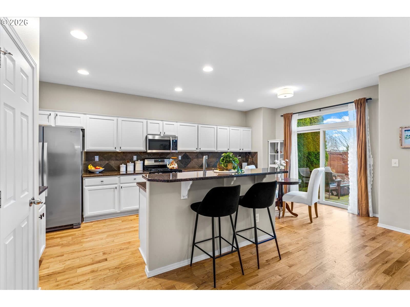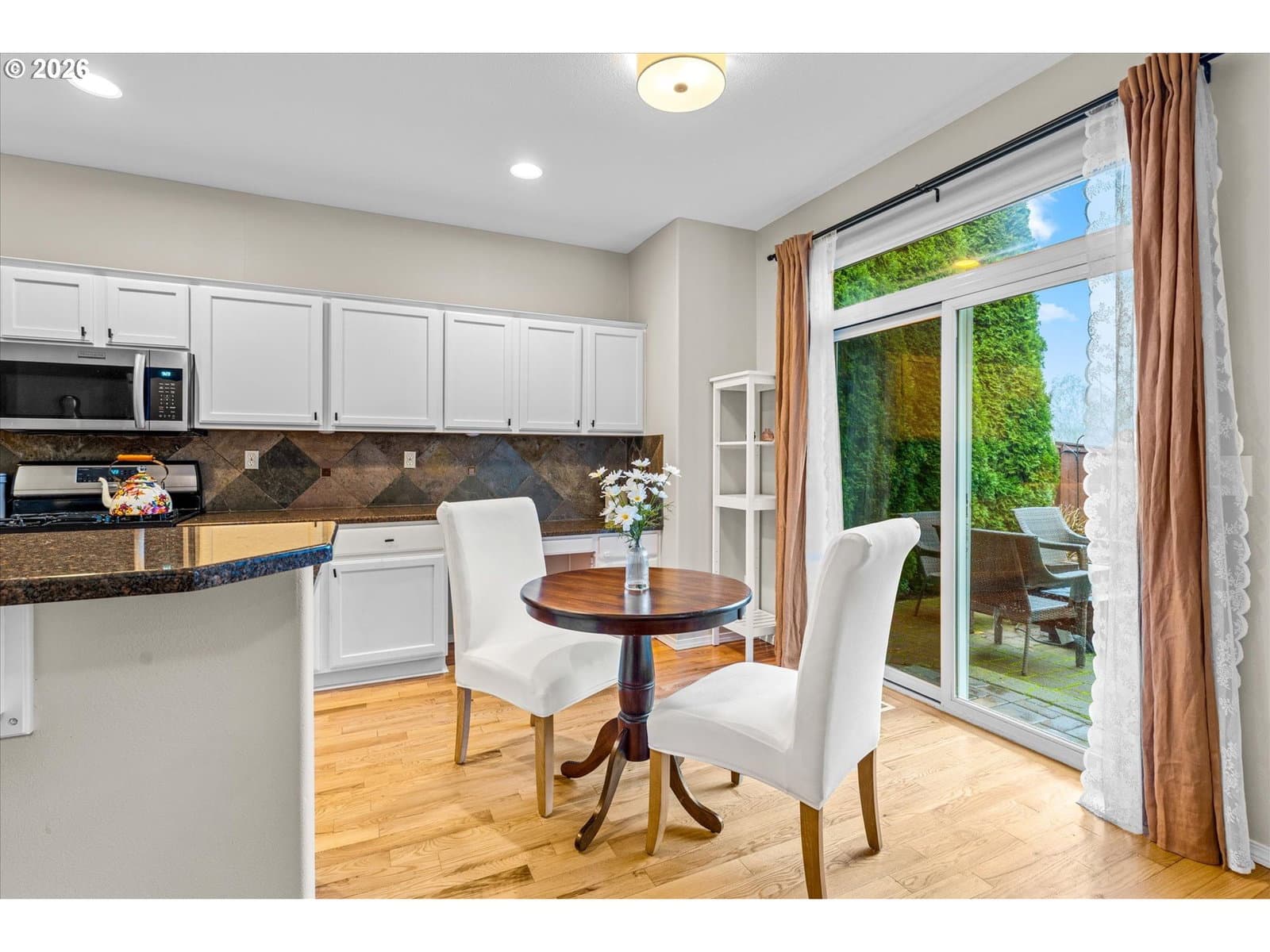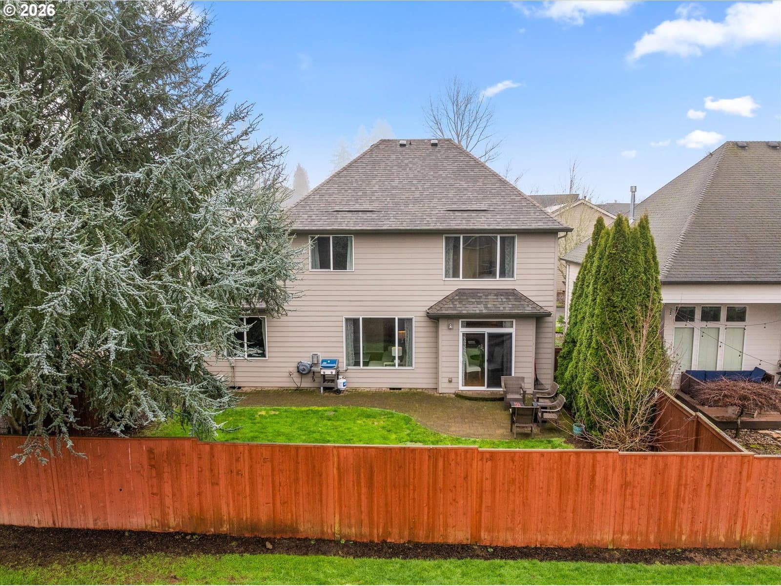 Don't Miss this gem backing to a greenspace in sought after Sherwood! New roof installed in 2025 with transferable warranty. Hot water heater replaced in 2025. The main level boasts recently refinished beautiful oak hardwood floors throughout the living, dining, kitchen & family rooms. The kitchen features granite countertops, gas range, island, eat-at bar, pantry, built-in desk and nook. Office or bedroom on main level. The primary suite includes a soaking tub, shower, double sinks, and a walk-in closet. Upper level includes a utility room w/sink, loft, and 2 additional bedrooms. Step outside to a private, fenced backyard backing to a greenbelt, complete with a custom pavered patio. Enjoy local dining and shopping just minutes away, plus easy Hwy 99 access.