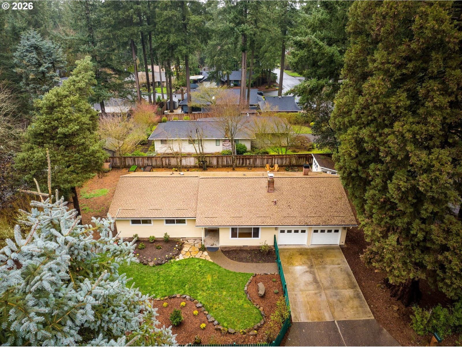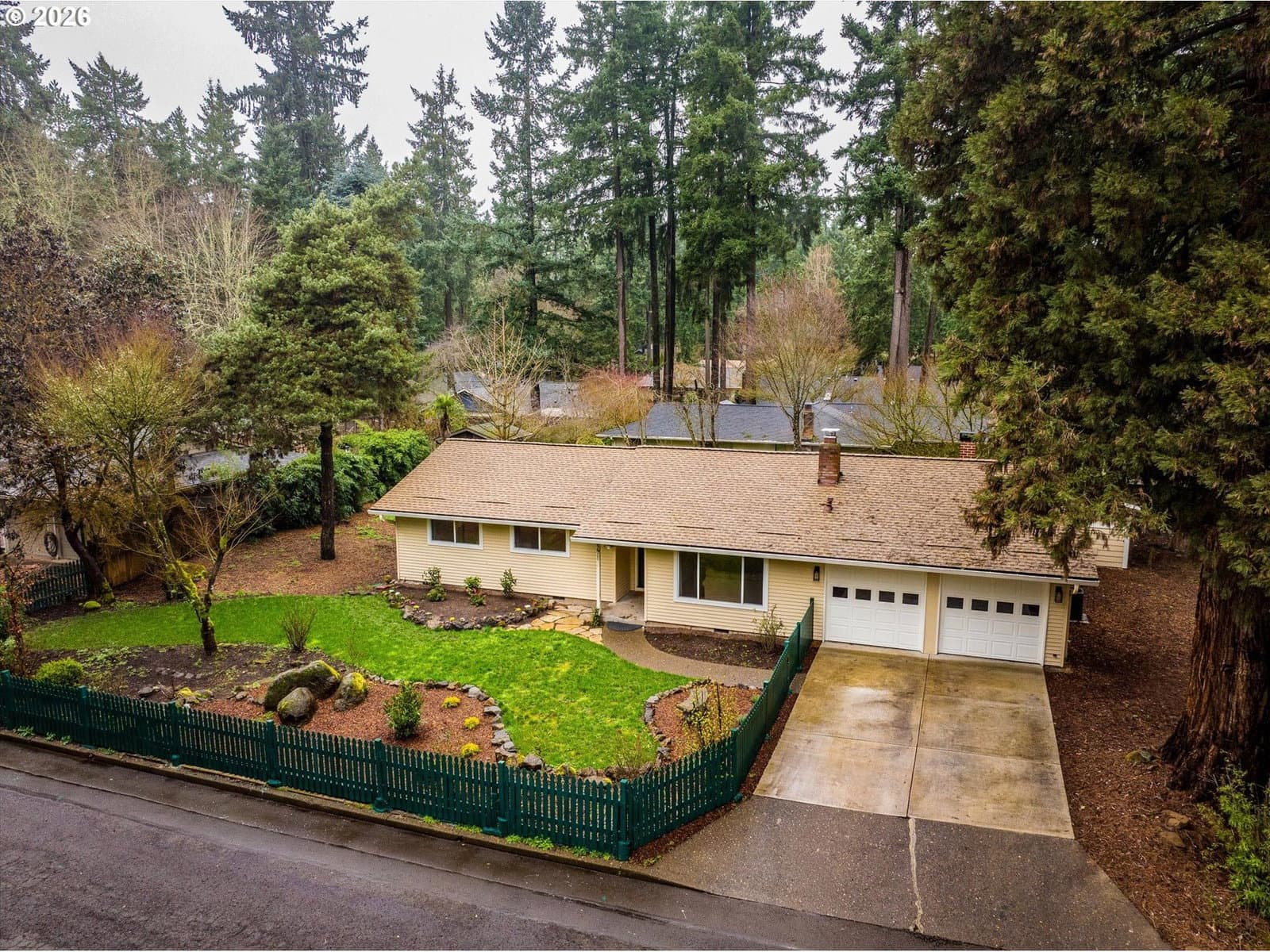 Affordable one level in Lake Oswego & 3 blocks to River Grove Elementary School. On a quiet cul-de-sac with a corner lot and fully fenced yard. Remodeled kitchen is a standout, featuring butcher block countertops, a white farmhouse sink, new cabinetry, stainless steel appliances, eat at bar, and updated lighting and hardware. Family and Living Rooms with wood burning fireplaces and laminate flooring. Furnace and AC replaced in 2025, updated lighting in 2026, newer roof, vinyl windows, WiFi enabled garage door opener & repoured driveway. Situated on almost a quarter acre, the fully fenced yard offers room to play, garden, or entertain. The 11 x 7 outbuilding with windows, is prepped and ready for electrical. It is ideal for a home office, creative studio, or flexible bonus space