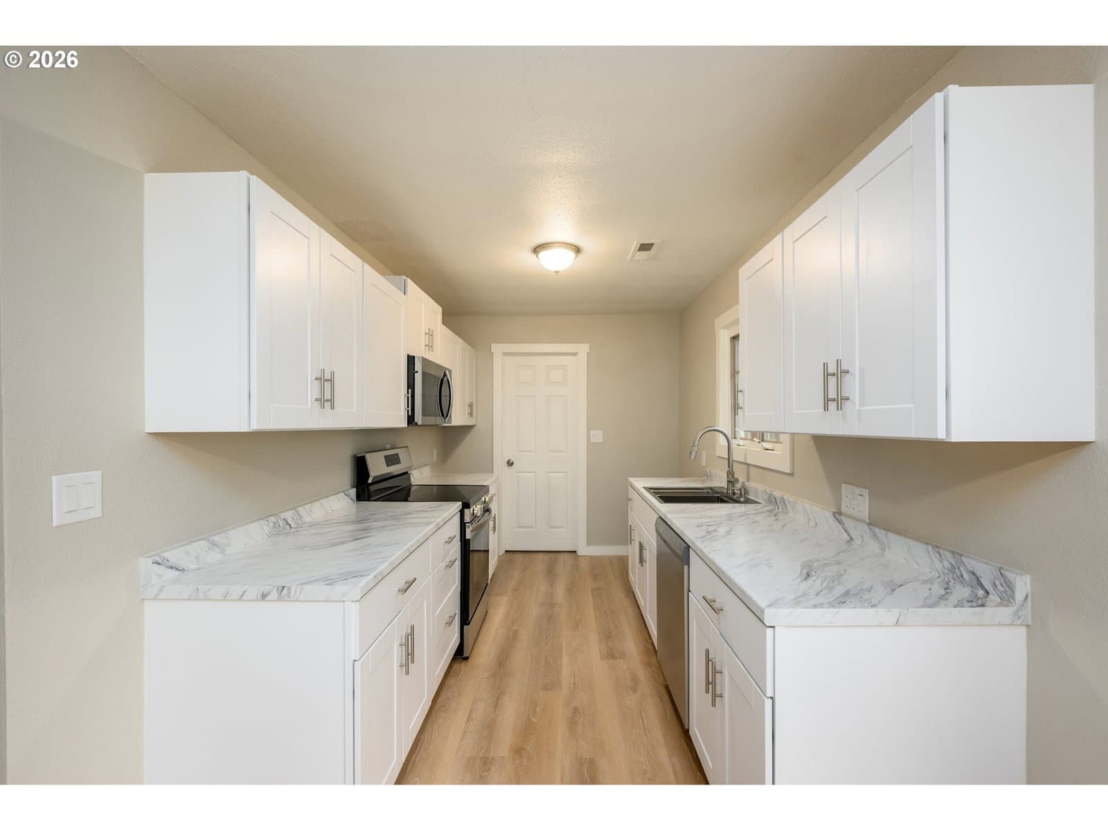 This newly remodeled single-level home sits on a corner lot that is located in a desirable West Roseburg neighborhood. Remodel includes brand new LVP flooring, carpet, interior paint, exterior paint, fixtures throughout, kitchen, bathrooms, trim, doors, air conditioner, heat pump, and a new roof.The spacious living room flows seamlessly into the dining area and kitchen, creating an ideal setting for everyday living and entertaining. Large windows and sliding glass doors provide beautiful views of the backyard and enhance natural sunlight. This home also includes a spacious backyard that is fully fenced for privacy and great for outdoor entertainment. Home features a large bonus room that can be used for an at home office or an extra bedroom. Located close to downtown, parks, grocery stores and plenty of dining options.