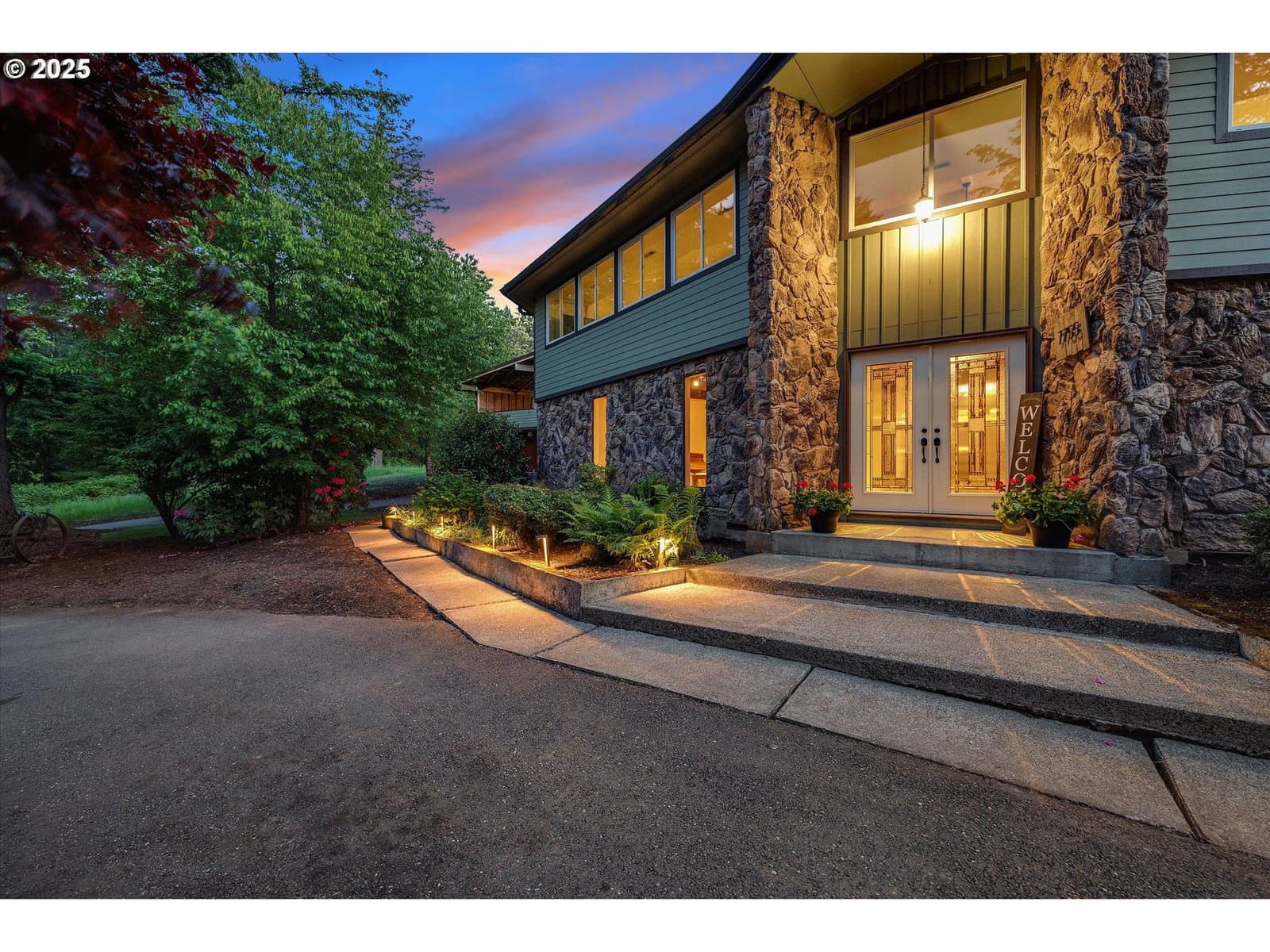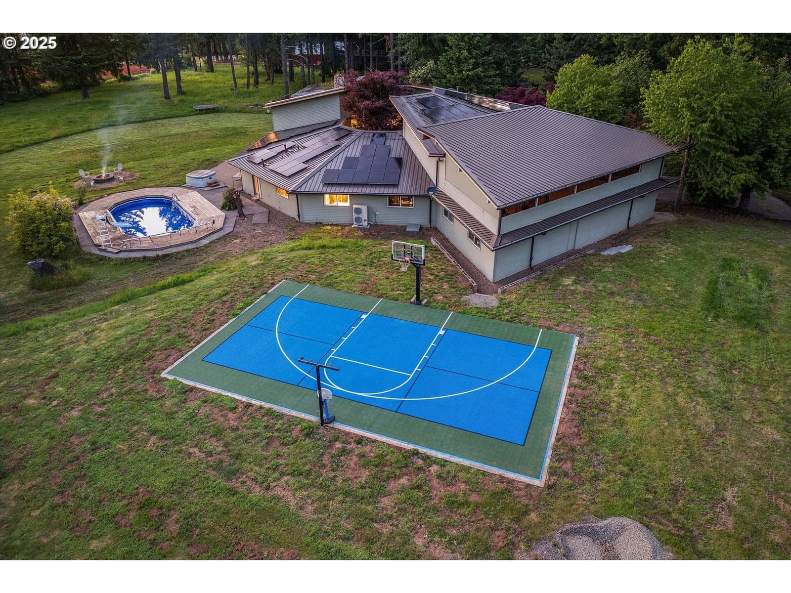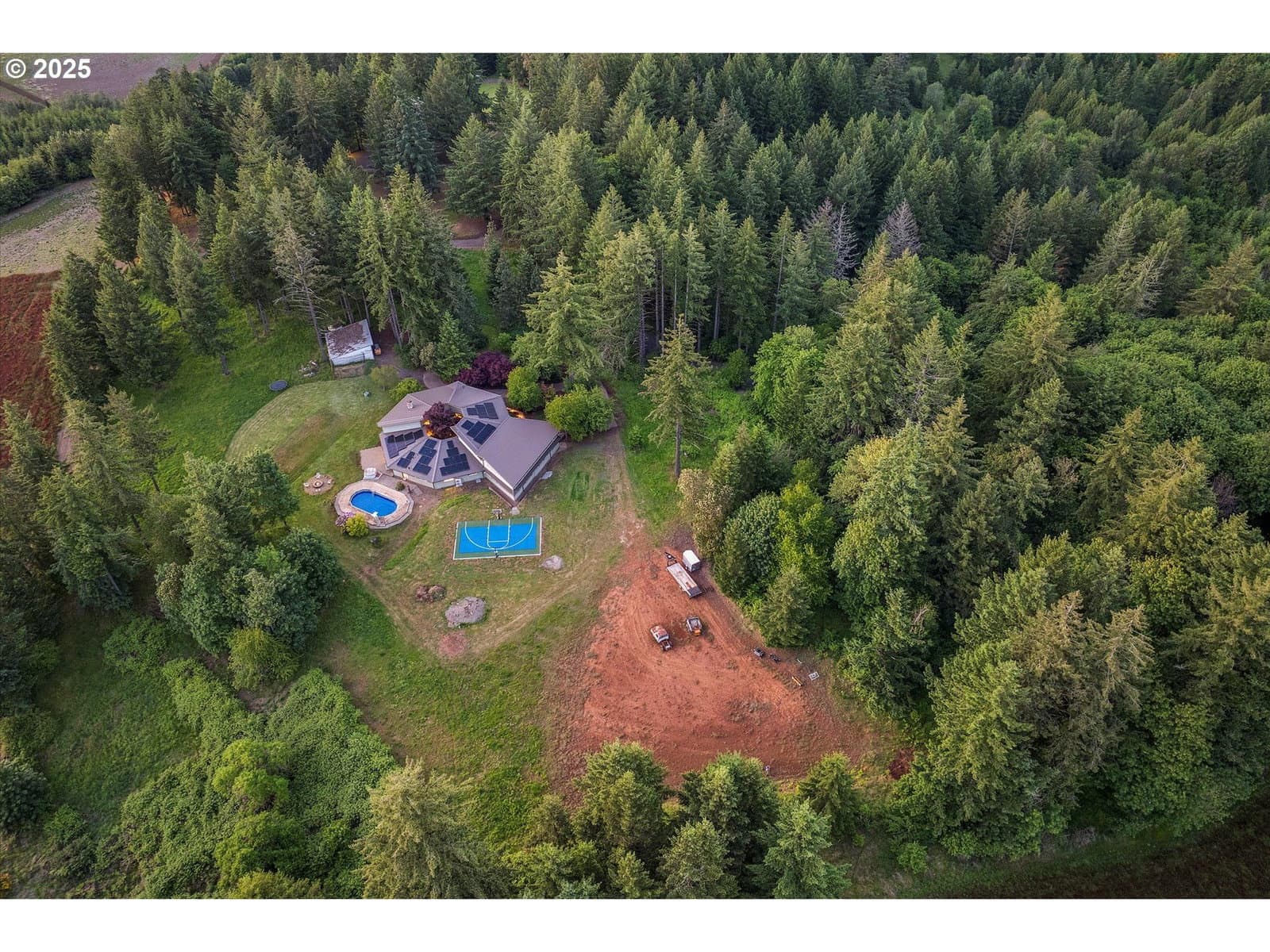 HUGE PRICE REDUCTION! Open House Saturday 3/11 and Sunday 3/12 from 2:00-4:00 !!This exceptional 6,500+ square foot custom-built residence offers a rare blend of architectural distinction and lifestyle amenities. Designed in a unique octagonal layout, the home centers around a private courtyard with easy access that enhances indoor-outdoor living. The spacious interior features six bedrooms and five bathrooms, including a generous primary suite. Beautiful wood floors, complemented by vaulted ceilings and exposed beams lends an elegant, rustic atmosphere. The upstairs boasts an enormous family room for entertaining or stretching out, a large private gym and a covered porch with batting cage. Situated on six hilltop acres with sweeping views, the property includes a swimming pool with deck, hot tub, a 50x30 sport court, and a four-stall barn making relaxation and enjoyment readily available. On the practical side, energy-efficient systems including high-efficiency heat pumps, a wood furnace, and an advanced solar panel system, ensure sustainability and cost savings. A huge garage and attached workshop gives storage, a place to tinker, and one more reason to call this place home. This is a rare opportunity to own a property that offers privacy, versatility, and a distinctive lifestyle setting.