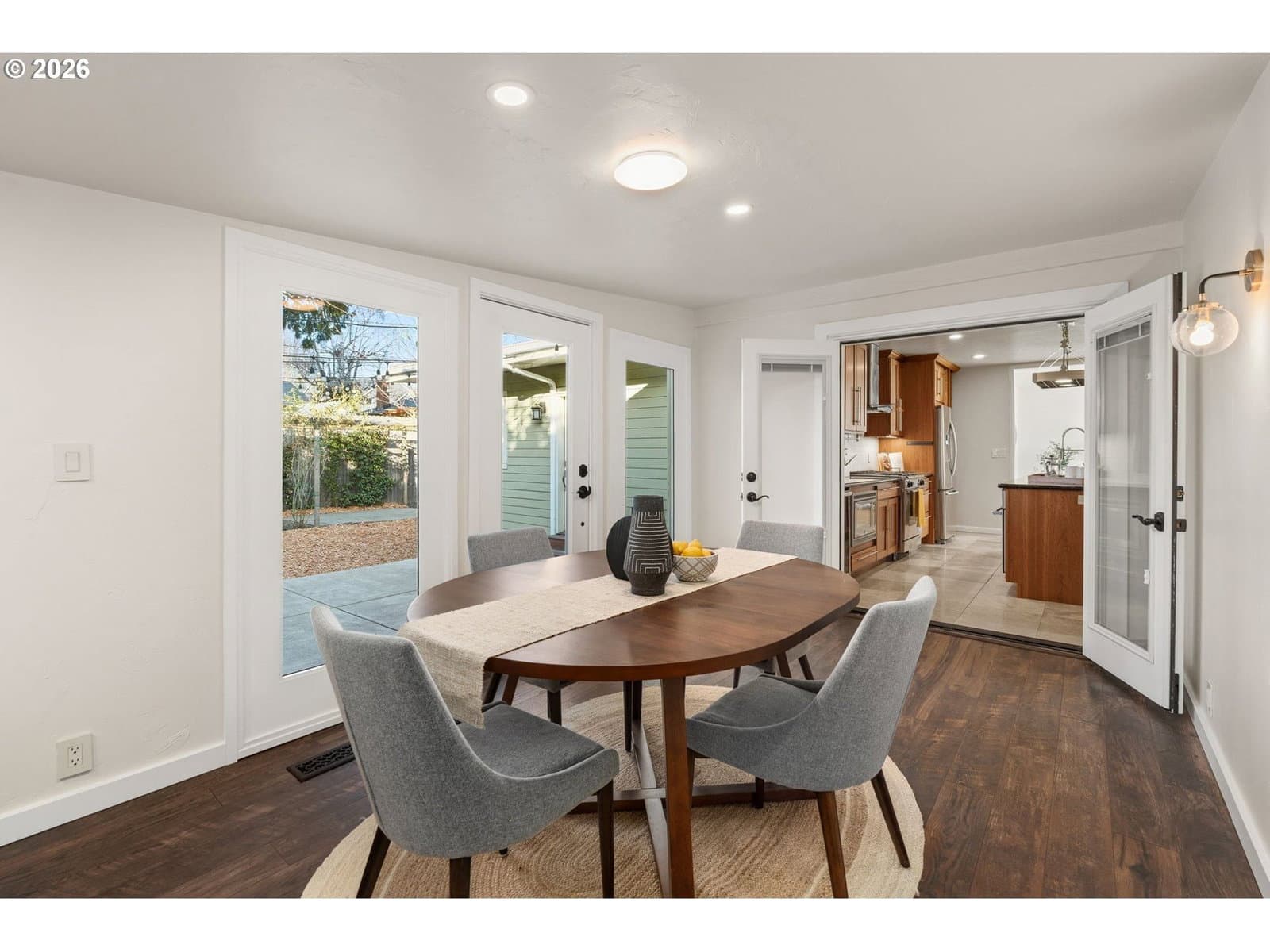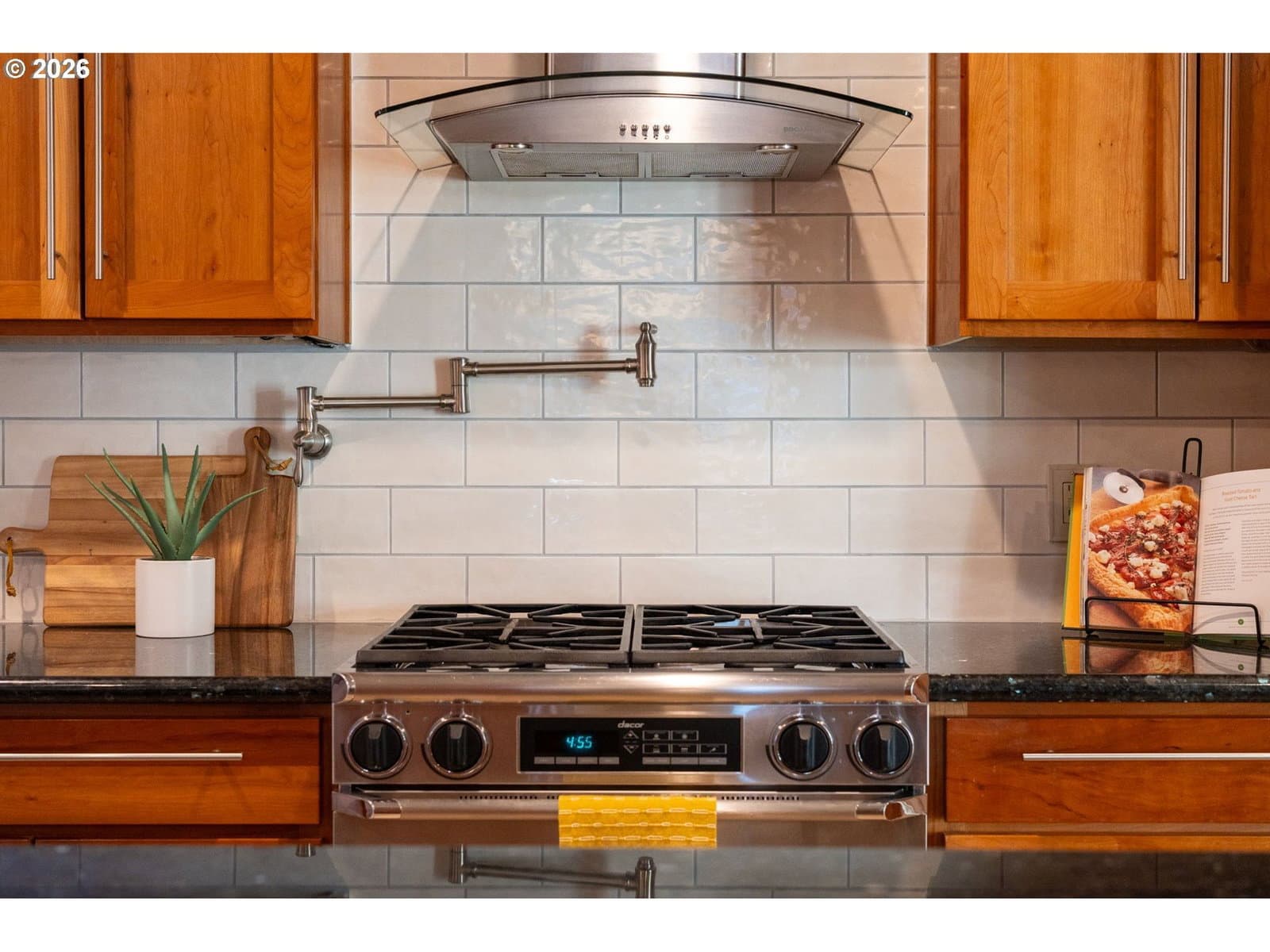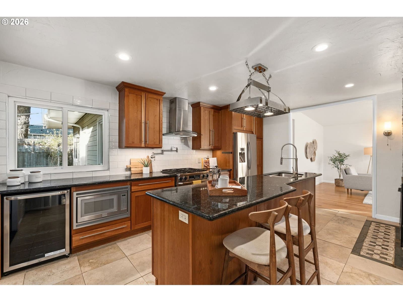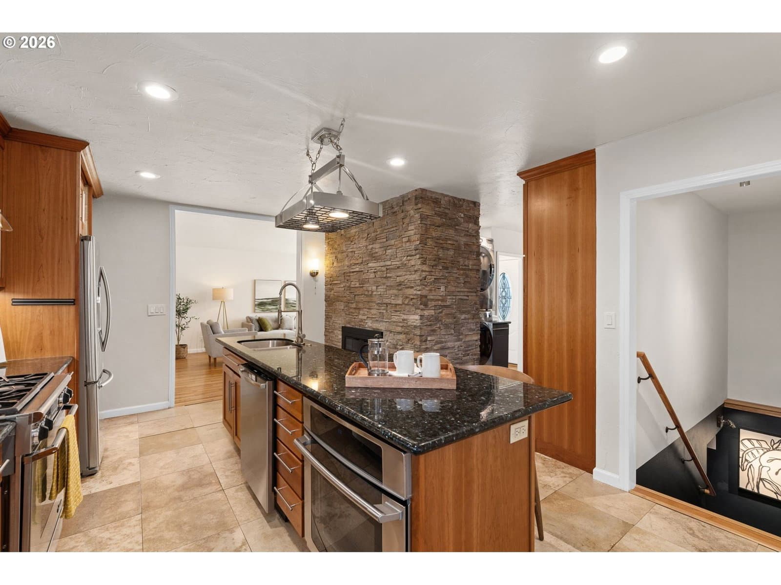 Confident, classic, and quietly efficient, this updated mid-century Milwaukie ranch blends original character with thoughtful modern upgrades across two finished levels. The main level offers vaulted ceilings, hardwood floors, a light-filled living room with wood-burning fireplace, and a kitchen with granite counters, stainless steel double ovens, wine cooler, pot filler, island seating, and heated tile floors. The primary suite includes beamed ceilings, walk-in closet, and en suite with heated tile floors. Downstairs features a family room with fireplace, two bedrooms, full bath, and storage. Fully fenced yard, patio, pergola, raised beds, and RV parking. Energy-efficient upgrades include solar panels, updated plumbing, high-efficiency furnace, newer water heater, and radon mitigation. Mid-century style, modern systems, and a layout that simply works! [Home Energy Score = 7. HES Report at https://rpt.greenbuildingregistry.com/hes/OR10244195]