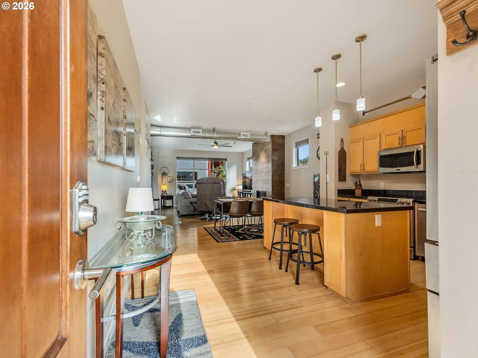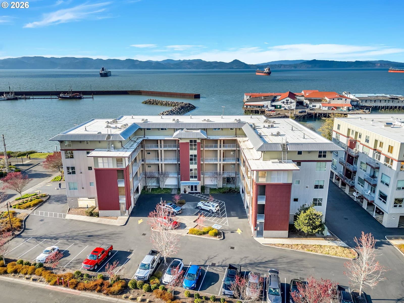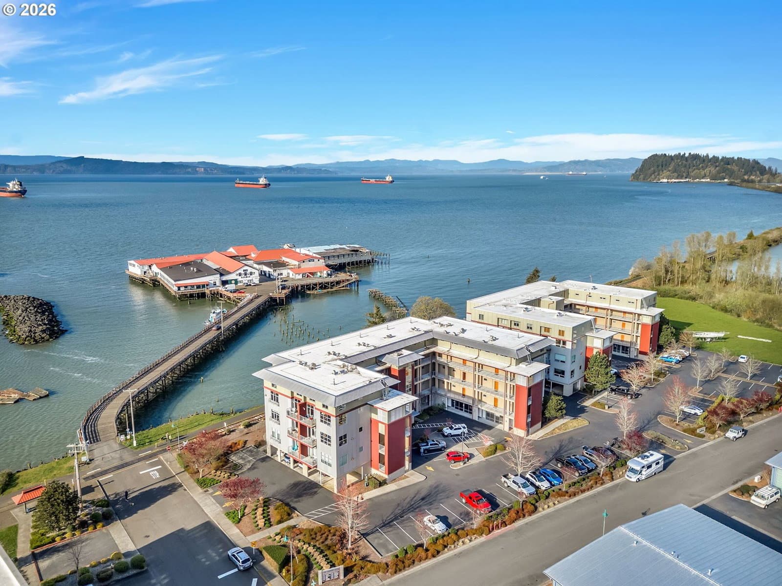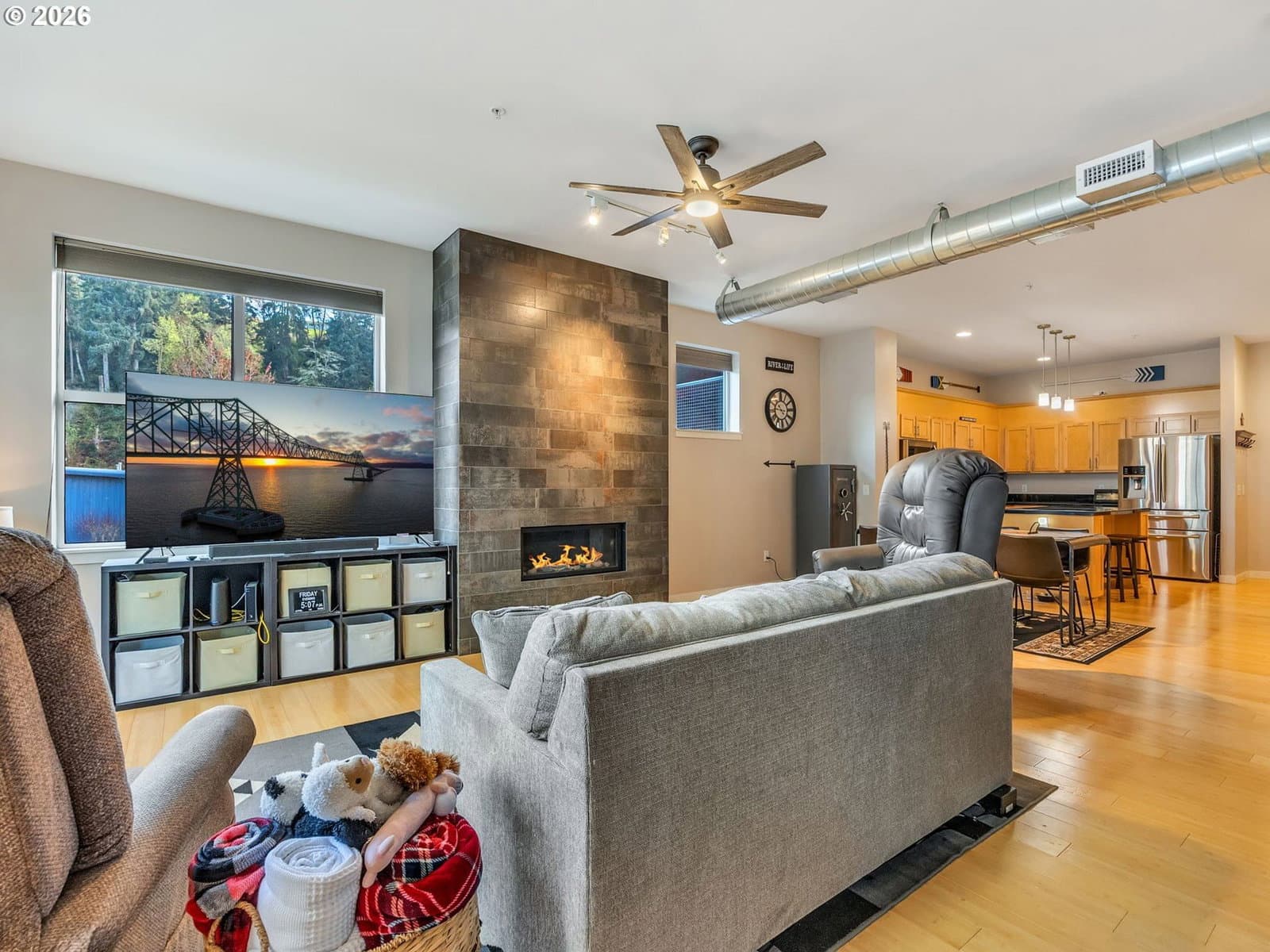 Discover effortless coastal living at The Cannery Loft Condominium's. Flooded with natural light from clerestory windows with southern exposure, this second-floor unit features a chef-inspired kitchen with granite countertops and stainless steel appliances, a custom gas fireplace for cozy evenings, and a brand-new stackable washer and dryer. It comes partially furnished with thoughtful finishes and high ceilings, plus elevator access and off-street parking. Enjoy the view of the Columbia River from your Balcony. Sitting just moments from vibrant downtown Astoria, the Columbia River waterfront, breweries, and outdoor adventures, this low-maintenance gem is perfect as a primary residence, weekend retreat, or income-producing rental.