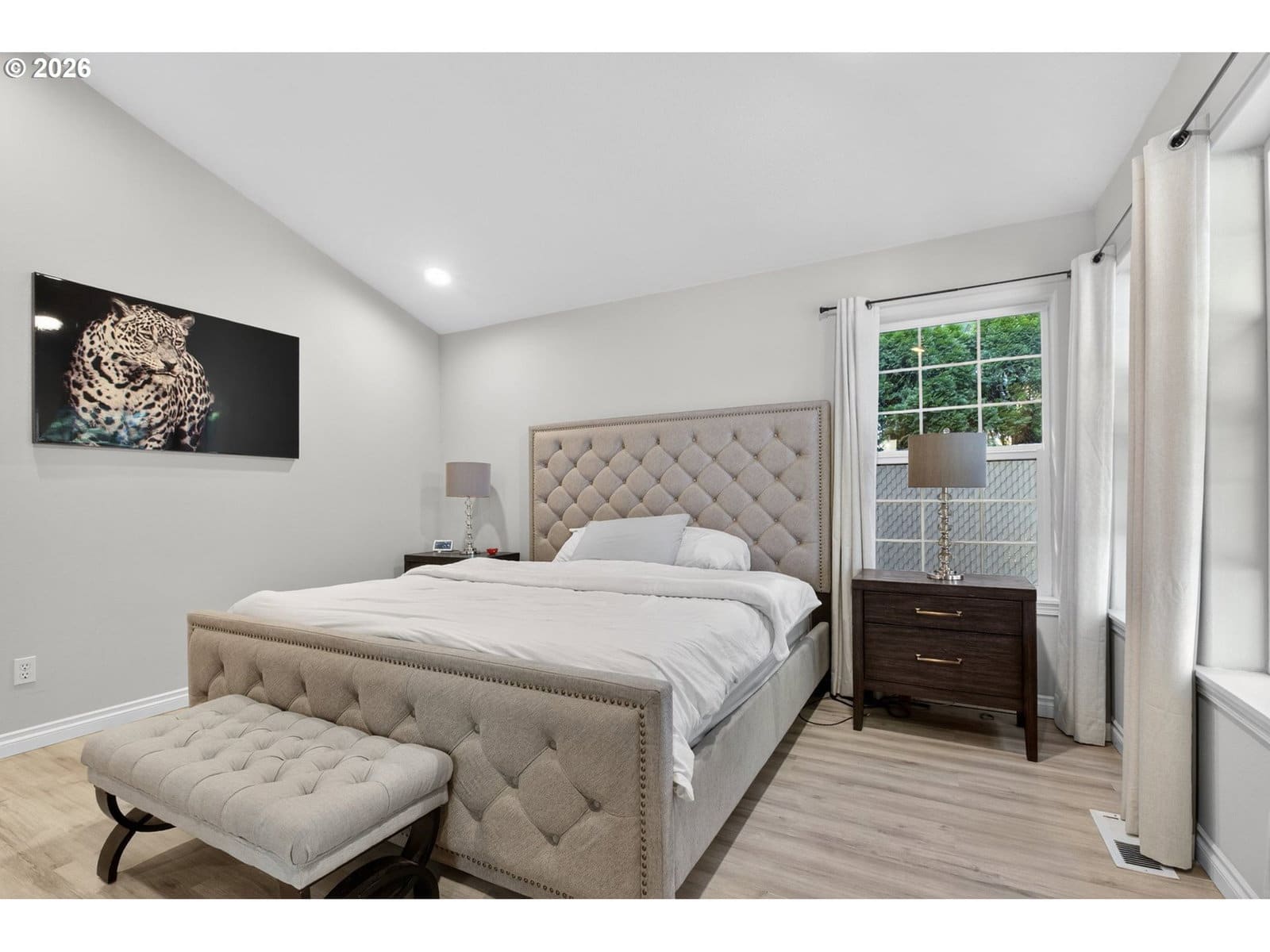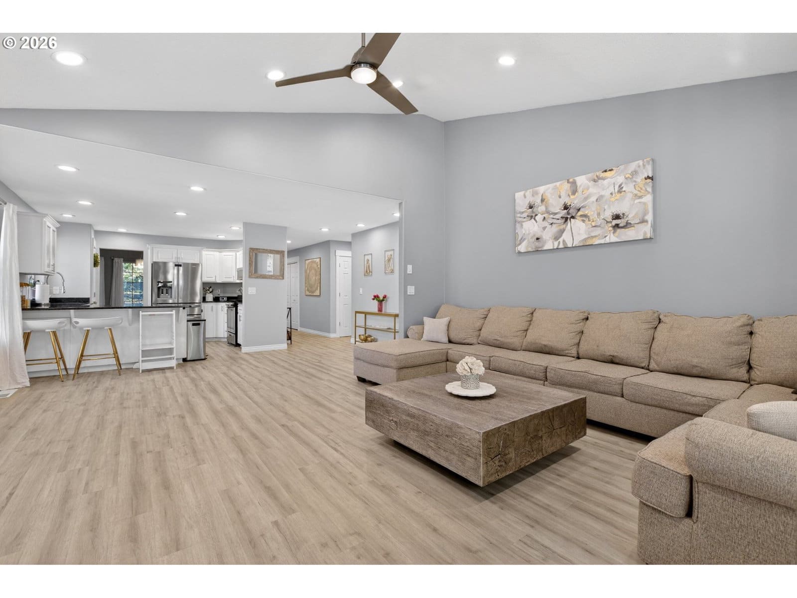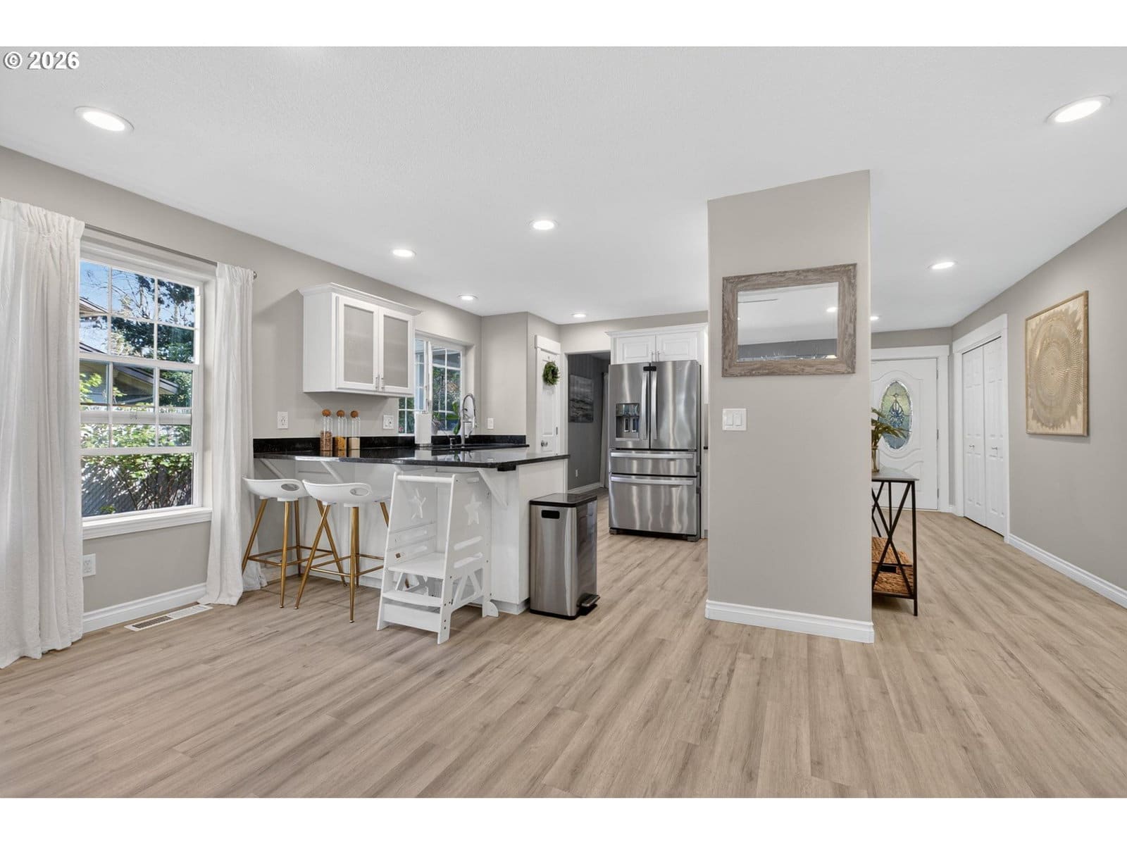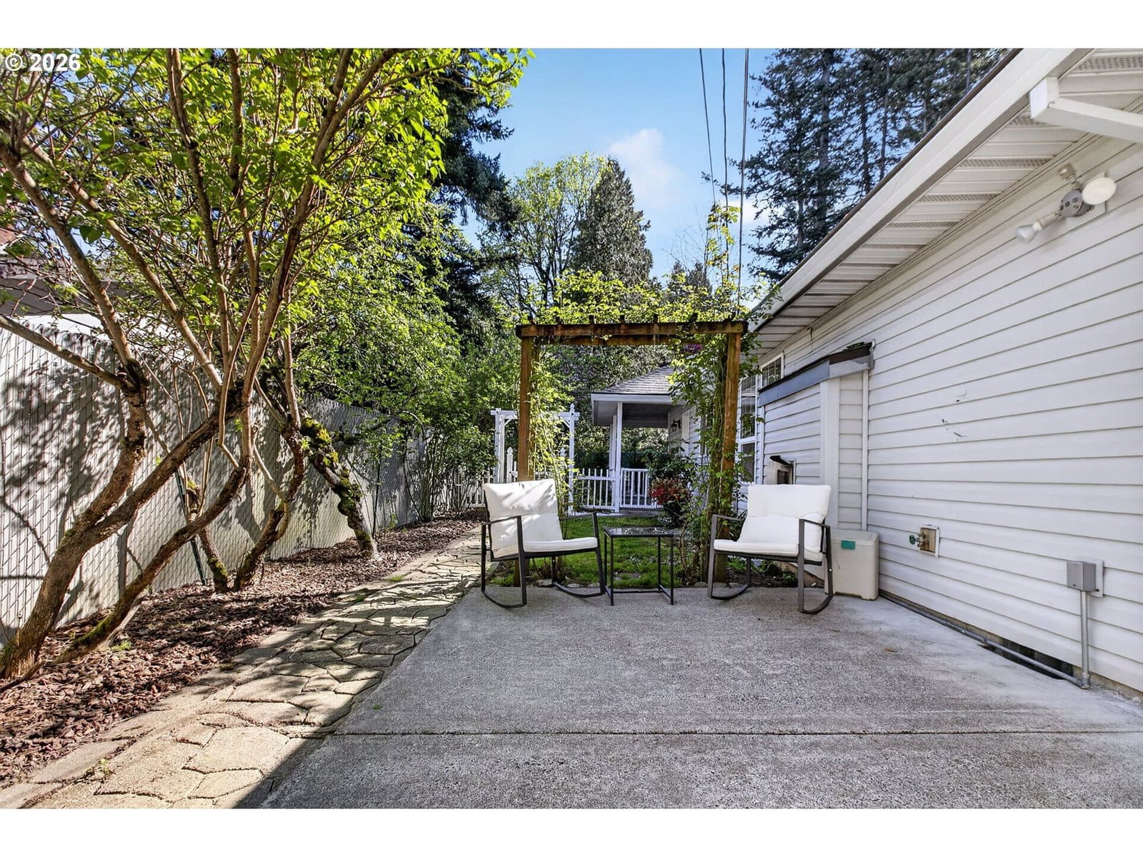 Beautiful single-level home tucked away on a private flag lot, offering comfort, convenience, and an open, light-filled design. Vaulted ceilings in both the living room and primary bedroom enhance the spacious feel, while large windows bring in abundant natural light. The spacious, great-room style, living area features soaring ceilings and a gas fireplace, perfect for year-round enjoyment. The kitchen is both stylish and functional, showcasing granite countertops, stainless steel appliances, and generous storage. New luxury vinyl plank flooring adds durability and a modern touch, complemented by classic oak floors in select areas. The primary suite offers a relaxing retreat with a large soaking tub, a door to the back patio, and ample space. Additional features include air conditioning and ceiling fans for year-round comfort. Enjoy outdoor living with a welcoming covered front porch and a low-maintenance back patio—ideal for relaxing or entertaining without the upkeep. The easy-care yard includes simple landscaping, a storage shed, and a small dog run. Finished with durable, low-maintenance vinyl siding, this home is designed for easy living inside and out.