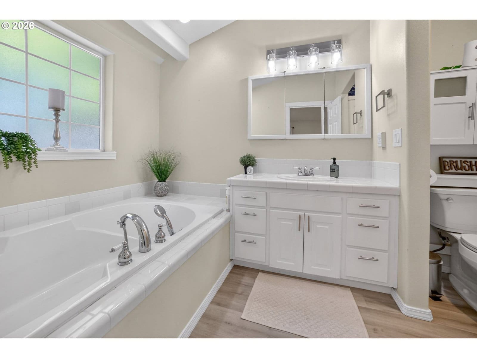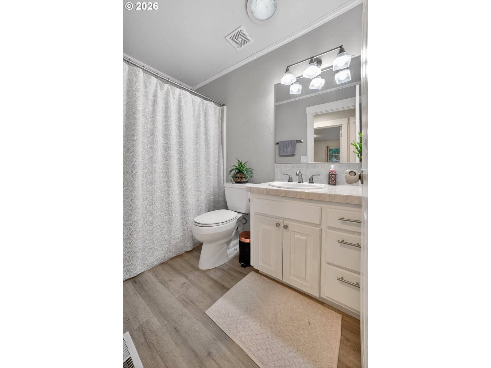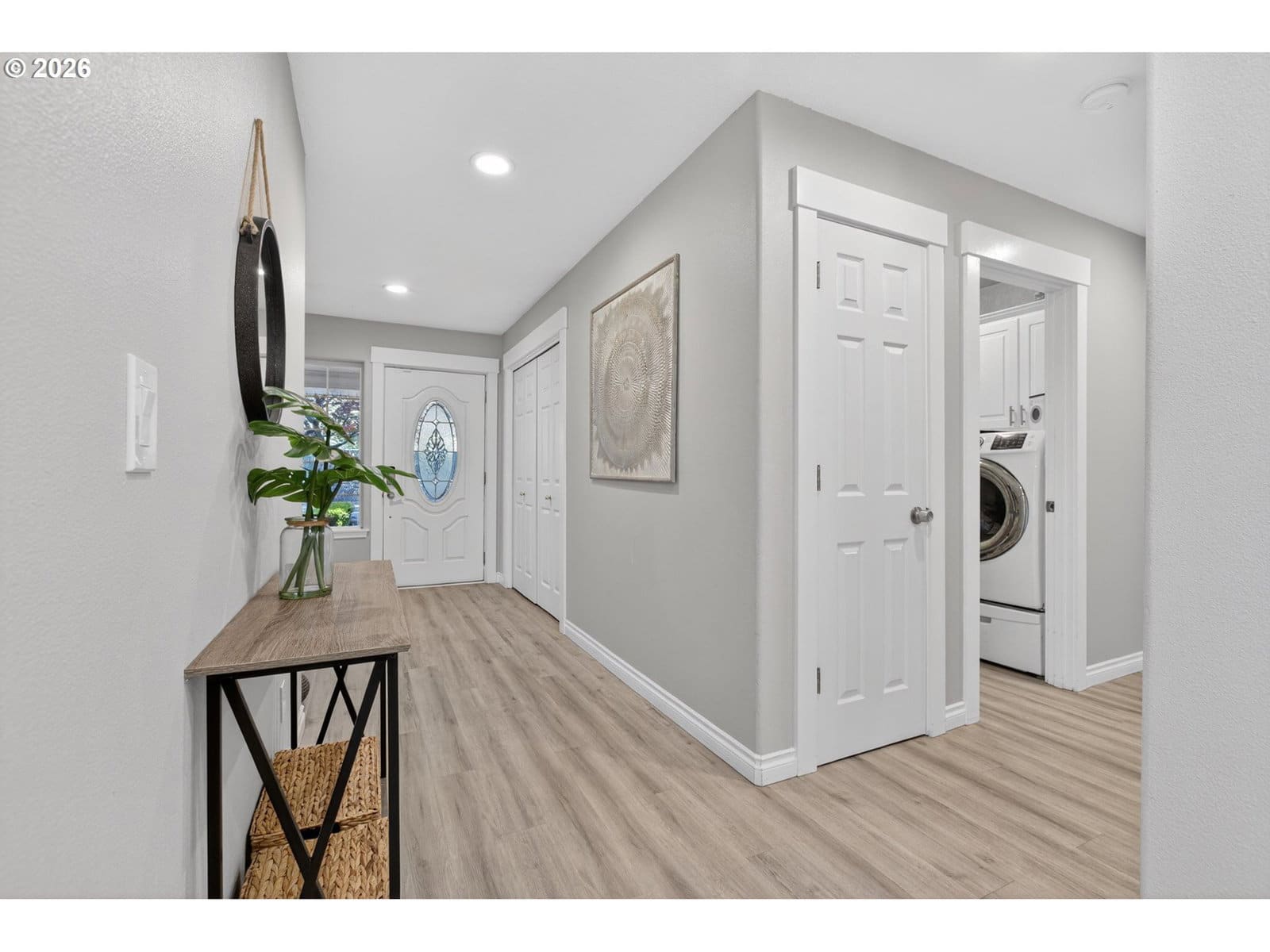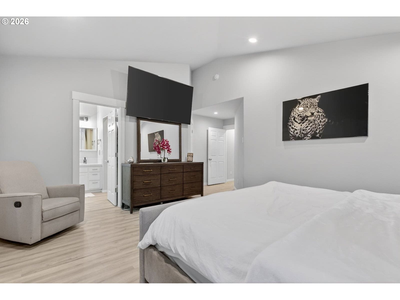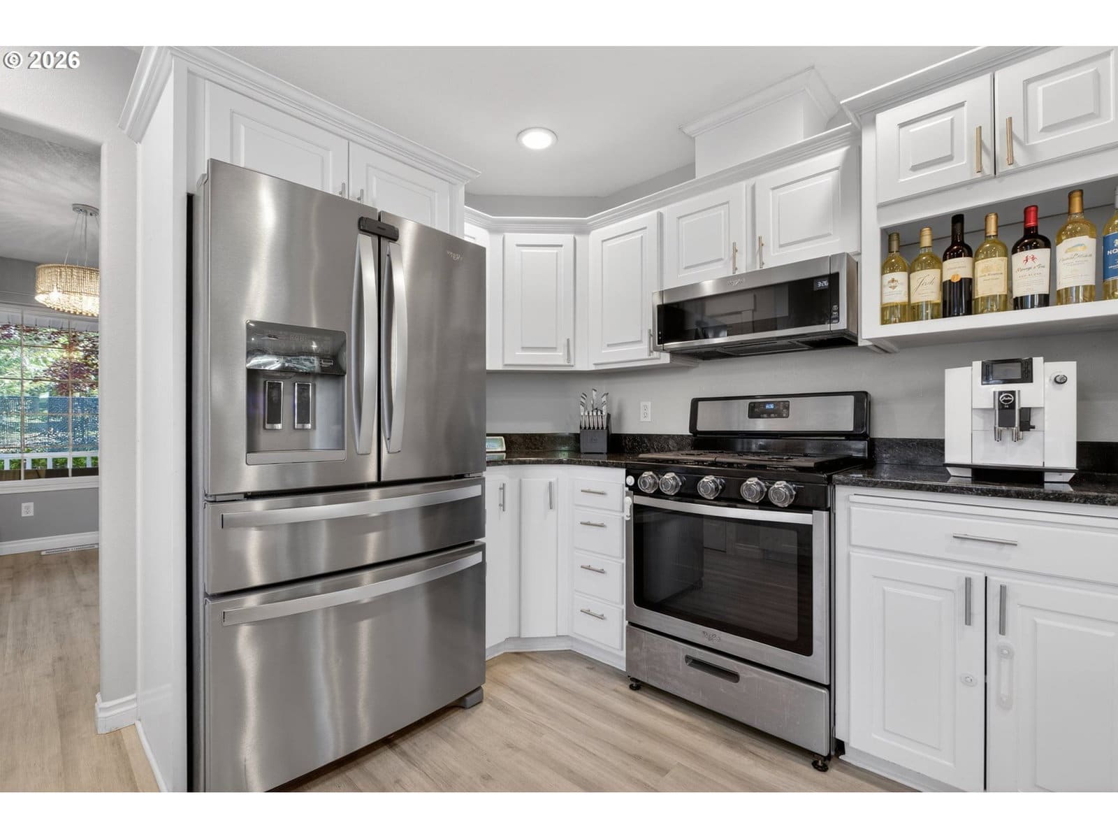 Beautiful single-level home tucked away on a private flag lot, offering comfort, convenience, and an open, light-filled design. Vaulted ceilings in both the living room and primary bedroom enhance the spacious feel, while large windows bring in abundant natural light. The spacious, great-room style, living area features soaring ceilings and a gas fireplace, perfect for year-round enjoyment. The kitchen is both stylish and functional, showcasing granite countertops, stainless steel appliances, and generous storage. New luxury vinyl plank flooring adds durability and a modern touch, complemented by classic oak floors in select areas. The primary suite offers a relaxing retreat with a large soaking tub, a door to the back patio, and ample space. Additional features include air conditioning and ceiling fans for year-round comfort. Enjoy outdoor living with a welcoming covered front porch and a low-maintenance back patio—ideal for relaxing or entertaining without the upkeep. The easy-care yard includes simple landscaping, a storage shed, and a small dog run. Finished with durable, low-maintenance vinyl siding, this home is designed for easy living inside and out.