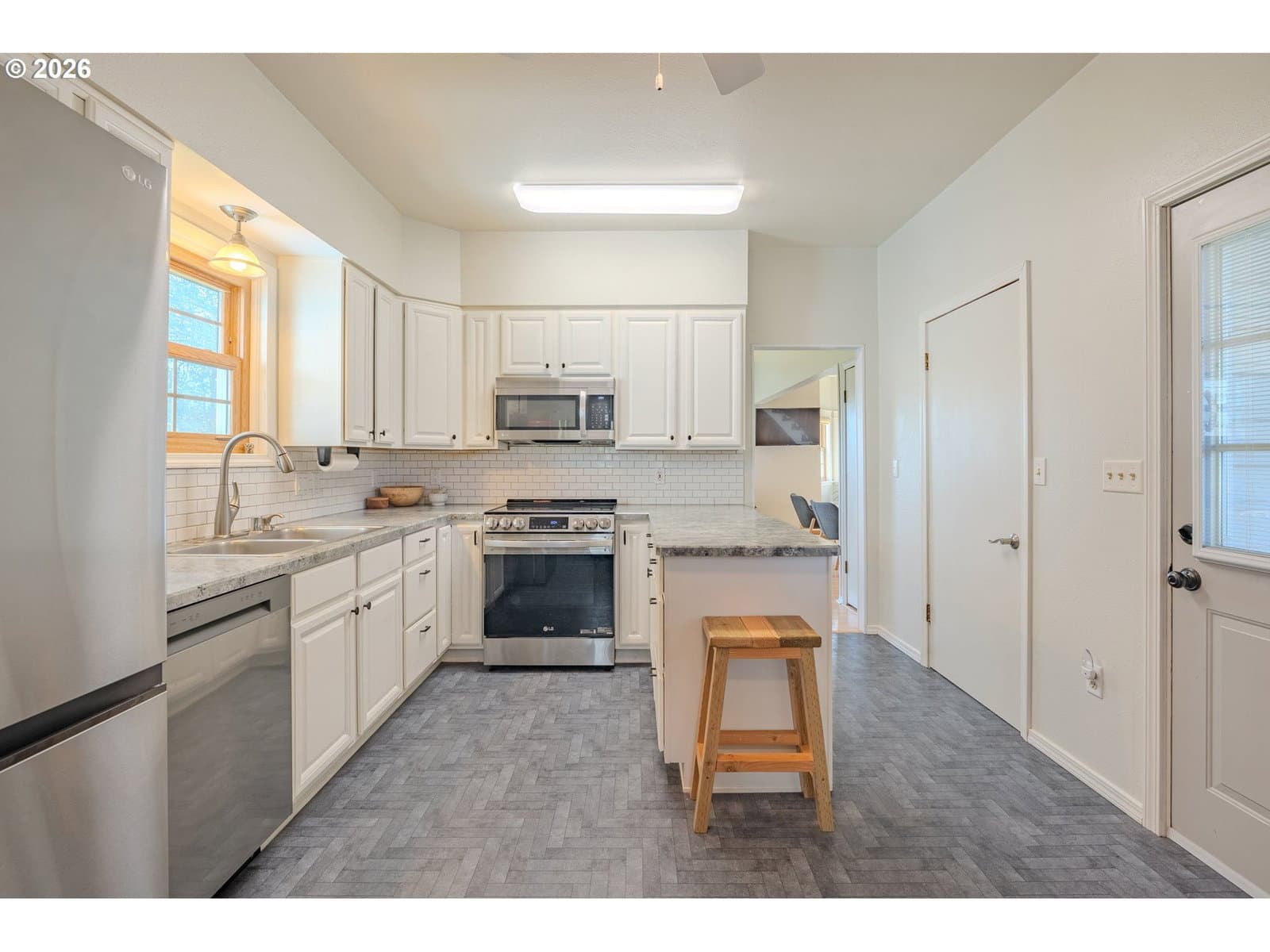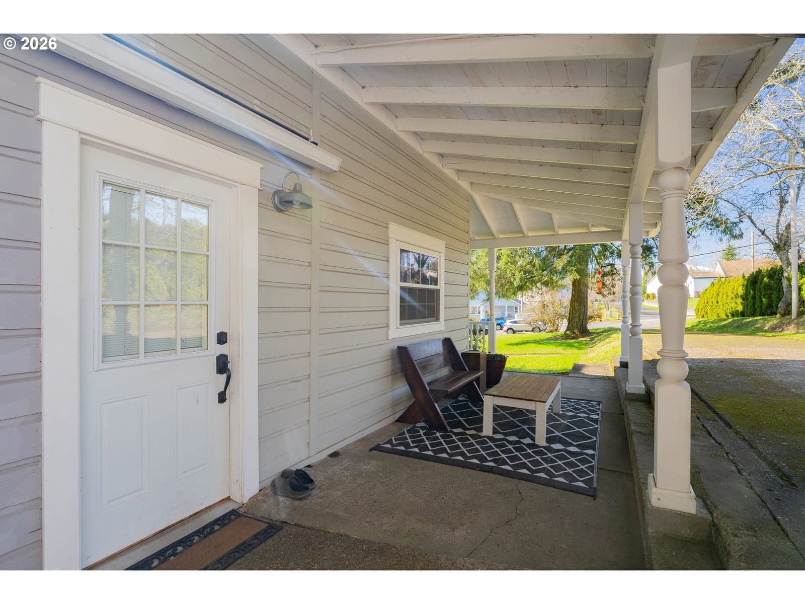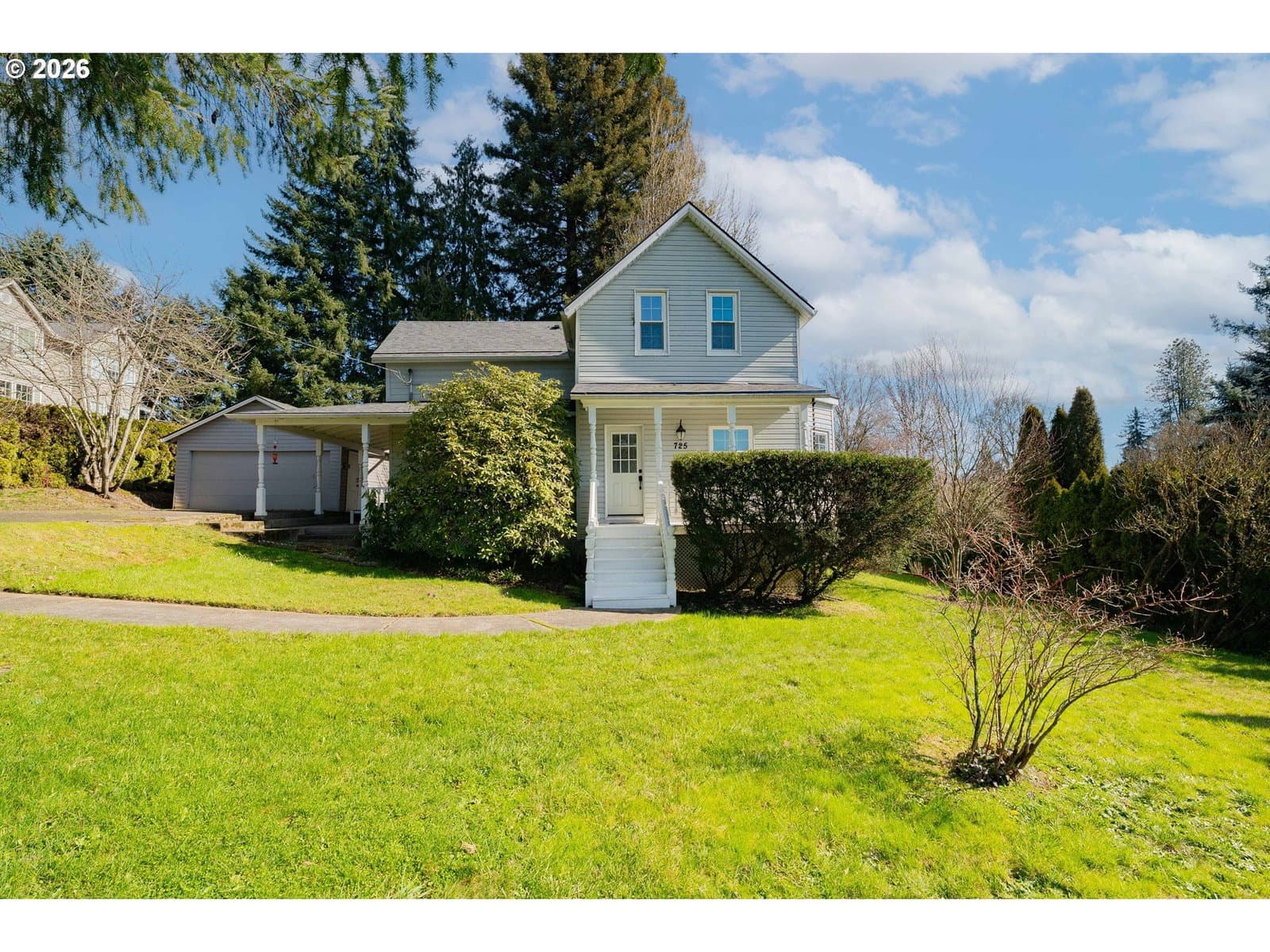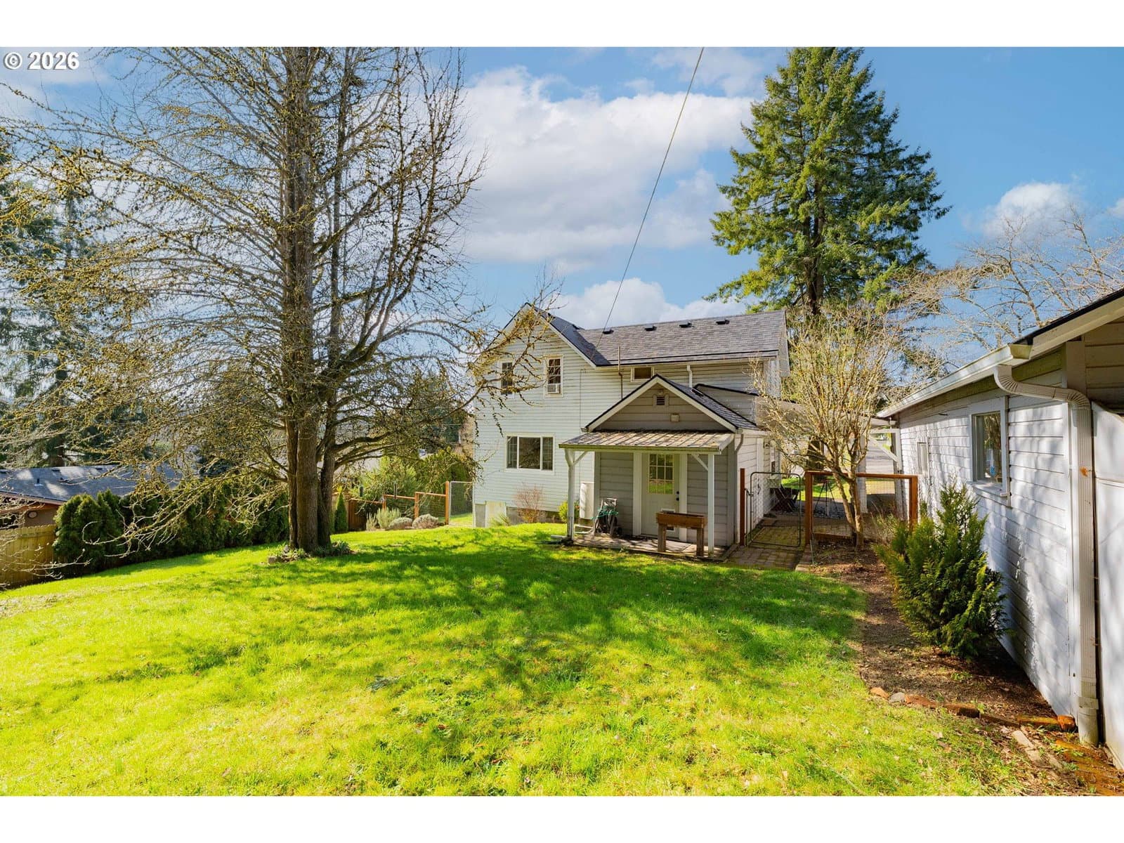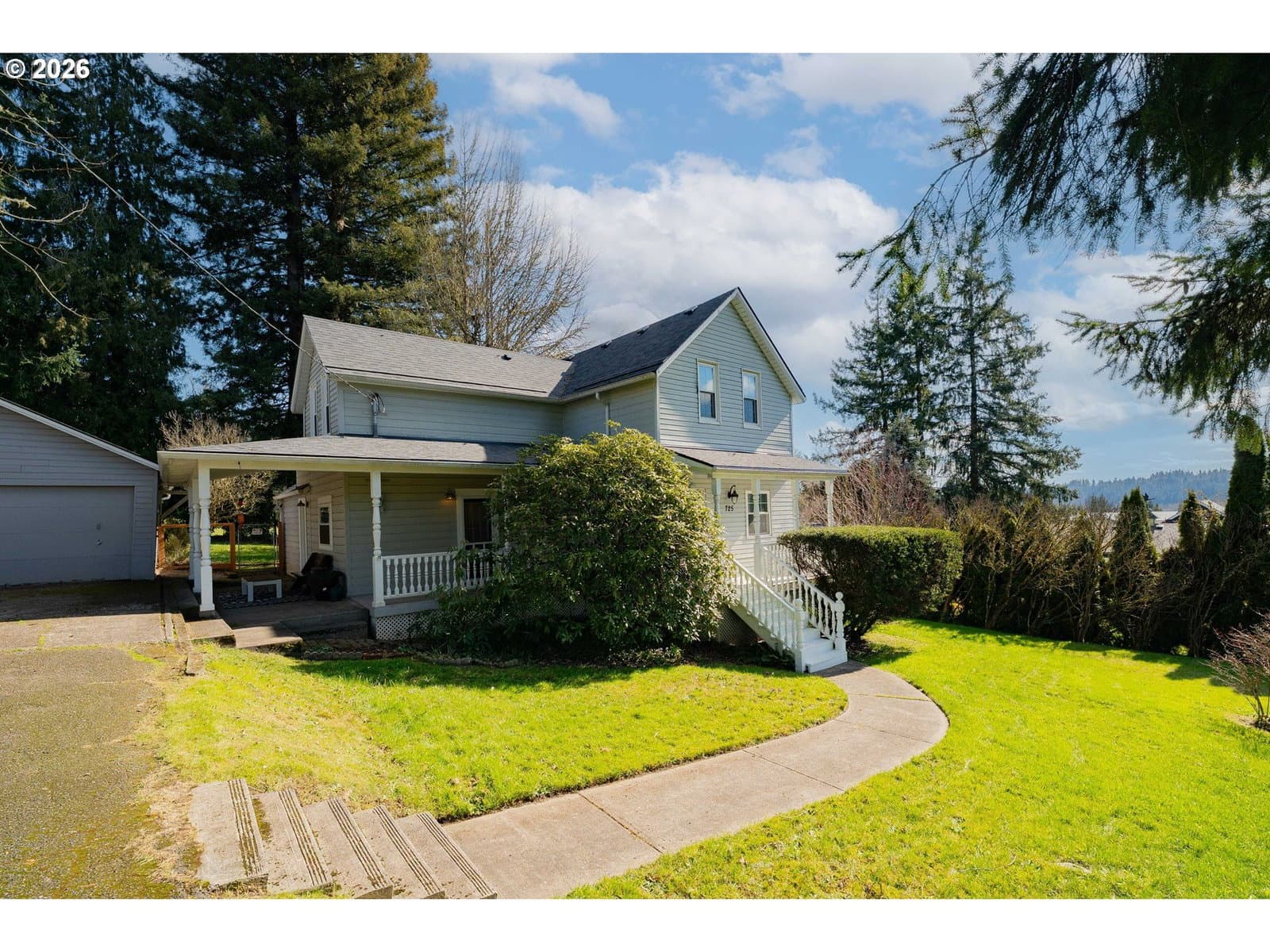 Vintage charm meets everyday livability in this delightful 1908 farmhouse set on a sprawling .39-acre lot in the heart of La Center. This 3-bedroom, 2-bath home blends character and thoughtful updates, offering a warm, welcoming atmosphere throughout. With a new roof in 2025 for added peace of mind, this special property delivers space, character, and small-town convenience all in one.The bright, open living room features a cozy window seat and flows beautifully across gorgeous newer maple flooring, complemented by custom blinds that add both style and function. The stylishly updated bathrooms honor the home’s history while adding modern comfort, including a main-level bath with a classic clawfoot soaking tub. The refreshed kitchen is open and functional with vinyl flooring, solid surface counters, full tile backsplash, stainless appliances, eating bar, and a walk-in pantry, while a utility/mud room with sink enhances everyday ease. Wraparound porches invite you to relax and enjoy the setting, and the huge, fully fenced yard offers grapes, blueberries, and more along with abundant space for gardening, hobbies, recreation, or gathering. The unfinished basement provides excellent storage and root cellar potential, and the detached 4-car garage/shop adds exceptional flexibility for a workspace, projects or additional storage.