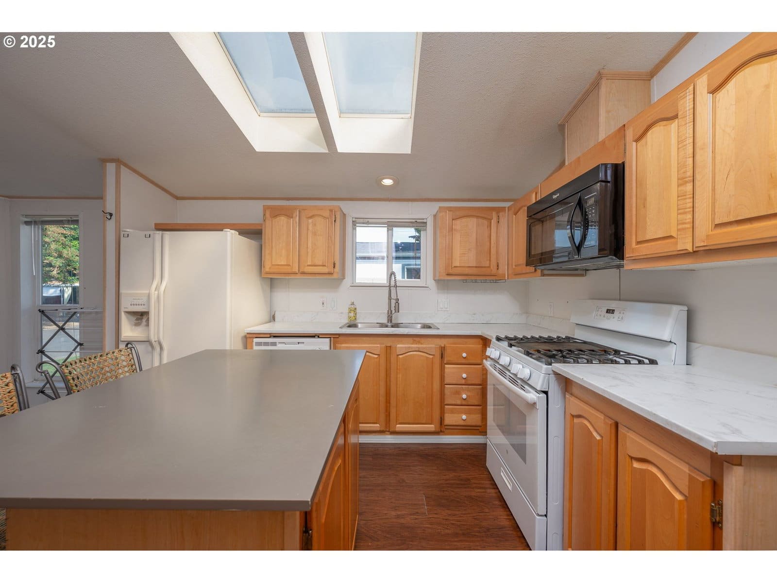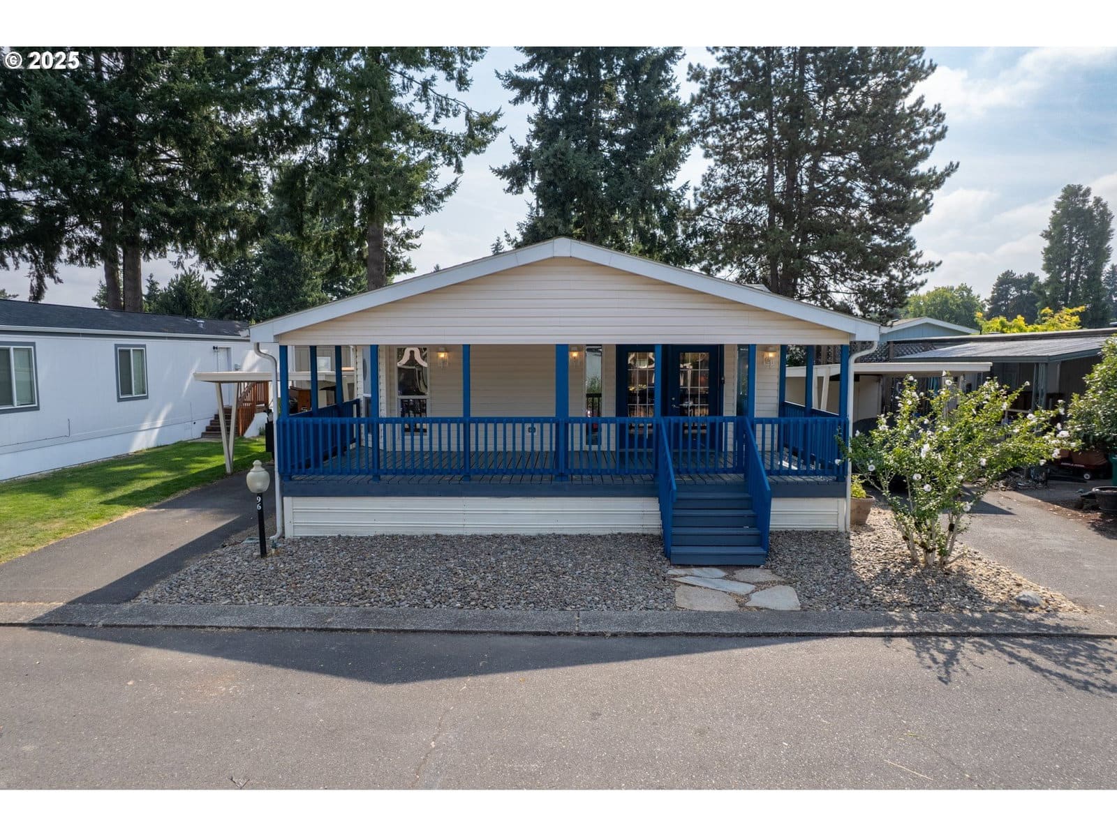 Welcome to this light-filled 3-bedroom, 2-bath home with an office, ideally located near the Columbia River with exceptional community amenities. The spacious kitchen features a breakfast nook, two skylights, a center island, and opens to both the dining and living rooms. Adjacent laundry room adds convenience. *** Open House, 01/11/26 11am - 1pm *** The living room offers abundant windows, great natural light, and a cozy wood-burning fireplace, with French doors leading to a large covered front deck—perfect for relaxing or entertaining.The versatile office includes a solar tube and porthole windows, while additional solar tubes in the hallway and primary bathroom bring in natural daylight throughout the home. Primary suite offers comfort and privacy and an ensuite bathroom. All appliances are included: washer/dryer, kitchen appliances, and window A/C units. Carport with shed provides extra storage.Community amenities include a fitness center, four pools (including a kid pool), playgrounds, clubhouses, basketball court, and a scenic nature trail. Bike and walking trails along the Columbia River are just steps away. Conveniently located near Jantzen Beach Shopping Center with Target, Home Depot, Best Buy, and exciting new retail and dining developments. Easy access to freeways, plus just across the bridge you’ll find The Waterfront Vancouver with trendy restaurants, boutique shops, and riverside parks. Monthly space rent is $966, includes garbage service. New owner may be able to rent the home, buyer to do due diligence with the park. This home combines abundant natural light, comfortable living spaces, and an unbeatable location with resort-style amenities.