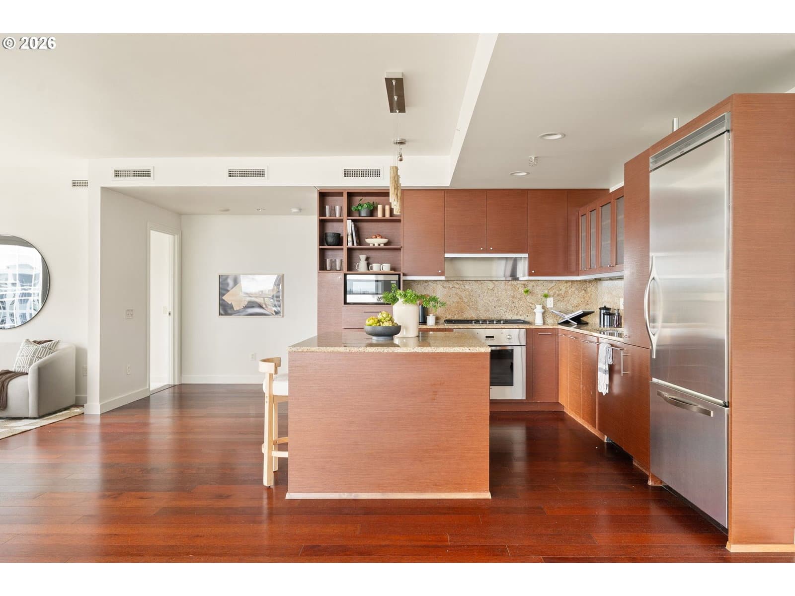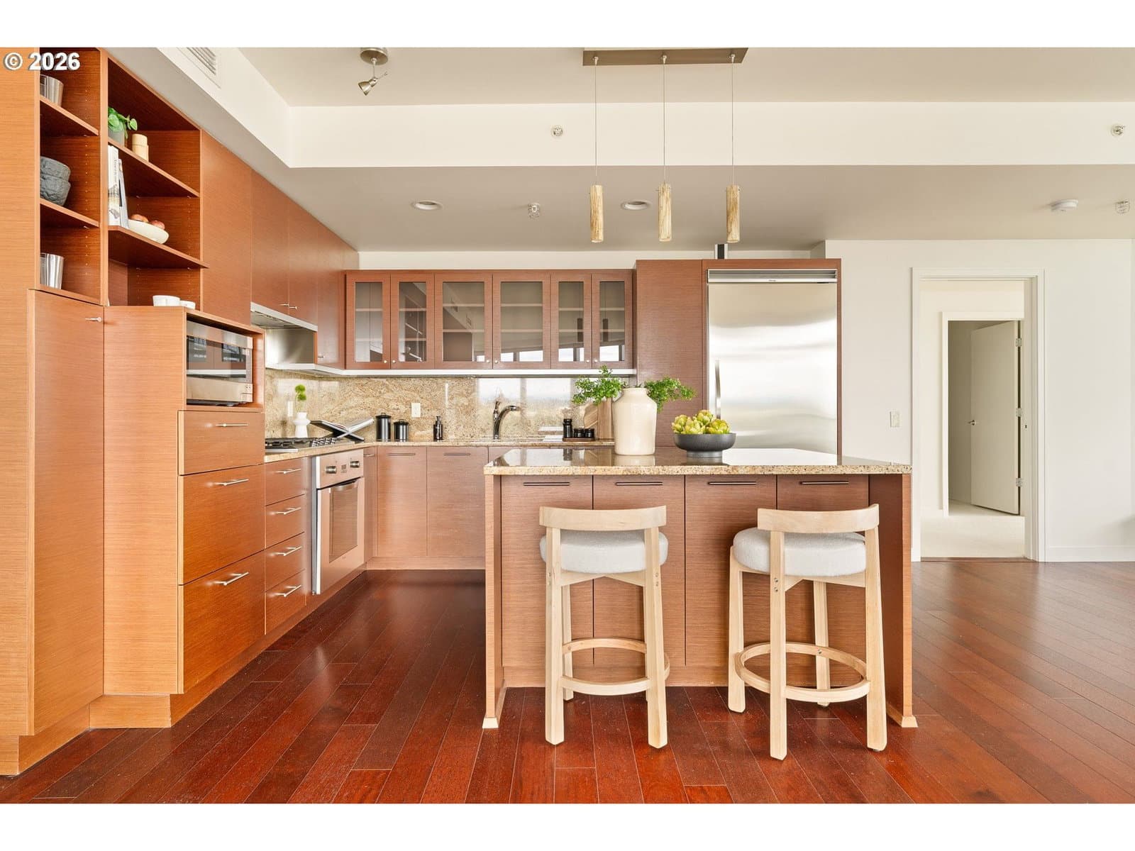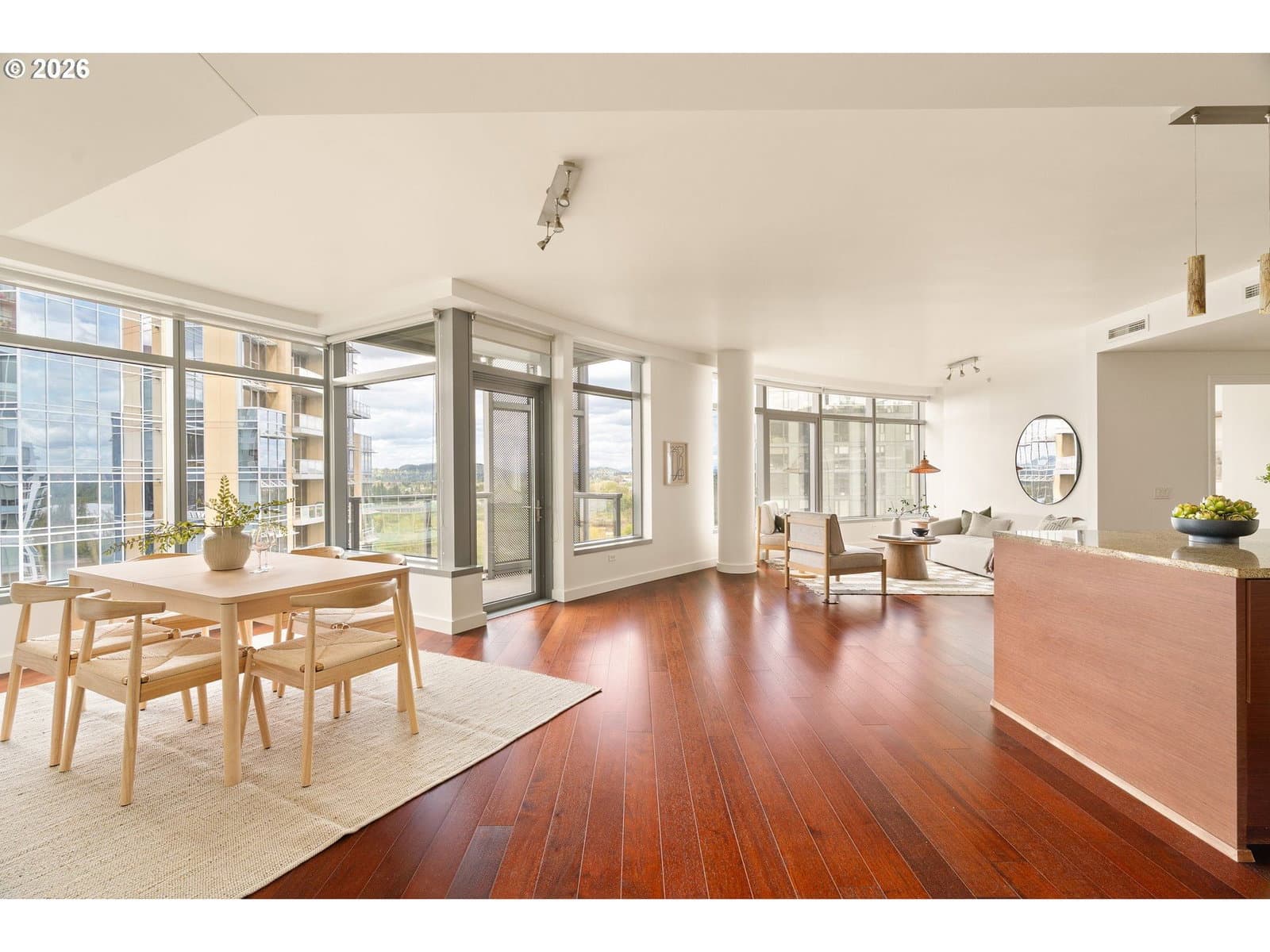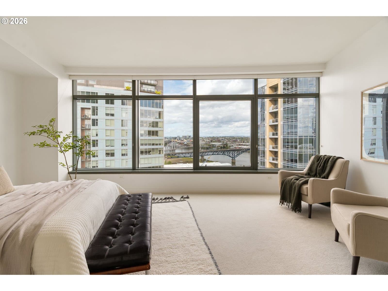 Panoramic views of the Willamette River, Mt St Helens, Mt Hood, Tilikum Bridge and more from the 21st floor at the iconic John Ross. This special home features a highly desirable floor plan with spacious open living, a grand primary suite with an upgraded marble bath and luxurious walk-in closet, and a separate 2nd bedroom/office with Murphy bed - all featuring wall to wall windows and amazing views from sunrise to sunset. The gourmet kitchen features upgraded penthouse level finishes including Viking appliances and abundant storage. In pristine condition with all new paint, and complete with 2 parking spaces. The John Ross features 24/7 concierge, and beautiful indoor and outdoor amenity spaces. Located in the beautiful South Waterfront, an urban oasis along the river with OHSU, tram, Streetcar, parks, trails, restaurants, fitness studios and more right out your front door.