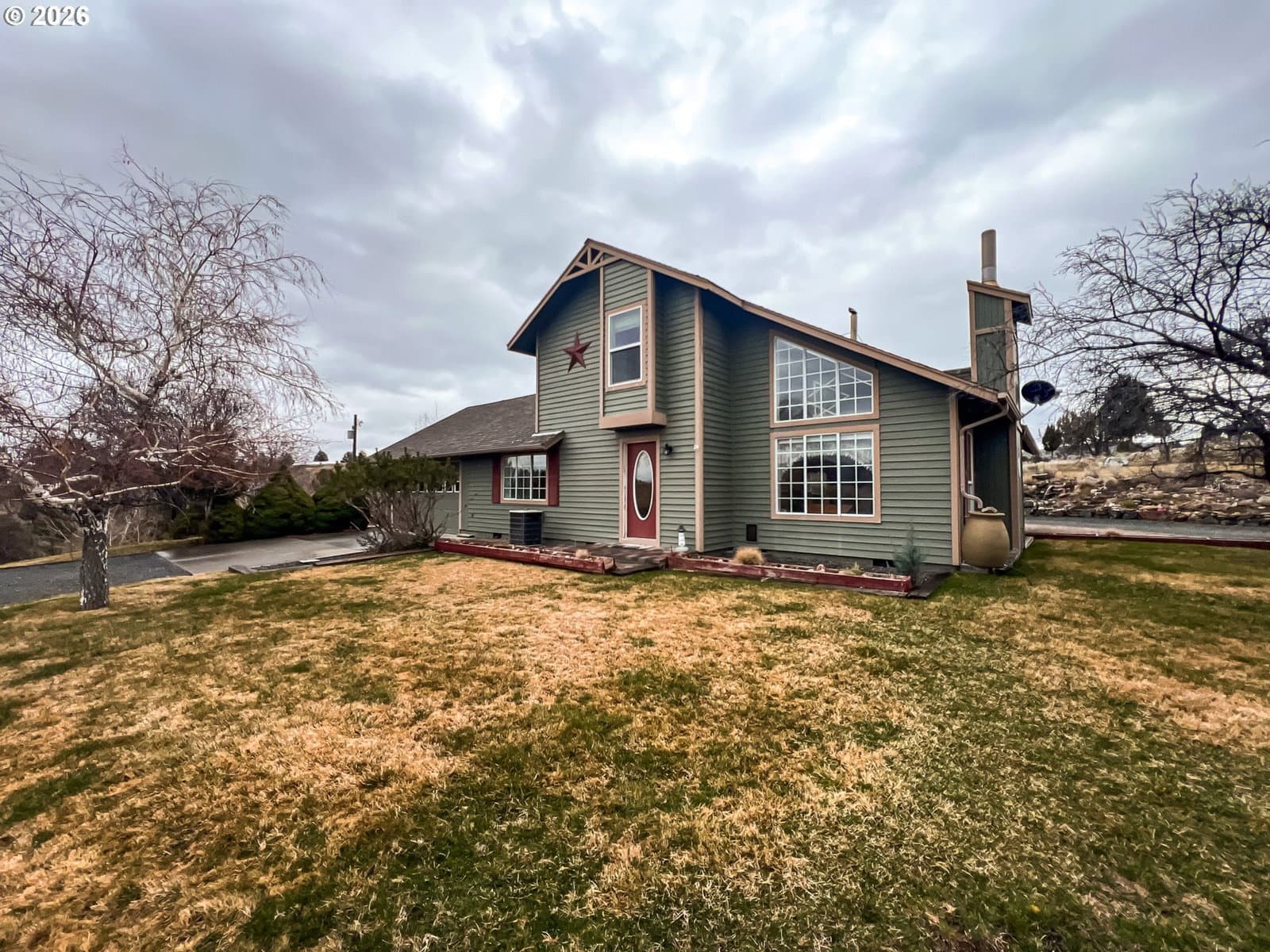 Enjoy wide open space and breathtaking 360° views from this 15.35± acre perimeter-fenced property featuring a 2,238 sq ft two-story home built in 1986. Watch incredible sunrises and sunsets from nearly every direction while enjoying the privacy and usability of your acreage.The kitchen offers an island with cooktop, wine storage, and generous counter space ideal for cooking or baking. There is also space to reinstall a traditional wood cookstove for added charm and functionality. The living room features a cozy woodstove and open sightlines to the kitchen and dining areas, creating a comfortable gathering space. A heat pump provides heating and cooling year-round.The primary suite is located on the second level and includes a walk-in closet and corner shower. On the main level you’ll find a 15’ x 12’ bedroom, a bathroom with walk-in shower, and a flexible room perfect for a home office or hobby space with a slider that opens onto the large paver patio.Outside, the property is set up for country living with a gated entry and circular gravel driveway. Relax in the private hot tub on the patio or enjoy the peaceful pond with waterfall feature.Outbuildings include a 504 sq ft attached garage with built-in shelving and workbench, a 768 sq ft barn for hay or livestock, a lean-to for additional covered storage, and a storage shed. Underground sprinklers, apple, cherry, pear & plum trees & an RV hookup is available.Shared well with a 2,000-gallon cistern.