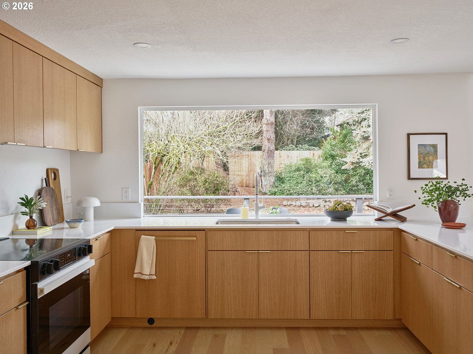 This one is straight out of Dwell Magazine. A truly special mid-century modern retreat that lives large, light, and effortlessly functional; all on one level. Vaulted ceilings stretch across the main living spaces, while multiple skylights wash the home in soft, natural light from morning to evening. New windows sharpen the clean lines and brighten every corner, making the entire home feel open, calm, and expansive.At the heart of it all is a thoughtfully updated kitchen, featuring custom white oak cabinetry, modern appliances, and a warm palette that pairs beautifully with the white oak engineered hardwood floors throughout. The layout is generous and intentional—every room feels oversized, from the wide living areas to the large bedrooms that offer space to breathe, work, rest, and truly settle in.The primary suite is impressively large, designed to feel like its own private wing. In the primary bath, designer tile, a spacious shower, and elevated finishes deliver a clean, spa-like experience that feels straight out of a design spread. A large laundry room and an oversized garage round out the home’s everyday practicality—without sacrificing style.Anchoring the living room is an original stone fireplace, a timeless nod to the home’s mid-century roots. And outside, the setting matches the interior vibe: a quiet, peaceful neighborhood that feels tucked away, yet connected.With a brand-new roof, curated updates, and design-forward details reminiscent of Herman Miller and Rejuvenation, this home is the rare combination of architectural charm and modern ease—ready to impress from the first step inside.