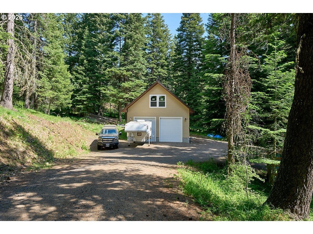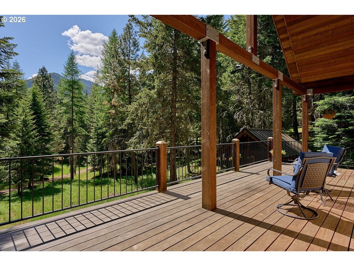 Turn-key primary home or ideal second home getaway on a private, forested 2-acre parcel with views of rugged mountains across the canyon. Enjoy frequent wildlife sightings, including mountain goats, and easy access to trailheads leading into the Eagle Cap Wilderness. Built in 2016, the home features vaulted ceilings, distressed hickory flooring, knotty alder cabinetry and doors, and a tiled entry with coat and boot area. The kitchen includes a KitchenAid refrigerator and propane range with vent hood, and quartz countertops.Outdoor living is exceptional with Cumaru hardwood decks, including a 10x8 covered BBQ deck off the kitchen, a 12x30 covered deck with mountain views, and a 6x8 covered upstairs balcony. The living room offers a tile hearth with a Hearthstone soapstone wood stove. Red oak stairs with custom wrought iron railing lead to a 618 SF loft with closet, eave storage, and covered balcony, ideal as a second bedroom or additional living space.The main level includes a spacious bathroom with 18” tile flooring, tub/shower, water closet, and a separate laundry room with storage, plumbed for a sink. The 936 SF shop features a concrete floor, 12’ ceilings, 10H x 9W door, full insulation, and a wide staircase to a finished 504 SF loft with windows for natural light and ventilation, perfect for storage, bunkhouse, or studio space. A 50-amp outlet is in place for a heater.Additional features include access to the underside of the home for ample storage, low-maintenance landscaping with a small lawn near the hot tub, and a structure ready to be finished as an outdoor kitchen. Fuel reduction has been completed on the beautiful wooded acreage. Community riverfront access, community water system with fire hydrants, and private septic.