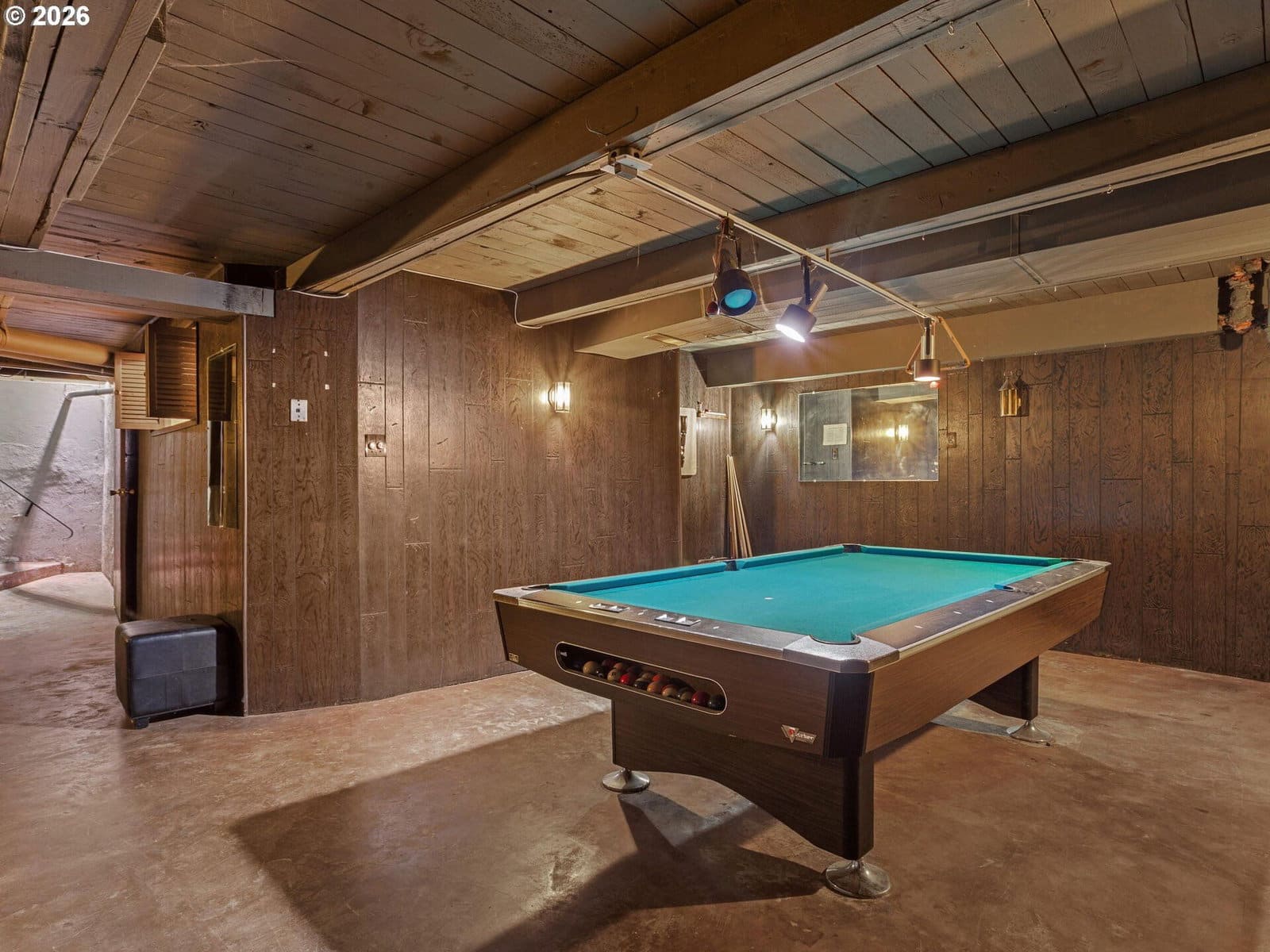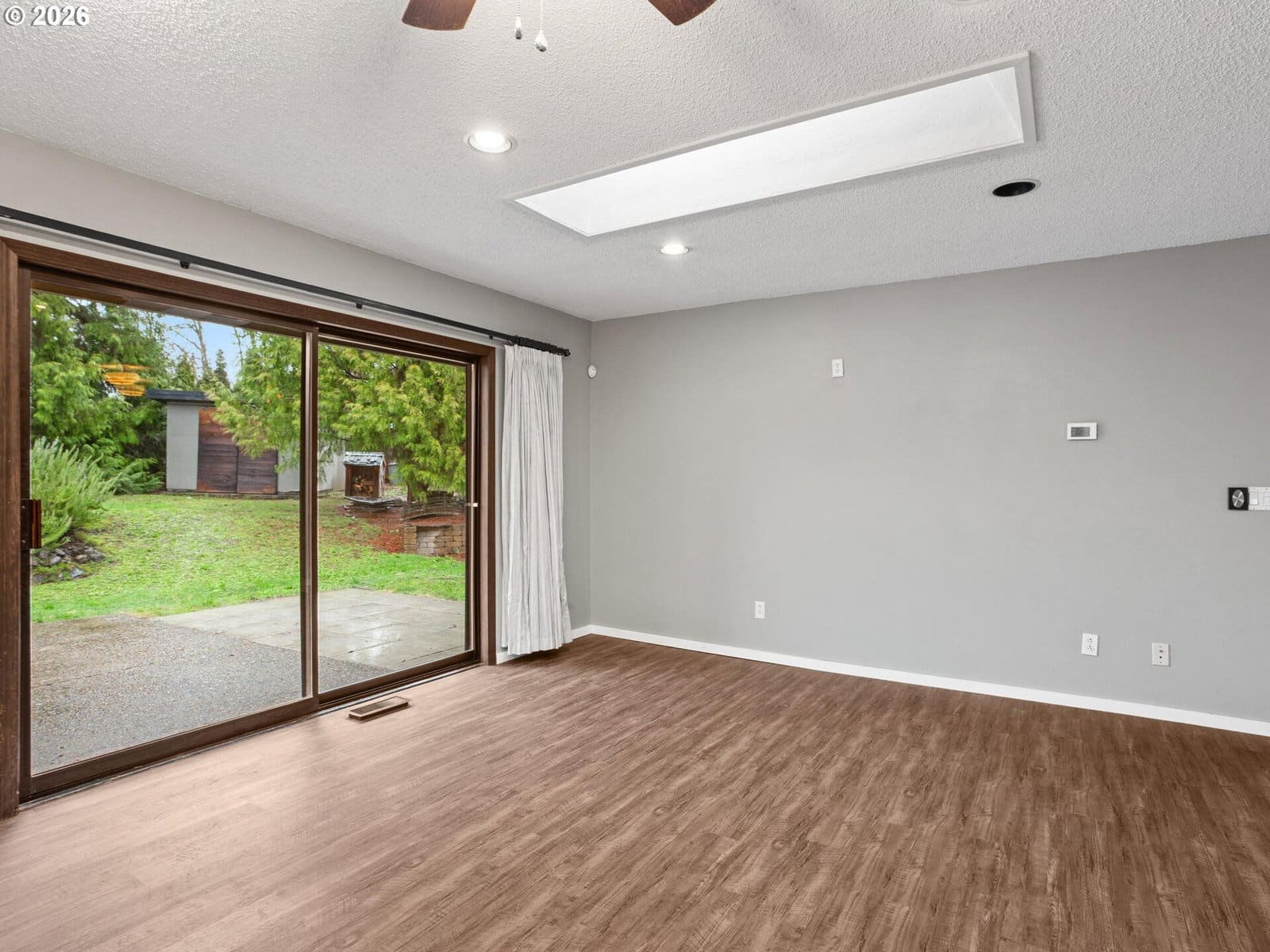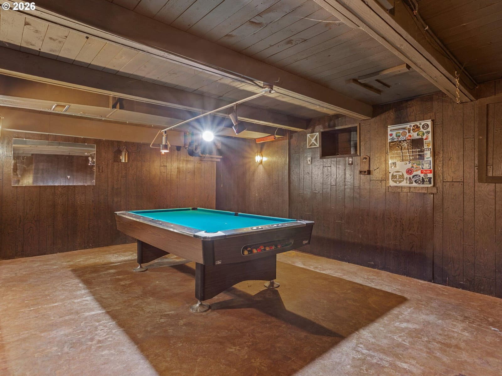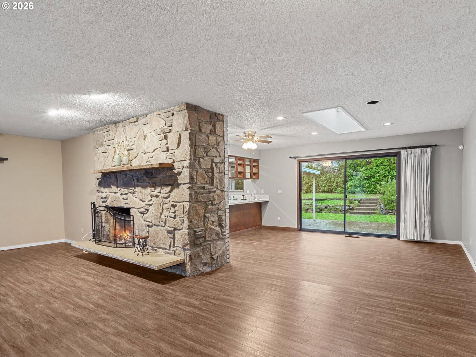 Mid-Century Modern Ranch Dream in Excellent Vermont Hills Location! Enter the hand scraped wood entry through oversized double doors, into this tastefully updated home, with thoughtful consideration to character and charm of mid-century living. Hand crafted wood paneled entry cove bench with area for shoe and coat storage, vinyl plank wood like floors throughout. Open living room with stately double sided brick fireplace, complete with large picture windows, overlooks the tree lined view of SW Portland. Spacious kitchen with plenty of storage and stainless steel appliances. Dining area with double doors leading to terraced backyard, garden beds, flat seating or possible firepit area, and hot tub pad with hookup. 3 full bedrooms, complete with primary suite and full updated bath with poured concrete countertops, custom overmount sink, and designer mirror and lighting. Patio door in primary leading to spacious and private backyard setting, with concrete pad, perfect for patio seating or a hot tub. Built-in shelving and desk in second bedroom. Oversized two car garage with additional workspace for hobbies and toys. Garage stairs lead down to finished storage area, perfect for hobbies, play, storage, or bring your imagination. Pool table included. New 25-year composition roof to be installed and included prior to closing. Open house Sunday, 01/11, from 11am - 1pm. [Home Energy Score = 5. HES Report at https://rpt.greenbuildingregistry.com/hes/OR10243343]